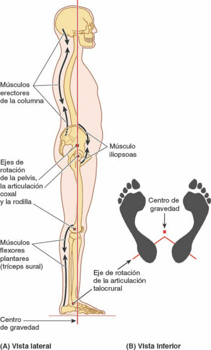 FIGURA 7-20. Bipedestación relajada. A) Relación de la línea de gravedad con los ejes de rotación de la pelvis y del miembro inferior en la posición de bipedestación relajada. Para mantener esta posición sólo se necesitan leves ajustes posturales, principalmente por los extensores del dorso y los flexores plantares del tobillo, porque los ligamentos de la cadera y de la rodilla están muy estirados para proporcionar un soporte pasivo. B) Durante la bipedestación relajada se forma una plataforma bipodal. El peso del cuerpo se distribuye de forma simétrica alrededor del centro de gravedad, que coincide en el tercio posterior de un plano medio entre los pies ligeramente separados y rotados lateralmente, anterior a los ejes de rotación de las articulaciones talocrurales. La fase de oscilación empieza tras el despegue, cuando los dedos se separan del suelo, y termina cuando el talón apoya sobre el suelo. La fase de oscilación ocupa 1276 https://booksmedicos.org https://booksmedicos.org booksmedicos.org Push Button0: