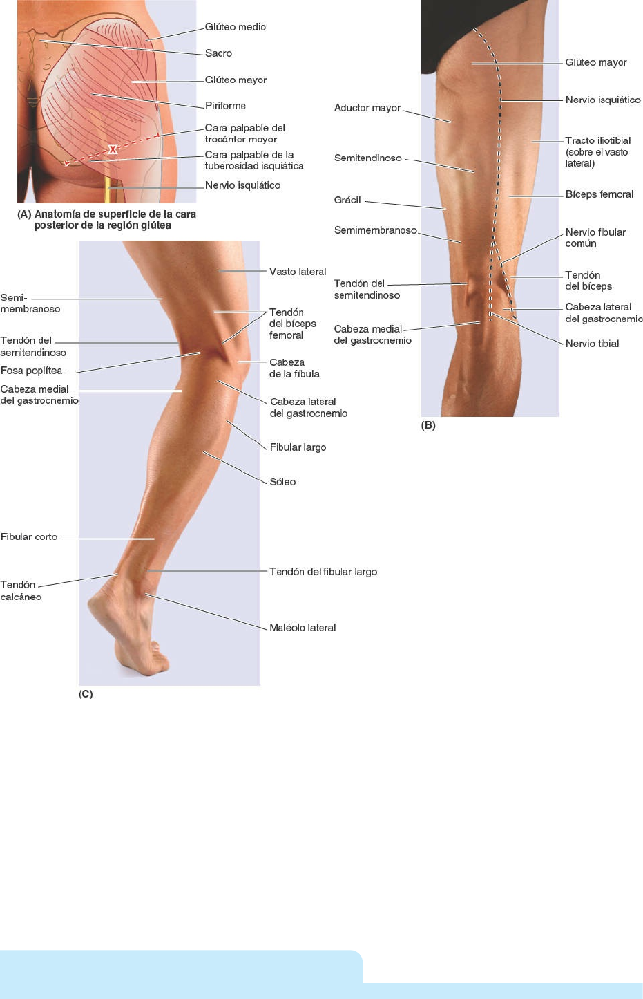 FIGURA 7-49. Anatomía de superficie de las regiones glútea y posterior del muslo. A) Proyección superficial del músculo piriforme y el nervio isquiático. B) Articulaciones coxales y de la rodilla en extensión, con tensión activa de los músculos, para proporcionar una mayor definición muscular. C) El peso lo soporta el miembro inferior derecho mientras las articulaciones coxales, de la rodilla y metatarsofalángicas se encuentran en flexión. Al sentarse en una silla con las rodillas flexionadas, si se oprimen los talones contra las patas de la silla y se palpa el tendón del bíceps femoral lateralmente, puede seguirse hasta la cabeza de la fíbula. Asimismo puede palparse medialmente el tendón del semitendinoso, estrecho y más prominente, que sobresale del tendón del semimembranoso que se inserta en la porción superomedial de la tibia. Véase «Lesiones de los músculos isquiotibiales» en el cuadro clínico que sigue. C U A D R O C L Í N I C O 1339 https://booksmedicos.org https://booksmedicos.org booksmedicos.org Push Button0: