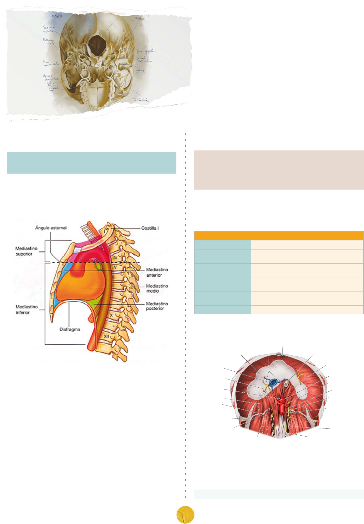 24 Orientación MIR Es importante que recuerdes las estructuras que ascienden y descienden por el diafragma. Para ello utiliza el resumen de la Tabla 5.1. El mediastino es una región anatómica situada en el centro del tórax, entre las dos cavidades pleurales. Se extiende desde el esternón a los cuerpos vertebrales y desde la abertura torácica superior hasta el diafragma. Está dividido en tres áreas (Figura 5.1): Figura 5.1. División anatómica del mediastino • Superior: las principales estructuras que pasan por el mediastino superior son; timo, venas braquiocefálicas derecha e izquierda, vena intercostal superior izquierda, vena cava superior, cayado de la aorta, tráquea, esófago, nervios frénicos, nervios vagos, rama laríngea recu- rrente del nervio vago izquierdo, conducto torácico. • Inferior: se divide en anterior, medio y posterior. - Anterior: contiene parte del timo, grasa, nódulos linfáticos, liga- mentos esternopericárdicos y vasos torácicos internos. - Medio: contiene el pericardio, el corazón, el origen de los gran- des vasos y pequeños vasos y nervios. - Posterior: las principales estructuras que atraviesan el medias- tino posterior son el esófago y su plexo nervioso asociado, la aorta torácica y sus ramas, las venas ácigos, el conducto torá- cico y los nódulos linfáticos asociados, los troncos simpáticos y los nervios esplácnicos torácicos. Recuerda ➔ La línea que divide el mediastino superior del mediastino inferior se corresponde en la pared anterior del tórax con el ángulo de Louis. Recordemos que esta importante referencia anatómica se ubica en la unión del segundo cartílago costal con el esternón. El diafragma es una estructura musculotendinosa delgada que ocupa la abertura torácica inferior y separa la cavidad torácica de la cavidad abdo- minal (Figura 5.2). Hay numerosas estructuras que lo atraviesan, las princi- pales se resumen en la Tabla 5.1: Estructura Lugar de paso Vena cava inferior Tendón central (a nivel de VIII vértebra torácica) Esófago Parte muscular, a la izquierda de la línea media (a nivel de X vértebra torácica) Nervio vago Parte muscular, a la izquierda de la línea media (a nivel de X vértebra torácica) Arteria aorta Detrás de las inserciones posteriores (a nivel de XII vértebra torácica) Conducto torácico Detrás de las inserciones posteriores (a nivel de XII vértebra torácica) Vena ácigos y hemiácigos Hiato aórtico o pilares del diafragma Tabla 5.1. Estructuras que atraviesan el diafragma Arteria y vela torácicas internas: nervio frénico izquierdo, ramo frenicoabdominal Hiato esofágico; esófago, troncos vagales anterior y posterior Nervio frénico izquierdo, ramo frenicoabdominal Venas frénicas inferiores Centro tendinoso Foramen de vena cava Nervio frénico directo, ramo frenicoabdominal Ligamento arqueado medial Pilar derecho del diafragma Ligamento arqueado lateral 12ª costilla Ligamento arqueado medial Proceso transverso, primera vértebra lumbar Arteria frénica inferior Nervio esplácnico mayor Vena hemiácigos Nervio esplácnico menor Hiato aórtico: parte abdominal de la aorta; ductus torácico Músculo cuadrado lumbar Músculo psoas mayor Tronco simpático Figura 5.2. Estructuras que atraviesan el diafragma Preguntas MIR ➔ No hay preguntas representativas. Mediastino y diafragma 05