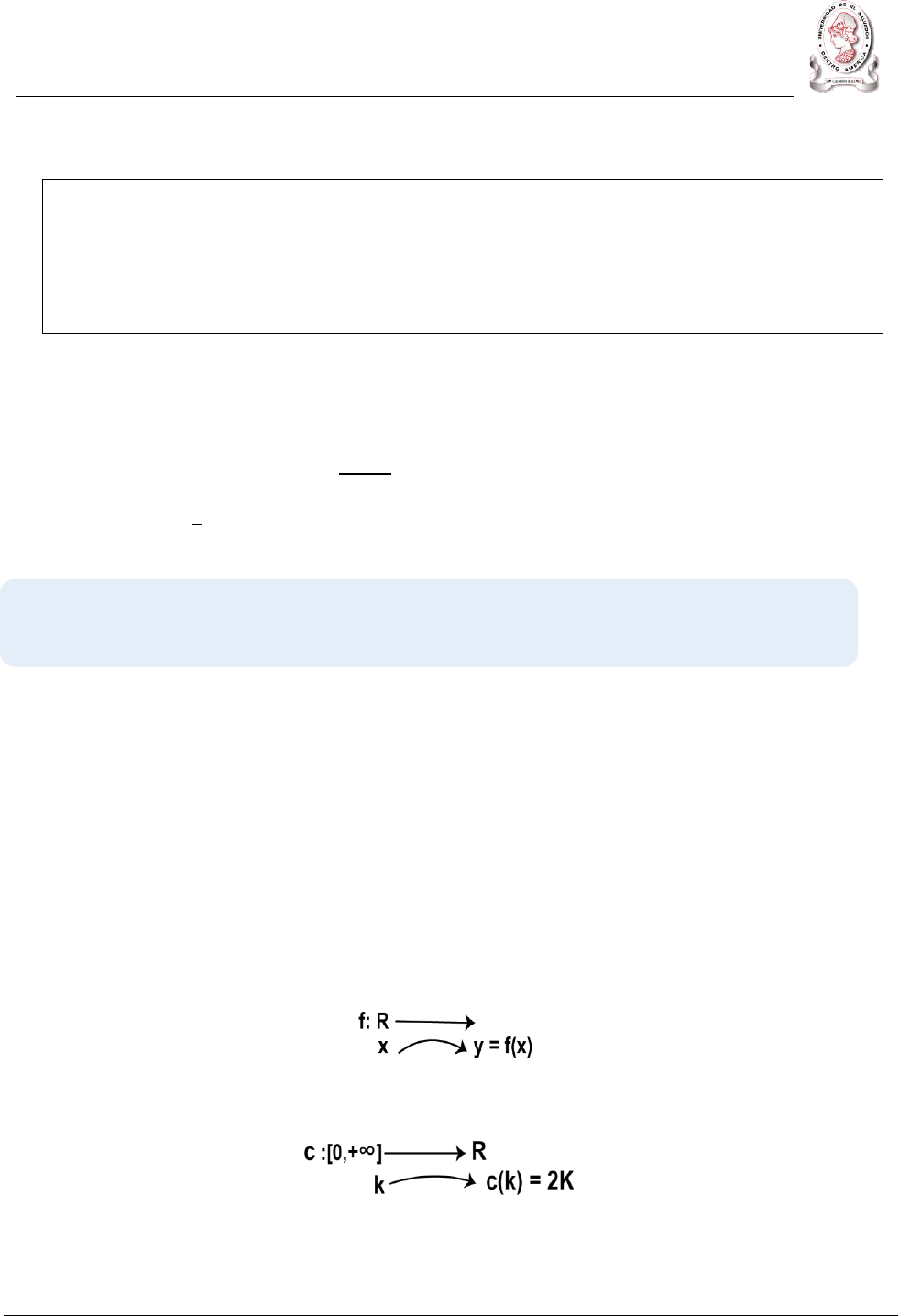 UNIVERSIDAD DE EL SALVADOR EN LÍNEA FACULTAD DE INGENIERÍA Y ARQUITECTURA MATEMÁTICA I Este material ha sido proporcionado al estudiante en el marco de su formación a través de una carrera en línea en la Universidad de El Salvador. Se han respetado los derechos de autor para su elaboración. El debido uso del mismo es responsabilidad del estudiante. NOTA: Estudiaremos solamente funciones reales de variable real. Es decir, funciones en donde el dominio son todos los reales o un intervalo. FUNCIONES De la definición podemos decir, que la regla que asigna (o regla de asignación) es una fórmula o ecuación matemática, por ejemplo: 𝑖) 𝒚 = 𝟐𝒙 𝑖𝑖) 𝒚 = √𝒙 + 𝟐 𝑖𝑖𝑖) 𝒄 = 𝟎. 𝟎𝟓𝒌 + 𝟏𝟎 𝑖𝑣) 𝒑 = 𝒆−𝟐𝒕 La expresión 𝒚 = ±√𝒙 no es función, ya que a todo elemento de los reales positivos le asigna 2 valores 1.1 VALOR DE UNA FUNCIÓN Sea 𝒇 una función, el número 𝒚 del contradominio o rango que corresponde a un número 𝒙 escogido en el dominio es el valor de la función para un elemento 𝒙 en A, o la imagen de 𝒙 en B; y se denota por 𝒇(𝒙) . Este símbolo se lee “𝒇 de 𝒙” o “𝒇 en 𝒙” y se expresa 𝒚 = 𝒇(𝒙). El valor de “y” depende de la elección de “x”, por lo que se le denomina variable dependiente; a “x” se le llama variable independiente. Una forma de representar una función es la siguiente: Así, por ejemplo Donde se entiende que esta función C, le asigna a todo número real "𝒌 ≥ 𝟎" un valor "𝒚 = 𝑪(𝒌) = 𝟐𝒌" en R Una función 𝒇 desde un conjunto A hacia un conjunto B es una regla que asigna a cada uno de los elementos, simbolizados por “x”, en el conjunto A y un elemento único “y” en B. El conjunto A se llama dominio de 𝒇 . El conjunto de elementos correspondiente “y” en B se denomina contradominio, recorrido o rango de 𝒇. UNIVERSIDAD DE EL SALVADOR EN LÍNEA FACULTAD DE INGENIERÍA Y ARQUITECTURA MATEMÁTICA I Este material ha sido proporcionado al estudiante en el marco de su formación a través de una carrera en línea en la Universidad de El Salvador. Se han respetado los derechos de autor para su elaboración. El debido uso del mismo es responsabilidad del estudiante. Es decir, a cada uno de los elementos del intervalo, simbolizados por k, le asignamos un valor 𝒚 = 𝑪(𝒌) igual al doble de los valores de k. Ejemplos: 𝑠𝑖 𝒌 = 𝟎, 𝑒𝑛𝑡𝑜𝑛𝑐𝑒𝑠 𝑪(𝟎) = 𝟐(𝟎) = 𝟎 𝑠𝑖 𝒌 = 𝟎. 𝟓, 𝑒𝑛𝑡𝑜𝑛𝑐𝑒𝑠 𝑪(𝟎. 𝟓) = 𝟐(𝟎. 𝟓) = 𝟏. 𝐸𝑙 𝑣𝑎𝑙𝑜𝑟 𝑑𝑒 𝑙𝑎 𝑓𝑢𝑛𝑐𝑖ó𝑛 𝑐𝑢𝑎𝑛𝑑𝑜 𝒌 = 𝟎. 𝟓 𝑒𝑠 2 𝑠𝑖 𝒌 = 𝟐, 𝑒𝑛𝑡𝑜𝑛𝑐𝑒𝑠 𝑪(𝟐) = 𝟐(𝟐) = 𝟒. 𝐸𝑙 𝑣𝑎𝑙𝑜𝑟 𝑑𝑒 𝑙𝑎 𝑓𝑢𝑛𝑐𝑖ó𝑛 𝑐𝑢𝑎𝑛𝑑𝑜 𝒌 = 𝟐 𝑒𝑠 4 𝑠𝑖 𝒌 = 𝟔, 𝑒𝑛𝑡𝑜𝑛𝑐𝑒𝑠 𝑪(𝟔) = 𝟐(𝟔) = 𝟏𝟐 Otros ejemplos de funciones: 1) 𝒇(𝒙) = 𝒙𝟐 + 𝟐𝒙 − 𝟓 Algunos valores de 𝒇. Cuando 𝒙 = −𝟑 𝒇(−𝟑) = (−𝟑)𝟐 + 𝟐(−𝟑) − 𝟓 = 𝟗 − 𝟔 − 𝟓 = −𝟐 Es decir, que cuando 𝒙 = −𝟑, el valor de la función es – 𝟐. Cuando 𝒙 = 𝟎 𝒇(𝟎) = (𝟎)𝟐 + 𝟐(𝟎) − 𝟓 = 𝟎 + 𝟎 − 𝟓 = −𝟓 Es decir, que cuando 𝒙 = 𝟎, el valor de la función es −𝟓. 2) 𝑻(𝒌) = 𝟎. 𝟎𝟓𝒌 + 𝟏𝟎, donde T: tarifa en dólares (variable dependiente) k: consumo mensual en Kilowatt/hora (variable independiente) La tarifa T depende del consumo mensual k. 3) Si A: área de un triángulo en cm2 UNIVERSIDAD DE EL SALVADOR EN LÍNEA FACULTAD DE INGENIERÍA Y ARQUITECTURA MATEMÁTICA I Este material ha sido proporcionado al estudiante en el marco de su formación a través de una carrera en línea en la Universidad de El Salvador. Se han respetado los derechos de autor para su elaboración. El debido uso del mismo es responsabilidad del estudiante. NOTA: En esta asignatura trabajaremos solamente con funciones de una sola variable independiente. b: base de un triángulo en cm h: altura de un triángulo en cm 𝑨(𝒃, 𝒉) = 𝒃𝒉 𝟐 Esta regla de asignación corresponde a una función de 2 variables independientes (El área depende de la base b y de la altura h).