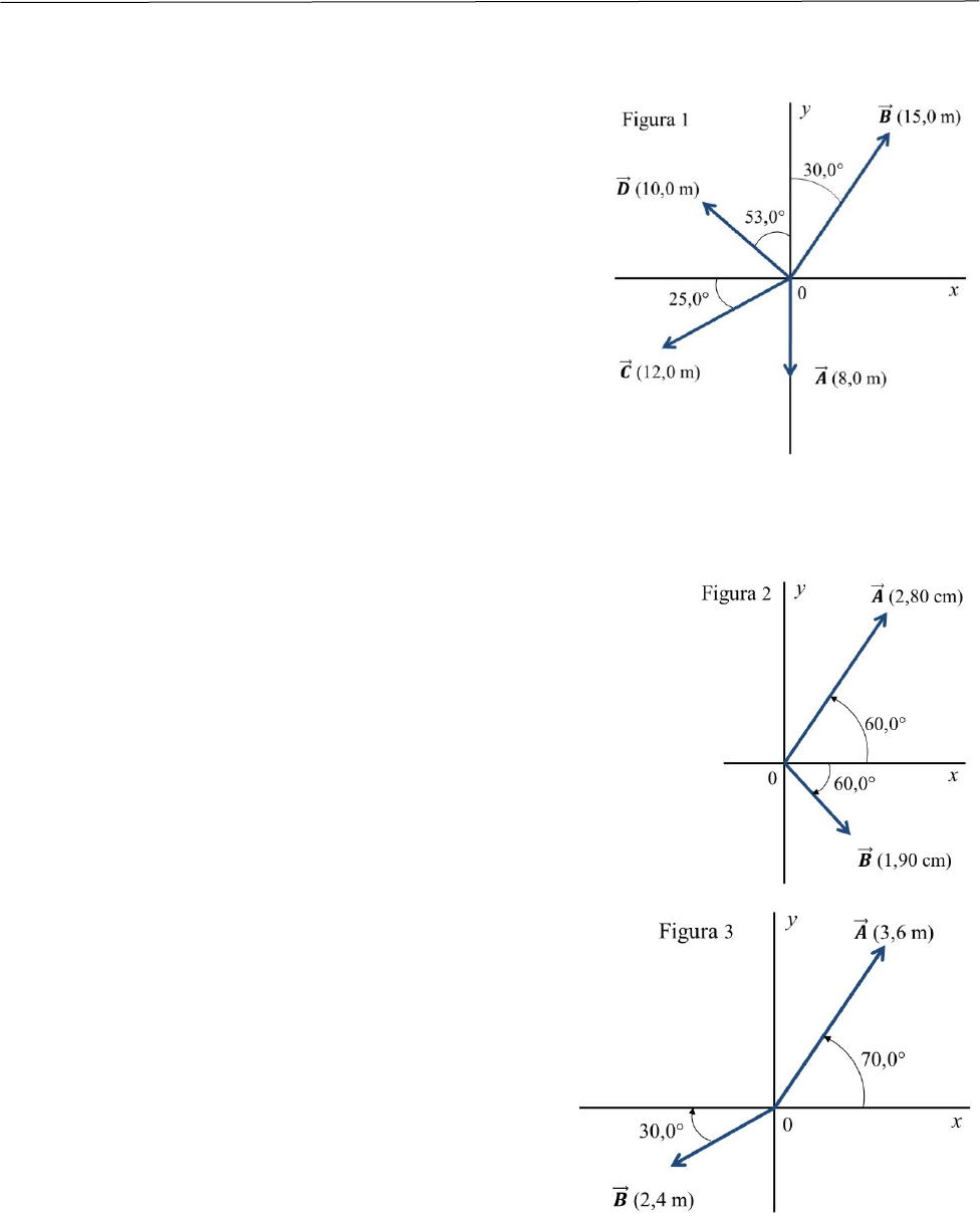 Universidad de Buenos Aires – Programa UBA XXI Física Práctica de la Unidad N° 1 1) Con los vectores 𝑨""⃗ y 𝑩""⃗ de la figura 1, use un dibujo a escala para obtener la magnitud y la dirección de: a) La suma vectorial de 𝑨""⃗ + 𝑩""⃗ y la diferencia 𝑨""⃗ – 𝑩""⃗ . b) Con base en sus respuestas, determine la magnitud y la dirección de: - 𝑨""⃗ – 𝑩""⃗ y 𝑩""⃗ – 𝑨""⃗ 2) Calcule las componentes x e y de los vectores 𝑨""⃗ ,𝑩""⃗ ,𝑪""⃗ y 𝑫""⃗ de la figura 1. 3) Para los vectores 𝑨""⃗ , 𝑩""⃗ y 𝑪""⃗ de la figura 1, obtenga los productos escalares. a) 𝑨""⃗ · 𝑩""⃗ b) 𝑩""⃗ · 𝑪""⃗ c) 𝑨""⃗ · 𝑪""⃗ 4) Para los vectores 𝑨""⃗ y 𝑫""⃗ de la figura 1 a) Obtenga la magnitud y la dirección del producto vectorial 𝑨""⃗ x 𝑫""⃗ . b) Calcule la magnitud y la dirección de 𝑫""⃗ x 𝑨""⃗ . 5) El vector 𝑨""⃗ mide 2,80 cm y está 60,0º sobre el eje x en el primer cuadrante. El vector 𝑩""⃗ mide 1,90 cm y está 60,0º bajo el eje x en el cuarto cuadrante de figura 2. Utilice las componentes para obtener la magnitud y la dirección de: a) 𝑨""⃗ + 𝑩""⃗ b) 𝑨""⃗ - 𝑩""⃗ c) 𝑩""⃗ - 𝑨""⃗ . En cada caso, dibuje la suma o resta de vectores, y demuestre que sus respuestas numéricas concuerdan cualitativamente con el dibujo. 6) a) Escriba cada uno de los vectores de la figura 3 en términos de los vectores unitarios î y ĵ. b) Utilice vectores unitarios para expresar el vector 𝑪""⃗ , donde 𝑪""⃗ = 3,00 𝑨""⃗ - 4,00 𝑩""⃗ . c) Determine la magnitud y la dirección de 𝑪""⃗ . 7) El vector 𝑨""⃗ , tiene una componente y Ay= +13,0 m. 𝑨""⃗ tiene un ángulo de 32,0º en sentido antihorario a partir del eje +y. a) ¿Cuál es la componente x de 𝑨""⃗ ? b) ¿Cuál es la magnitud de 𝑨""⃗ ? 8) Calcule el ángulo entre estos pares de vectores: a) 𝑨""⃗ = -2,00î + 6,00 ĵ y 𝑩""⃗ = 2,00î + 3,00 ĵ b) 𝑨""⃗ = 3,00î + 5,00 ĵ y 𝑩""⃗ = 10,00î + 6,00 ĵ c) 𝑨""⃗ = -4,00î + 2,00 ĵ y 𝑩""⃗ = 7,00î + 14,00 ĵ Universidad de Buenos Aires – Programa UBA XXI Física 9) Tres cuerdas horizontales tiran de una piedra grande enterrada en el suelo, produciendo los vectores de fuerza 𝑨""⃗ , 𝑩""⃗ y 𝑪""⃗ que se ilustra en la figura 4. Obtenga la magnitud y la dirección de una cuarta fuerza aplicada a la piedra que haga que la suma vectorial de las cuatro fuerzas sea cero. Respuestas: 1) a) 9,00 m, 33,6º; 22,3 m, 250º b) 9,00 m, 214º; 22,3 m, 70,0º 2) Ax = 0,00 m; Ay = -8,00 m Bx = 7,50 m; By = 13,0 m Cx = -10,9 m; Cy = -5,07 m Dx = -7,99 m; Dy = 6,02 m 3) a) -104 m2 b) -147 m2 c) 40,6 m2 4) a) -63,9 𝑘) a) 63,9 𝑘) 5) a) 2,48 cm; 18,4° b) 4,09 cm; 83,7° c) 4,09 cm; 264° 6) a) 𝑨""⃗ = (1,23 m)î + (3,38 m)ĵ; 𝑩""⃗ = (-2,08 m)î + (-1,20 m)ĵ b) 𝑪""⃗ = (12,0 m)î + (14,9 m)ĵ c) 19,2 m; 51,2° 7) a) -8,12 m b) 15,3 m 8) a) 52,1° b) 28,0° c) 90’0° 9) 90,2 N, 256º