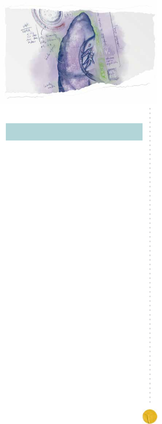 4 Orientación MIR En el MIR este tema tiene una creciente importancia, es primordial conocer la auscultación en las diferentes patologías y las técnicas exploratorias básicas. 2.1. Historia clínica Los síntomas cardinales de enfermedad respiratoria son: • Tos. Puede ser seca o productiva si se acompaña de producción de esputo, en cuyo caso se debe interrogar por las características del mismo. La tos seca se divide atendiendo a su duración en: - Aguda. Dura menos de 3 semanas, suele asociarse a un evento agudo fácilmente identificable como infección respiratoria, inha- lación de humos o tóxicos, o aspiración de cuerpo extraño. - Subaguda. Dura entre 3 y 8 semanas y habitualmente es la secuela de una traqueobronquitis vírica; es lo que se conoce como síndrome posviral o hiperreactividad bronquial transitoria postinfecciosa. - Crónica. Persiste más allá de 8 semanas. En este caso el diag- nóstico incluye diferentes enfermedades respiratorias, car- diovasculares o infecciosas. Se debe prestar atención a los desencadenantes de tos. La radiografía de tórax separa dos grupos de pacientes en función de si es patológica (según el hallazgo se orientará el diagnóstico –neopla- sia, atelectasia, enfermedad intersticial…–) o normal (donde las cau- sas de tos son escasas: goteo posnasal; asma, en el caso de que el asma se manifieste sólo por tos se llama equivalente asmático; enfer- medad por reflujo gastroesofágico o tos secundaria a tratamiento con fármacos inhibidores de la enzima convertidora de angiotensina). • Hemoptisis. Es la expectoración de sangre procedente del aparato res- piratorio. Puede provenir de cualquier lugar entre la glotis y los alvéolos, aunque es importante distinguirla de la epistaxis o de la hematemesis. Las causas son diversas. A nivel mundial la más frecuente es infec- ciosa, por tuberculosis o secuelas de la misma como bronquiectasias (MIR 13-14, 136); se puede originar en neumonías necrotizantes, abs- cesos, neumonías, bronquitis o exacerbación de bronquitis crónica; en nuestro medio, sin embargo, la causa más frecuente es el carci- noma broncogénico, sobre todo si es un tumor central. Otras posibles causas son el tromboembolismo pulmonar, la diátesis hemorrágica y el más infrecuente sangrado alveolar, que se debe sospechar si apa- rece la tríada hemoptisis, anemia (el hallazgo más constante) e infil- trados pulmonares. Es raro que la hemoptisis que procede de vía aérea cause anemia. En función de la cuantía, se llama hemoptisis masiva a la expectoración de 150 ml de sangre en 1 h o 600 ml en 24 h. Hoy día se prefiere el término de hemoptisis amenazante, que se define como aquélla que pone en riesgo la vida del paciente, y depende del volumen del sangrado, la velocidad del mismo y la reserva cardiopulmonar del paciente; son indicadores de riesgo el sangrado superior a 100 ml, la obstrucción de la vía aérea, la insuficiencia respiratoria o la inestabili- dad hemodinámica. En este caso se debe prestar especial atención al mantenimiento de la permeabilidad de la vía aérea. • Dolor torácico. Dado que el pulmón carece de terminaciones nervio- sas para el dolor, la presencia de dolor torácico indica la afectación de otras estructuras, como la pleura, la pared torácica o el mediastino. El dolor de carácter pleurítico es el que aumenta con los movimientos respiratorios, especialmente con la inspiración profunda y con la tos. La afectación de la pleura diafragmática puede producir dolor referido al hombro o a la pared anterior del abdomen. El dolor sordo, continuo, sugiere afectación de pared torácica o del mediastino. • Disnea. Definida como vivencia subjetiva de dificultad para respirar, se produce cuando se da un disbalance entre las necesidades per- cibidas para respirar y el resultado que el sistema cardiocirculatorio aporta para cubrir esas necesidades. La descripción de la disnea por parte del paciente puede aportar pistas sobre su etiología: - Disnea con opresión precordial: broncoconstricción, isquemia miocárdica. - Esfuerzo respiratorio, respiración trabajosa: obstrucción de vías respiratorias, enfermedad neuromuscular. - Sed de aire, urgencia para respirar: insuficiencia cardíaca, embolia pulmonar, obstrucción grave al flujo aéreo. - Imposibilidad de llenar el pecho de aire: restricción parenqui- matosa (fibrosis pulmonar) o extraparenquimatosa (enfermeda- des de la caja torácica). - Respiración pesada, rápida o acelerada: mala condición física. - Disnea sin alteraciones cardiovasculares ni respiratorias: puede darse en la anemia, la obesidad o las alteraciones de la función tiroidea. • Sibilancias. Sonidos agudos, de timbre musical, generalmente más intensos durante la espiración, que se asocian a disnea y traducen obstrucción de las vías aéreas intratorácicas y, en ocasiones, se escu- chan sin necesidad de fonendoscopio. • Estridor. Al contrario que los anteriores, es un sonido ronco, inspi- ratorio, casi siempre originado en la vía aérea superior extratorácica (laringe o porción extratorácica de la tráquea) (MIR 12-13, 56). • Acropaquias (dedos en palillo de tambor). Constituyen un engro- samiento de las falanges distales de las manos y los pies, debido a la proliferación del tejido conjuntivo. Se relacionan en un 75-80% de las veces con las enfermedades pulmonares (Tabla 2.1). • Osteoartropatía hipertrófica. Es un síndrome clinicorradiológico caracterizado por proliferación periostática de los huesos largos y, a menudo, cursa con artralgias o artritis. Síntomas cardinales y exploración del aparato respiratorio 02 5 02. Síntomas cardinales y exploración del aparato respiratorio. NM Causas de acropaquias Enfermedad pulmonar (75-80%) • Carcinoma broncogénico (MIR 15-16, 125) • Mesotelioma • Infecciones crónicas, tuberculosis, bronquiectasias, abscesos, empiema • EPOC, fibrosis pulmonar • Lesiones mediastínicas Hipertiro