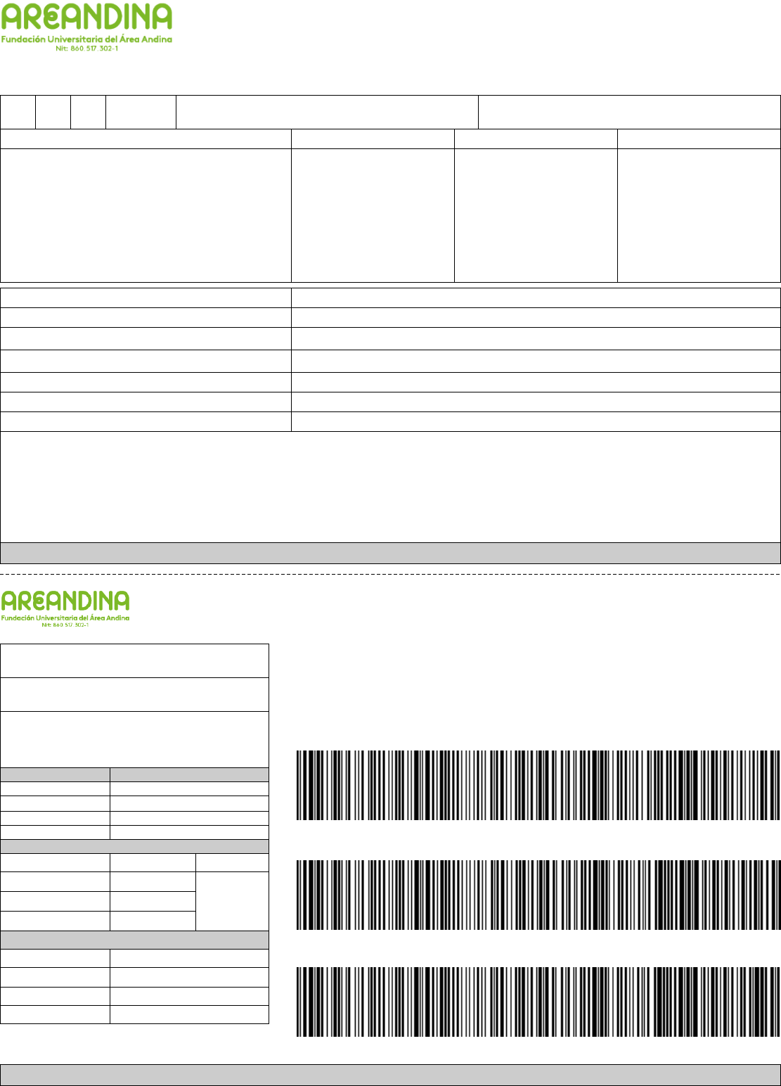 MZ 6 TORRE T APTO 303 NANDO INGENIERÍA CIVIL Matrícula General RECIBO DE MATRÍCULA No. 215-046744ROBINSON JOSE ACUÑA TORRES 56788966 VALLEDUPAR PREGRADO AÑO 2020 MES 06 30 20203 20201004830B ROBINSON JOSE ACUÑA TORRES DÍA PERIODO ESTUDIANTE RESPONSABLE TI 1005661235 ROBINSON JOSE ACUÑA TORRES CONCEPTO BASE DE CÁLCULO UNIDADES VALOR MATRICULA ORDINARIA DERECHOS COMPLEMENTARIOS - SERVICIO MÉDICO ASISTENCIAL INCENTIVO AREANDINA PRESENCIAL 20% VALOR A PAGAR 4,530,000.00 109,000.00 906,000.00 4,639,000.00 1.00 % 1.00 1.00 1.00 PESOS 4,530,000.00 109,000.00 906,000.00 3,733,000.00 TOTAL LIQUIDACIÓN HAST 3,733,000.00 N° CHEQUES RECARGO POR PLAZO TOTAL A PAGAR HASTA RECARGO POR EXTEMPORÁNEO TOTAL A PAGAR HASTA 20200710 20200724 20200731 Una vez realizado el pago de esta matrícula se adquiere la calidad de estudiante y se aceptan las condiciones académicas y financieras establecidas por la Fundación Universitaria del Area Andina. Para efectos de pago de matricula con cheque, se recibirán únicamente cheques de gerencia girados a nombre de Fundación Universitaria del Área Andina. "EL INGLÉS ES UN REQUISITO DE GRADO PARA PREGRADO; EL BILINGÜISMO, ES UN COMPROMISO DE TODOS" Te invitamos a realizar tu pago por PSE, encontrarás mayor información en la siguiente ruta: 1.Ingresa a la pagina oficial de AREANDINA www.areandina.edu.co 2.Luego dirígete a la pestaña Aspirantes, click en Financiación y sigue los pasos del instructivo para Pagos PSE 3,733,000.00 4,639,000.00 4,639,000.00 RECIBO DE MATRÍCULA No. 215-046744 20200731 20200724 Matrícula General - PREGRADO DOCUMENTO PARA EL ESTUDIANTE RELACIÓN DE CHEQUES 20200724 TOTAL A PAGAR TI 1005661235 ROBINSON JOSE ACUÑA TORRES 20200710 HAST VALOR 4,639,000.00 HAST 20200710 BANCO BOGOTA, Davivienda EFECTIVO ESTUDIANTE CH DE ESTE BCO RESPONSABLE REALICE EL PAGO EN: C. BCO. 20201004830B ROBINSON JOSE ACUÑA TORRES CH DE OTRO BCO 20200731 FECHA 4,639,000.00 TOTAL A PAGAR (415)7707200113082(8020)001005661235215046744000(3900)03733000(96)20200710 (415)7707200113082(8020)001005661235215046744000(3900)04639000(96)20200724 (415)7707200113082(8020)001005661235215046744000(3900)04639000(96)20200731 DOCUMENTO PARA EL BANCO TOTAL A PAGAR HASTA 3,733,000.00
