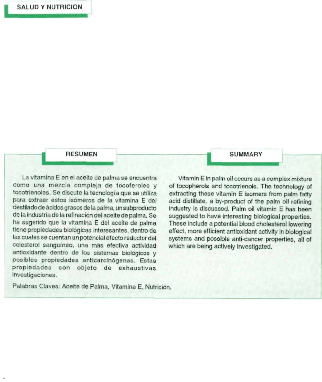 La vitamina E del aceite de palma: Su extracción y propiedades nutricionales* Vitamin E from palm oil: Its extraction and nutritional properties KAL YANA SUNDRAM; ABDUL GAPOR MD. TOP 1 INTRODUCCION La vitamina E es una vitamina liposoluble que comprende dos principales series homólogas de compuestos ( tococromanoles) , conocidos como tocoferoles y tocotrienoles. Estructuralmente, los tocoferoles se caracterizan por tener una cadena lateral saturada en el anillo crománico, mientras que los tocotrienoles poseen una cadena lateral fitílica insaturada. En la naturaleza se conocen cuatro homólogos de cada tipo (Fig. 1), los cuales tienen diferentes niveles de actividades antioxidantes y de vitamina E. Los aceites vegetales, especialmente los de semilla, son fuentes ricas en tocoferoles. Tradicionalmente, la vitamina E se ha extraído de los residuos de la refinación Tomado de: Lipid Technology (Inglaterra) v. 4 no. 6, p. 137-141. 1992 Palm Oil Research Instituto of Malaysia - PORIM. P.O. Box 10620, 50720 Kuala Lumpur, Malaysia. Palmas, Volumen 15, No. 1, 1994 77 1. Figura 1. Estructura química de los tocoferoles y tocotrienoles (se encontró que el o.-tocoferol, y losa -, y- y 5-tocotrienoles son los principales homólogos en el aceite de palma). del aceite de soya. Por otra parte, los tocotrienoles se encuentran principalmente en el aceite de palma y los aceites de cereales, como el de cebada y el de salvado de arroz. Dado que el aceite de palma se ha convertido en el segundo aceite comestible en el mercado mundial, se han hecho avances tecnológicos encaminados a extraer tocotrienoles del aceite de palma y, en un futuro, hacerlos comercialmente accequibles. CONTENIDO DE VITAMINA E DE LOS PRODUCTOS DE ACEITE DE PALMA El contenido de vitamina E en aceite crudo de palma oscila entre 600 y 1.000 partes por millón (ppm) y es una mezcla de tocoferoles (18-22%) y tocotrienoles (78- 82%). Los principales tocotrienoles que se presentan en el aceite de palma son el a-tocotrienol (22%), el y- tocotrienol (46%) y el 8-tocotrienol (12%). El contenido de vitamina E del aceite de palma parcialmente se pierde durante el procesamiento. Por ejemplo, se ha registrado que el aceite de palma, la oleína de palma y la estearina de palma refinados, b lanqueados y desodor i zados (RBD) ret ienen aproximadamente el 69, 72 y 76% del nivel original de vitamina E de los aceites crudos, respectivamente. No obstante, hay una gran variación en estos estimativos dentro de la industria de refinación debido a las diferencias 78 Palmas, Volumen 15, No. 1, 1994 en las condiciones de las plantas, así también como en el diseño de las mismas, que también incide en la cantidad de vitamina E que se pierde durante la refinación (Gapor 1989). El fraccionamiento del aceite de palma en una fracción liquida (oleína) y una fracción sólida (estearina) normalmente se realiza con aceite crudo de palma o con aceite RBD. Se ha observado que la vitamina E tiende a separarse preferencialmente hacia la fracción de oleína durante el fraccionamiento del aceite de palma RBD. Por ejemplo, las concentraciones de vitamina E en la oleína de palma RBD y en la estearina de palma RBD fueron de 104-135% y de 58-75%, respectivamente, sobre la base del nivel original de vitamina E en el aceite de palma RBD. La pérdidas se presentan principalmente en la etapa de desacidificación durante el proceso de refinación del aceite de palma y éstas se pueden minimizar incorporando una bandeja cribosa o una pre-despojadora de columna empacada al proceso tradicional de refinación. Por consiguiente, la vitamina E que se pierde durante el proceso se concentra en el destilado de ácidos grasos de palma (DAGP), uno de los subproductos de la refinación física del aceite de palma (Gapor et al. 1985). Se ha establecido que el DAGP se ha indentificado como una buena fuente de materia prima para la recuperación de vitamina E. Además, el DAGP es relativamente barato y se consigue fácilmente en la industria de la refinación. CARACTERISTICAS DEL DESTILADO DE ACIDOS GRASOS DE PALMA El aceite crudo de palma producido en Malasia se distribuye a las refinerías con un contenido máximo de ácidos grasos libres (AGL) del 5%, pero como resultado de la preocupación por la calidad entre las plantas extractoras, el aceite crudo suele llegar a las refinerías con un contenido de acidez de 3,5-3,7%. Sobre la base de este contenido de acidez y una producción estimada en 6,2 millones de toneladas de aceite de palma en Malasia, para 1992 se espera que se producirán aproximadamente 230.000 toneladas de DAGP. El contenido de vitamina E del DAGP se calcula en 0,4% (peso/peso). Por lo tanto, en 1992 y sobre la base de 230.000 toneladas de DAGP como materia prima, teóricamente se podrían producir 920 toneladas de vitamina E de palma. Mediante el análisis de laboratorio del DAGP obtenido de la refinación del aceite crudo de palma, de la oleína de palma y de la estearina de palma se demostró que estos contenían, en promedio, 5.252, 6.895 y 4.235 ppm de vitamina E, respectivamente. ANALISIS DE LA VITAMINA E DE PALMA A nivel de laboratorio, el análisis de la vitamina E de palma generalmente requiere un sistema de cromatografía líquida de alto rendimiento (HPLC), al cual se acoplan un detector de fluorescencia y un integrador (veáse Lipid Technology v. 4 no. 6, p. 143-145). Normalmente, las muestras se toman en hexano, y en una columna de sílice se inyecta una muestra de 5- 20 litros. Una mezcla de hexano e isopropanol (100:0,5 v/v) se emplea como solvente de elusión en un sistema ¡socrático con una tasa de flujo aproximada de 2 ml/min. La vitamina E de palma se detecta con un detector de fluorescencia a una longitud de onda de excitación de 295 nm y una longitud de onda de emisión de 325 nm. La Figura 2 ilustra un típico cromatograma del HPLC de la vitamina E que se encuentra en el aceite de palma. Las muestras elusionadas por HPLC se pueden caracter 