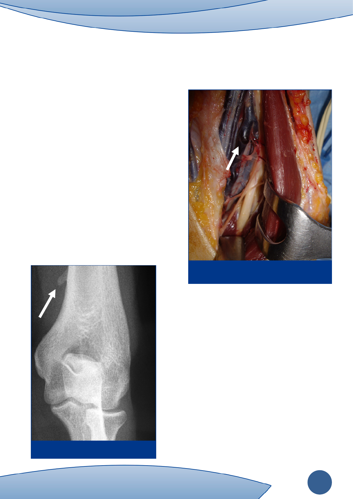 CAPÍTULO 108 - PATOLOGÍA PARTES BLANDAS (CODO DE TENISTA, RIGIDEZ…) Autores: Adrián Cuéllar Ayestarán, Xabier Foruria Zarandona Coordinador: Oskar Saez de Ugarte Sobrón Hospital de Galdakano (Bilbao) 1.- NERVIO MEDIANO Recuerdo anatómico: El nervio mediano tras pasar entre el músculo braquial anterior y el septum intermuscular medial pasa por la fosa antecubital y bajo la aponeurosis bicipital (lacertus fibrosus). Antes de pasar entre los fascículos superficial y profundo del pronador redondo o posterior al pronador redondo salen ramas hacia el palmar menor, palmar mayor, flexor superficial de los dedos y a veces al flexor profundo de los dedos. Tras pasar el pronador redondo se coloca profundo al arco fibroso del flexor superficial de los dedos. 1.1. Síndrome del músculo pronador redondo Se trata de la compresión del nervio mediano en el codo o en la zona proximal del antebrazo, provocando clínica sensitiva o mixta. Las posibles zonas de compresión son la apófisis de Struthers (supracondílea en la zona antero medial del húmero distal) (Figura 1), el ligamento de Struthers (banda fibrosa entre la apófisis y la epitróclea), la expansión aponeurótica del bíceps sobre la musculatura flexopronadora, el arco fibroso entre las cabezas humeral y cubital del pronador redondo (Figura 2), o el arco fibroso del flexor común superficial de los dedos (FSD). Figura 1. Apófisis de Struthers. Figura 2. Nervio mediano entre vientres del pronador redondo. 1.1.1. Clínica Se producen parestesias en el territorio del mediano junto con dolor insidioso en el tercio superior del antebrazo. Puede haber signo de Tinel positivo. Es más raro encontrarnos con debilidad muscular. Se trata de una sintomatología de esfuerzo (1), por lo que existen diferentes maniobras de exploración para intentar averiguar la localización de la compresión: • Apófisis o lig. de Struthers: dolor a la flexión contrarresistencia del codo. • Expansión aponeurótica del bíceps: dolor a la flexión y supinación contrarresistencia del codo. • Pronador redondo: dolor a la flexión y pronación contrarresistencia. • Arcada del FSD: dolor a la flexión contrarresistencia del tercer dedo. 1.1.2. Diagnóstico Es clínico. La exploración electrofisiológica será positiva en menos del 50% de los casos. • Diagnóstico diferencial: Con las cerviocobraquialgias, 507 síndromes de compresión nerviosa escalonada, síndrome costoclavicular y síndrome del túnel carpiano. 1.1.3. Tratamiento Inicialmente, el tratamiento debe ser conservador, con antiinflamatorios no esteroideos y ortesis con el codo a 90º de flexión. El periodo de tratamiento no invasivo debe ser al menos de seis meses 1,3 antes de indicar la descompresión quirúrgica (Tabla 1). En el tratamiento quirúrgico se deben liberar todos los puntos citados como posibles zonas de compresión. Tabla 1. Diferencias entre síndromes compresivos del mediano a nivel del codo Sd. Pronador redondo Sd. Interóseo anterior Nervio Mediano Interóseo anterior: rama motora del mediano Clínica Sensitivas Motora Si Muy poco frecuente No Si Electrofisiología +/- + Dg.Diferencial STC Parsonaje Turner Lesión plexo braquial Roturas tendinosas Tratamiento 1º Conservador 6 meses 2º Cirugía 1º Conservador 2 meses 2º Cirugía 1.2. Síndrome del nervio interóseo anterior Se trata de la compresión del nervio interóseo anterior (NIOA) en el codo o en la zona proximal del antebrazo. La clínica es motora, ya que este nervio inerva al flexor largo del pulgar, la parte del flexor profundo para el segundo y tercer dedo y al pronador cuadrado. Las posibles zonas de compresión son la expansión aponeurótica del músculo bíceps, el músculo pronador redondo o el arco del músculo flexor superficial de los dedos. También puede ser por anomalías anatómicas como la cabeza accesoria del músculo flexor largo del primer dedo (también llamado músculo de Gantzer), o por trombosis arteriales o tumores en la cara anterior del antebrazo. 1.2.1. Clínica Dolor difuso en la cara anterior del codo o antebrazo, que suele preceder a la parálisis del flexor largo del primer dedo y flexor profundo del segundo dedo. Esta parálisis produce incapacidad para formar un círculo con el dedo índice y el pulgar (Figura 3). Suelen presentar debilidad para la pronación con el codo en flexión. Refieren torpeza para actividades motoras finas que impliquen realizar pinza. No presentan pérdida sensitiva. 1.2.2. Diagnóstico Es clínico. El estudio electrofisiológico 3 es positivo en un porcentaje muy superior al síndrome del pronador redondo. Figura 3. Lesión del N.Interóseo anterior, con parálisis del flexor largo del primer dedo y del flexor profundo del segundo dedo. Diagnóstico diferencial: Roturas espontáneas tendinosas, la afectación postraumática del plexo braquial y la plexitis o síndrome de Parsonage-Turner. 1.2.3. Tratamiento Inicialmente debe ser conservador asociando antiinflamatorios no esteroideos, y ortesis de posicionamiento. Cada tres o cuatro semanas deben realizarse controles tanto clínicos como electrofisiológicos. La descompresión quirúrgica se realiza si no existe mejoría en dos meses (Tabla 1). Se realiza una liberación de la aponeurosis bicipital, del arco superficial del flexor superficial de los dedos, se desinserta el fascículo superficial del pronador redondo y se liga cualquier vaso sospechoso de causar compresión. 2.- NERVIO CUBITAL En el tercio distal del brazo, el nervio cubital se introduce en el tabique intermuscular medial por debajo de la arcada de Struthers, un engrosamiento aponeurótico de la zona distal del brazo. Continúa distalmente en la cara posterior del canal epitroclear para entrar en el canal cubital, cuyo techo está formado por el ligamento de Osborne o arqueado. Posteriormente, se introduce en el antebrazo entre las fibras humerales o cubitales del músculo cubital anterior, también llamado túnel cubital, para di