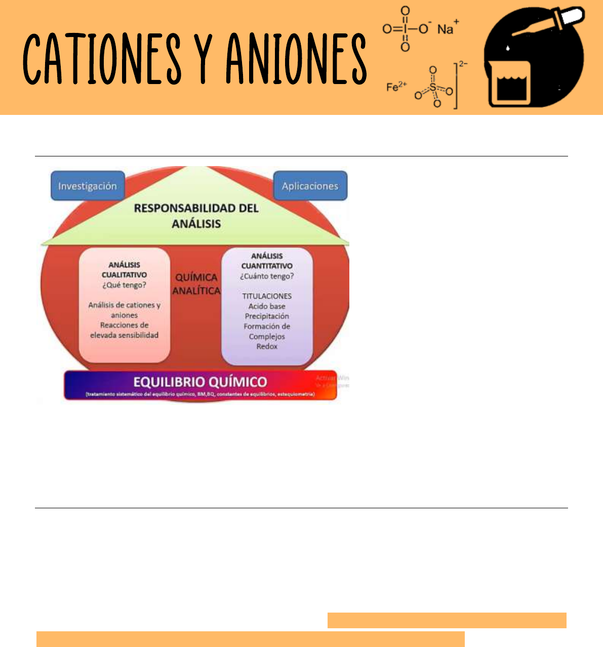 INTRODUCCIÓN Tanto el análisis cualitativo como el cuantitativo se sustentan en el EQUILIBRIO QUÍMICO el cual está regido por una constante de equilibrio y tiene una cierta estequiometría que indica cuantos moles de un reactivo reaccionan con el otro para dar tanta cantidad de producto. DEFINICIONES IMPORTANTES ANÁLISIS CUALITATIVO → establece la identidad química de los componentes de la muestra. ANÁLISIS CUANTITATIVO → establece la cantidad relativa de los componentes de la muestra en forma numérica. MUESTRA → es la porción de materia a analizar, la cual debe ser representativa. Previo al análisis se llevará a cabo un tratamiento de la misma; y además, cuanta mayor información se tenga sobre la muestra, esto ayudará a elegir el método analítico más adecuado para su estudio. MUESTRA ANALÍTICA → es la porción de muestra tratada para abalizar. Por ejemplo: si se tienen 500 comprimidos, esta será la muestra, pero solo se tomará una cantidad de ellos para analizar, lo cual será la muestra analítica. ANALITO → es la sustancia objeto del análisis; el cual puede ser un componente mayoritario de la muestra (1-100%p/p), minoritario (1-0,1%p/p), puede estar en trazas o vestigios (<0,01%p/p) o en ultratrazas (ppm, ppt, ppb). TÉCNICA → es el medio, ya sea instrumental o químico, de obtener información del analito. Las TITULACIONES permiten informar cuanto se tiene de determinado compuesto a partir del conocimiento de una sustancia de concentración conocida que reacciona con el compuesto de interés. Las titulaciones van a establecer distintos tipos de equilibrios de acuerdo al principio puesto en juego entre el analito o valorando y la sustancia de concentración conocida o valorante. PROCEDIMIENTO ANALÍTICO → conjunto de operaciones aplicadas al análisis de una muestra. SENSIBILIDAD → es la mínima cantidad del analito de interés que se puede detectar o cuantificar en una muestra. SELECTIVIDAD → es la capacidad del método de detectar o cuantificar el analito de interés dentro de la matriz. Cuando la selectividad es del 100%, el método es ESPECÍFICO. ESPECIFICIDAD → un método es específico cuando está dirigido a un analito particular. PRESICIÓN → un método es preciso si al repetir el análisis múltiples veces, se obtienen resultados muy cercanos entre sí. ROBUSTEZ → que un método sea robusto quiere decir que no varía ante cualquier cambio (por ejemplo, ante un cambio de temperatura). REACCIÓN ANALÍTICA Una reacción analítica es una reacción química que ocurre entre un analito de interés y los reactivos, y que produce un efecto observable o medible → y este fenómeno se relaciona con la o las sustancias presentes en la muestra. Un reactivo es GENERAL cuando el mismo puede reaccionar con muchos elementos de la tabla periódica. Un reactivo se vuelve SELECTIVO cuando el mismo reacciona con un grupo reducido de elementos. Un reactivo es ESPECÍFICO cuando solamente reacciona con un elemento. En cuento a las reacciones, las mismas pueden ser: CUALITATIVAS → solo dicen que se tiene CUANTITATIVAS → de acuerdo a la proporción en que reaccionan los productos, se puede decir que cantidad está presente del analito. Reacciones analíticas para cationes y aniones Las reacciones para cationes y aniones pueden utilizar reactivos generales o especiales. Si se utilizan REACTIVOS GENERALES, no serán selectivos → sino que reaccionarán con un grupo grande de elementos. Permiten tener una idea preliminar de la composición de la muestra, sobre todo si la misma es desconocida. Generalmente son reactivos inorgánicos y no permiten identificar. Si se utilizan REACTIVOS ESPECIALES → se podrá identificar un determinado elemento ya que son selectivos y específicos. Generalmente son sustancias orgánicas y tienen mayor sensibilidad que los reactivos generales. PROCESO ANALÍTICO 1. Definición del problema analítico. 2. Elección del método de análisis. 3. Obtención de una muestra representativa (muestreo). 4. Tratamiento previo de las muestras → una vez que se tiene la muestra se la debe adecuar para ayudar a la selectividad del método, por ejemplo: se puede concentrar el analito para ayudar a que el método le alcance la selectividad, o también se puede diluir el mismo con el mismo propósito. Otros tratamientos son pulverización, secado, disolución, extracción, eliminación de interferencias, concentración, etc. 5. Observación y/o medición de la propiedad del analito (análisis cualitativo, análisis cuantitativo). 6. Obtención de los resultados 7. Evaluación de la confiabilidad de los resultados. 8. Elaboración del informe. CONSTIUYENTES DE UNA MUESTRA En una muestra se cuenta con el analito de interés y con otros compuestos que constituyen la matriz. Entonces, en analito será la sustancia de interés muestras que la matriz son los demás constituyentes de la muestra que no son el objeto de estudio → y en esta matriz pueden existir INTERFERENCIAS, que pueden ser IMPUREZAS INERTES (no intervienen en el análisis) o IMPUREZAS QUE INTERFIERAN EN EL ANÁLISIS, perjudicando el estudio del analito de interés. Las interferencias pueden ser: positivas → son interferencias que reaccionan de igual manera que el analito (por ejemplo: que muestren el mismo color o precipiten ambos). Ejemplo: la reacción del plomo con rodizonato de sodio da un quelato de color rojo; sin embargo, si hay bario presente, se observará el mismo quelato rojo. A pesar de estar usando un reactivo orgánico selectivo, este no es específico únicamente para el Plomo, ya que interviene el Bario, que funciona como un interferente positivo. Si quisiese eliminarse este interferente positivo podría agregarse sulfato de sodio → ya que este hace que el bario precipite como sulfato de bario, que es mucho más insoluble que el sulfato de plomo, por ende, deja libre al plomo para que solo éste reaccione con el rodizonato. OJO: NO SIEMPRE UNA REACCIÓ