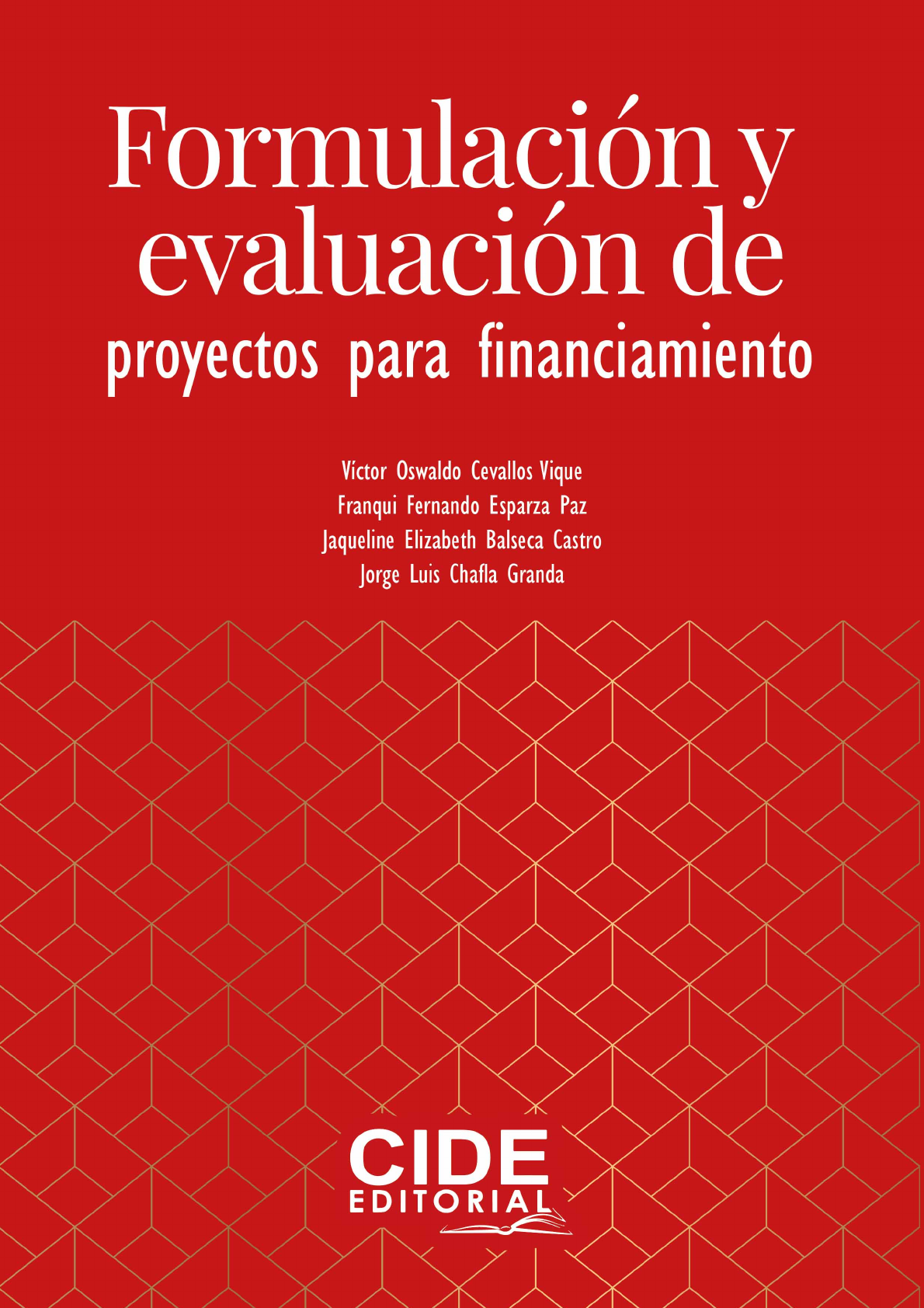 1 2 FORMULACIÓN Y EVALUACIÓN DE PROYECTOS PARA FINANCIAMIENTO 3 FORMULACIÓN Y EVALUACIÓN DE PROYECTOS PARA FINANCIAMIENTO AUTORES Víctor Oswaldo Cevallos Vique Franqui Fernando Esparza Paz Jaqueline Elizabeth Balseca Castro Jorge Luis Chafla Granda 4 Formulación y evaluación de proyectos para financiamiento. Reservados todos los derechos. Está prohibido, bajo las sanciones penales y el resarcimiento civil previstos en las leyes, reproducir, registrar o transmitir esta publicación, íntegra o parcialmente, por cualquier sistema de recuperación y por cualquier medio, sea mecánico, electrónico, magnético, electroóptico, por fotocopia o por cualquiera otro, sin la autorización previa por escrito al Centro de Investigación y Desarrollo Ecuador (CIDE). DERECHOS RESERVADOS Copyright © 2022 Centro de Investigación y Desarrollo Ecuador Guayaquil, Ecuador Tel.: + (593) 04 2037524 http.:/www.cidecuador.com ISBN: 978-9942-844-94-1 Impreso y hecho en Ecuador Dirección editorial: Lic. Pedro Misacc Naranjo, Msc. Coordinación técnica: Lic. María J. Delgado Diseño gráfico: Lic. Danissa Colmenares Diagramación: Lic. Alba Gil Fecha de publicación: Agosto, 2022 Guayquil - Ecuador 5 La presente obra fue evaluada por pares académicos experimentados en el área. Catalogación en la fuente Formulación y evaluación de proyectos para financiamiento / Víctor Oswaldo Cevallos Vique, Franqui Fernando Esparza Paz, Jaqueline Elizabeth Balseca Castro, Jorge Luis Chafla Granda.-- Ecuador: Editorial CIDE, 2022 150 p.: incluye fotografías, tablas, gráficos; 21 x 29, 7 cm. ISBN: 978-9942-844-94-1 1. Gerencia de Proyectos 6 SEMBLANZA DE LOS AUTORES Víctor Oswaldo Cevallos Vique Escuela Superior Politécnica de Chimborazo Docente titular de la Facultad de Administración de Empresas de la Escuela Superior Politécnica de Chimborazo, miembro investigador del Grupo Ciencia de Datos (CIDED) de la Facultad de Ciencias. Varios artículos científicos publicados en el ámbito de las ciencias económicas y administrativas. Ingeniero de Empresas; Máster en Dirección de Empresas; Diplomado en Inteligencia Emocional y Desarrollo del Pensamiento. Experiencia en gestión educativa en calidad de Director de Escuela de Ingeniería en Marketing; Vicedecano y Decano de la Facultad de Administración de Empresas de la ESPOCH. Actualmente se desempeña como Secretario Académico de la ESPOCH y docente de la carrera de Finanzas en las asignaturas Análisis Financiero, Formulación y Evaluación de Proyectos de Inversión. 7 Franqui Fernando Esparza Paz Escuela Superior Politécnica de Chimborazo Títulos: Ingeniero de Empresas, Técnico Superior en Gerencia de Marketing, Máster en Dirección de Empresas mención Proyectos, Diplomado en Emprendimiento Empresarial, Diplomado en Gerencia de Proyectos, Diplomado en Evaluación Financiera de Proyectos. Experiencia profesional: actual Director de la Unidad de Educación a Distancia (ESPOCH-FADE), Cooperativa de Ahorro y Crédito Cámara de Comercio Riobamba Ltda. (Gerente General), GADM cantón Alausi (Jefe Administrativo), Empresa Pública Municipal Mercado de Productores Agrícolas San Pedro de Riobamba (Gerente General), MAGAP Proforestal (Analista de Proyectos Regional), Banco del Austro, S.A (Oficial de Negocios), Banco del Pichincha C.A (Jefe de Negocios), Inpapel Cía. Ltda., (Jefe de Comercialización e Importaciones), Filanbanco (Oficial de Crédito y Jefe Comercial), Cámara de la Pequeña Industria de Chimborazo (Asistente Técnico y Director Ejecutivo), MAG Profogan (Analista socio económico), Ayudante de Cátedra FADE – ESPOCH. Docencia y capacitación: En pregrado y posgrado Escuela Superior Politécnica de Chimborazo (ESPOCH), Universidad Nacional de Chimborazo (UNACH), Universidad Técnica Estatal de Quevedo (UTEQ), Instituto Técnico Superior República Federal de Alemania (ISTRA), Servicio Ecuatoriano de Capacitación Profesional (SECAP), Asociación Flamenca de Cooperación y Asesoría Técnica (VVOB), Universidad Técnica de Ambato (UTA). Actual docente investigador en la FADE- ESPOCH. Ha publicado varios artículos científicos y presentación de ponencias en varios países. 8 Jaqueline Elizabeth Balseca Castro Escuela Superior Politécnica de Chimborazo Docente de la Facultad de Ciencias de la Escuela Superior Politécnica de Chimborazo – Ecuador; miembro investigador del Grupo Leishmaniosis y otras parasitosis en el Ecuador (LEISHPAREC); miembro de Grupos de Vinculación con la sociedad de la Facultad de Ciencias. Varios artículos científicos publicados en el ámbito de las ciencias económicas y administrativas. Dra. en Contabilidad y Auditoría; Magíster en Pequeñas y Medianas Empresas mención Finanzas, Formador de Formadores. Experiencia en las áreas de contabilidad, auditoría, finanzas, emprendimientos. Experiencia laboral en empresas privadas con fines y sin fines de lucro. Actualmente, docente de la carrera de Estadística y Bioquímica y Farmacia en las asignaturas: Matemática Financiera, Investigación de Mercados y Emprendimientos. Jorge Luis Chafla Granda Escuela Superior Politécnica de Chimborazo El autor a lo largo de su trayectoria profesional se ha vinculado a los sectores económicos y productivos, por tal razón su formación en la Administración de Agronegocios y la Planificación Estratégica le han permitido conceptualizar las necesidades de los actores de la producción y traducirlos a proyectos con enfoque asociativo y de encadenamiento para la generación de valor, uno de los componentes 9 DEDICATORIA Todo esfuerzo que los seres humanos desarrollamos, debemos dedicar a personas especiales, por ello los autores queremos demostrar el agradecimiento a Dios, como ser supremo de la humanidad, por su guía permanente en nuestras vidas; luego a nuestras familias, por el apoyo constante y la paciencia que nos tuvieron durante el tiempo que dedicamos en la realización del presente trabajo. Víctor Fernando Jacque