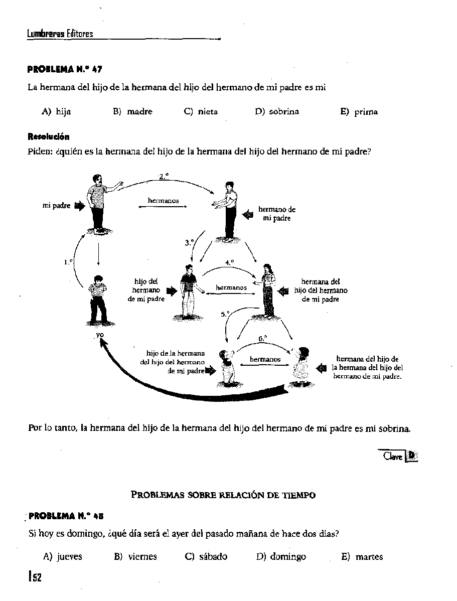 PROBLEMA N.« 47 La herm ana del hijo de la herm ana del hijo del herm ano de m i padre es mi A) hija B) m adre C) n ieta D) sobrina E) prim a Retoluctón Piden: ¿quién es la herm ana del hijo de la herm ana del hijo del herm ano de mi padre? mi padre Por lo tanto, la herm ana del hijo de la herm ana del hijo del herm ano de m i padre es mi sobrina. P r o b l e m a s s o b r e r e l a c ió n d e t ie m p o PROBLEMA N.** 48 Si hoy es domingo, ¿qué d ía será el ayer del pasado m añana de hace dos días? A) jueves B) viernes C) sábado D) dom ingo E) m artes IS 2