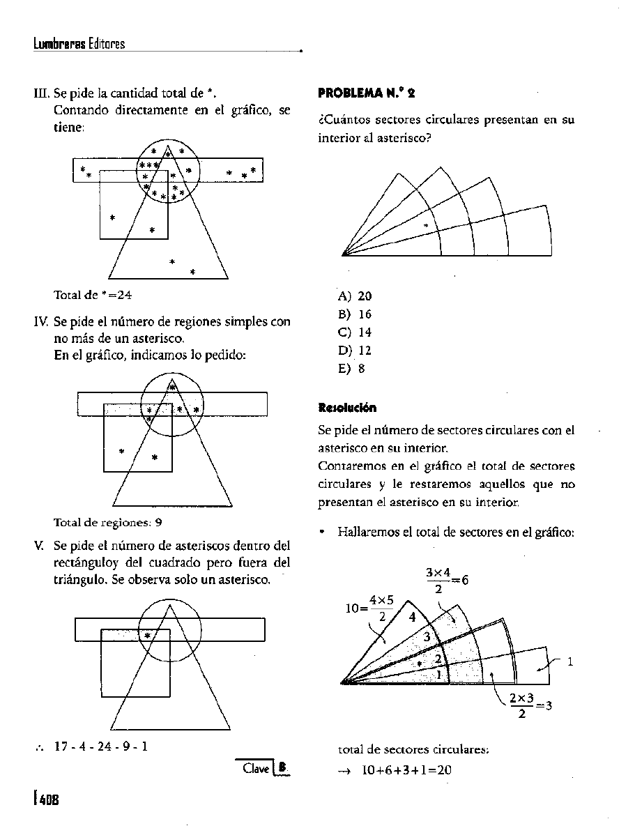 III. Se pide la cantidad total de *. Contando directam ente en el gráfico, se tiene: Total de *=24 IV. Se pide el núm ero de regiones sim ples con no más de un asterisco. En el gráfico, indicamos lo pedido: Total de regiones: 9 V. Se pide el núm ero de asteriscos dentro del rectánguloy del cuadrado pero fuera del triángulo. Se observa solo un asterisco. ¿Cuántos sectores circulares presentan en su interior al asterisco? A) 20 B) 16 C) 14 D) 12 E) 8 Resolución Se pide el núm ero de sectores circulares con el asterisco en su interior. Contarem os en el gráfico el total de sectores circulares y le restarem os aquellos que no presentan el asterisco en su interior. • Hallaremos el total de sectores en el gráfico: 3 x 4 ^—-— = 0 total de sectores circulares; —> 1 0 + 6 + 3 + 1 = 2 0