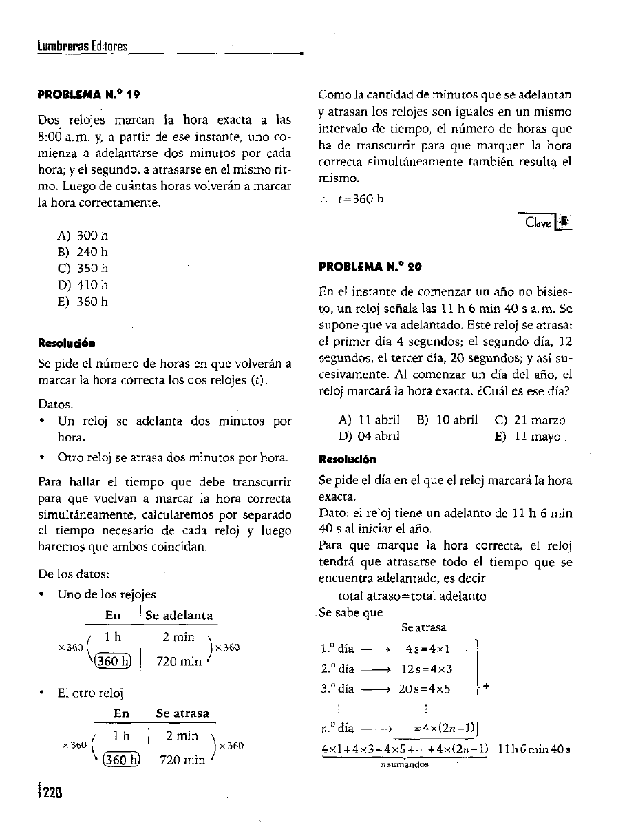 PROBLEMA N. ̂ 19 Dos relojes m arcan la hora exacta a las 8:00 a.m . y, a partir de ese instante, uno co m ienza a adelantarse dos m inutos por cada hora; y el segundo, a atrasarse en el m ism o rit mo. Luego de cuántas horas volverán a marcar la hora correctam ente. A) 3 0 0 h B) 240 h C) 3 5 0 h D) 4 1 0 h E) 360 h Resolución Se pide el núm ero de horas en que volverán a m arcar la hora correcta los dos relojes (c). Datos: • Un reloj se adelanta dos m inutos por hora. • O tro reloj se atrasa dos m inutos por hora. Para hallar el tiem po que debe transcurrir para que vuelvan a m arcar la hora correcta sim ultáneam ente, calcularem os por separado el tiem po necesario de cada reloj y luego harem os que ambos coincidan. De los datos: • Uno de los rejojes En x 3 6 0 / 1 h H360 h) El otro reloj Se ad e la n ta 2 min 720 min x 3 6 0 X 360 En Se a tra sa ̂ I h 2 m in \ ^ [360 h} 720 min ^ x 3 6 0 Com o la cantidad de m inutos que se adelantan y atrasan los relojes son iguales en un m ism o intervalo de tiempo, el núm ero de horas que ha de transcurrir para que m arquen la hora correcta sim ultáneam ente tam bién resulta el mismo. .-. t= 3 6 0 h Clave ^ PROBLEMA 80 En el instante de com enzar un año no bisies to, u n reloj señala las 11 h 6 m in 40 s a. m. Se supone que va adelantado. Este reloj se atrasa: el prim er día 4 segundos; el segundo día, 12 segundos; el tercer día, 20 segundos; y así su cesivamente. Al com enzar un día del año, el reloj m arcará la hora exacta. ¿Cuál es ese día? A) 11 abril D) 04 abril B) 10 abril C) 21 marzo E) 11 mayo Resolución Se pide el día en el que el reloj m arcará la hora exacta. Dato: el reloj tiene un adelanto de 11 h 6 m in 40 s al iniciar el ano. Para que m arque la hora correcta, el reloj tendrá que atrasarse todo el tiem po que se encuentra adelantado, es decir to ta l a traso = to ta l adelanto - Se sabe que Se atrasa 1.°día ------> 4 s = 4 x l 2 .°día ------ > 12s = 4x3 3 ."día ------ > 2 0s= 4x5 día = 4 x (2 n - l) 4 x l + 4x3 + 4 x 5 + - + 4 x ( 2 n - l ) = l lh 6 m in 4 0 s n sum andos