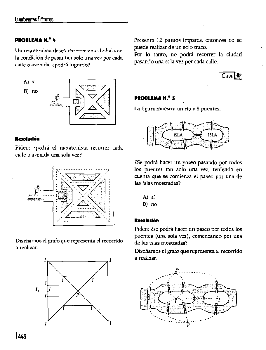 PROBLEMA N.** 4 U n m aratonista desea recorrer una ciudad con la condición de pasar tan solo una vez por cada calle o avenida, ¿podrá lograrlo? A) sí B) no Resolución Piden: ¿podrá el m aratonista recorrer cada calle o avenida una sola vez? Diseñam os el grafo que representa el recorrido a realizar. Presenta 12 puntos im pares, entonces no se puede realizar de un solo trazo. Por lo tanto, no podrá recorrer la ciudad pasando una sola vez por cada calle. Clave PROBLEMA N.” 5 La figura m uestra un río y 8 puentes. ¿Se podrá hacer un paseo pasando por todos los puentes tan solo una vez, teniendo en cuenta que se com ienza el paseo por una de las islas m ostradas? A) sí B) no Resolución Piden: ¿se podrá hacer un paseo por todos los puentes (una sola vez), com enzando por una de las islas mostradas? D iseñam os el grafo que representa al recorrido a realizar. Im b