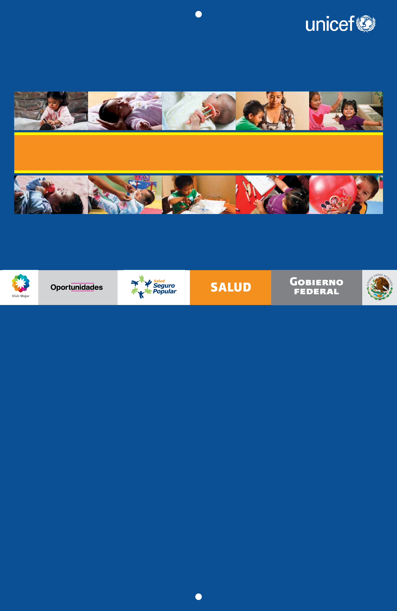 Ejercicios de Estimulación Temprana Se terminó de imprimir en diciembre de 2011 en Talleres Gráficos de México, Av. Canal del Norte No. 80, Col. Felipe Pescador, Del. Cuauhtémoc, C.P. 06280, México, D.F. La edición consta de 1,386,100 ejemplares. La coordinación de los contenidos y edición estuvo a cargo de la Dirección General del Programa Oportunidades a través de la Dirección de Desarrollo Operativo en la Comisión Nacional de Protección Social en Salud, así como del Fondo de las Naciones Unidas para la Infancia en México, UNICEF. Agradecemos a las familias y a las Coordinaciones Estatales del Programa Oportunidades de Hidalgo y Nayarit por su atenta y entusiasta participación en la toma de fotografías para este material. Fuente: contenidos adaptados de la Organización Mundial de la Salud, OMS. Autores: Helander E, Mendis P, Nelson G, Geordt A (1989) Fotografía: © UNICEF México / Mauricio Ramos Diseño: Ana Paula Dávila www.desarrolloinfantiltemprano.mx “Aquí pega la foto de tu hijo(a)” MensAje InIcIAl La estimulación temprana ayuda a fortalecer el cuerpo y a desarrollar las emociones y la inteligencia de tu hijo o hija. Integra estas actividades a su juego diario. Abrázale, felicítale, sonríele, háblale y dile lo mucho que lo quieres, así, contribuirás a su desarrollo pleno y al cuidado de su salud. ÁreAs del desArrollo Motor Grueso: son los grandes movimientos del cuerpo, piernas y brazos. Motor fino: son los movimientos finos y precisos de las manos y dedos. Lenguaje: es la capacidad de comunicarse y hablar. Socio-afectivo: es la capacidad de relacionarse con los demás y expresar sentimientos y emociones. sugerencIAs pArA lA estIMulAcIón teMprAnA Desarrolla las actividades en un ambiente tranquilo y seguro. Siempre premia o festeja los resultados obtenidos. No fuerces su respuesta si no quiere hacer las actividades. Participen ambos padres o aquellas personas encargadas del cuidado diario en la estimulación de los hijos o hijas. Las actividades deben realizarse diariamente o por lo menos tres veces a la semana. Repite las series de ejercicios por lo menos cinco veces. Acompaña las actividades con música, canciones, rimas y juegos. El momento ideal para estimularles es cuando están despiertos y tranquilos. Deja pasar 30 minutos después de alimentarle. Aprovecha las actividades diarias como la alimentación, el baño, el juego, el vestirle. Diseña tus propios instrumentos para los ejercicios, no necesitas gastar para estimularle. Al nacer 1 año 2 años 3 años 4 años 5 años Peso: Medida: Mi nombre es: Mi fecha de nacimiento es: Mi papá se llama: Mi mamá se llama: Mis hermanos (as) se llaman: “Aquí pega la foto de tu hijo(a)” ActIVIdAdes pArA BrAZos Y pIernAs 1 Acuéstale boca arriba. Extiende sus brazos con delicadeza hacia abajo, arriba y a los lados, luego crúzalos sobre su pecho. Deja el brazo derecho arriba y el izquierdo abajo y viceversa. Alterna la posición de los brazos. 2 Acostado boca arriba, estira y flexiona suavemente sus piernas. 3 En esa misma posición, toma sus brazos y piernas y muévelo hacia un lado y hacia el otro, procurando que su cabeza siga el movimiento del cuerpo. 4 Dale masaje de los hombros a las manos y de los muslos a los pies. 5 Acuéstalo a lo ancho de una hamaca y mécelo suavemente. También pueden acostarlo boca arriba sobre una sábana y mecerlo entre dos personas. ActIVIdAdes recoMendAdAs pArA estIMulAr Al BeBÉ durAnte lA AlIMentAcIón 1 Limpia y seca el seno con el que vas a alimentarle. Siéntate cómoda y acerca a tu bebé al pecho. Cuida que su nariz quede libre para que respire bien. Háblale afectuosamente. Cántale, arrúllale, mírale a los ojos. Toca sus mejillas o labios con tus dedos y oprime suavemente tu pezón para que salgan algunas gotas de leche. Estimula la succión dándole a oler la leche que tengas sobre el pezón. Acerca tu pezón a sus labios y espera a que comience a comer. ActIVIdAdes pArA leVAntAr Y controlAr lA cABeZA 1 Recuéstale boca abajo sobre una superficie firme y extiende sus brazos. Llama su atención con un objeto brillante o mediante sonidos graciosos o alegres. 2 Recuéstale boca arriba. Toma suavemente sus brazos y levántale hasta sentarle. Sostenle con firmeza. Luego recuéstale de lado para que se incorpore otra vez. 3 Boca abajo, sobre una superficie dura y apoyado(a) en sus antebrazos, acaricia su espalda o pasa tus dedos a los lados de su columna vertebral, bajando desde el cuello hacia la cadera, pero NUNCA en sentido contrario. 4 Cárgale para que sostenga la cabeza. 1 2 3 4 ejercicios de estimulación temprana0 a 3 Meses 1a 1b 1c 1d 2 3 4 Los primeros 5 años de vida son los más importantes para el desarrollo del cerebro, especialmente los tres primeros. Los estímulos que le des en ese periodo son fundamentales para desarrollar sus sentidos, movimientos, pensamiento y aprendizaje. “Aquí pega la foto de tu hijo(a)” 3 4 Mientras interactúas y alimentas a tu bebé, especialmente en los primeros meses, míralo a los ojos, abrázale, acaríciale y háblale. 0 a 3 Meses 3 VIsIón Y AudIcIón 1 Mírale a la cara con ternura y procura atraer su mirada. Platícale y trata de que te identifique como la fuente del sonido. 2 Para estimular sus reacciones ante la luz, llévale a lugares con diferente iluminación. También puedes prender y apagar una lámpara evitando lastimar sus ojos. 3 Acuéstale boca arriba sobre una superficie dura y segura. Párate frente a tu bebé y llama su atención con un objeto de color brillante (de preferencia rojo, blanco o negro). Haz sonidos graciosos o alegres para atraer su mirada. Mueve el objeto despacio hacia la derecha y hacia la izquierda, para que lo siga con la vista. Si no puede hacerlo, ayúdalo moviendo suavemente su cabeza. 4 Haz sonar objetos cerca de sus oídos (campanitas, cascabeles, sonajas, etc.). 5 Siempre llámalo por su nombre. lenguAje 1 Imita todos los sonidos que haga con un tono suave para