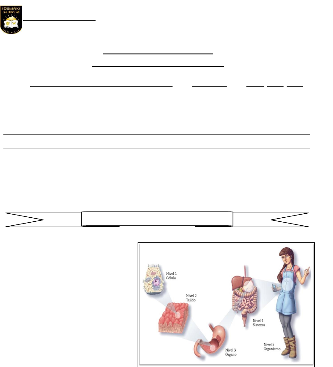GUÍA DE CIENCIAS NATURALES Los niveles de organización biológica Nombre: Curso: Fecha: / / Antes de comenzar, responde la siguiente pregunta: ¿Qué es lo primero que se te viene a la menta con la frase “niveles de organización biológica”? Entonces, veamos si lo que pensaste se relaciona. Los niveles de organización biológica son las estructuras que componen los seres vivos, y los cuales se organizan en niveles, desde lo más simple a lo más complejo. En esta oportunidad son 5: célula, tejido, órgano, sistema y organismo. 1. Célula: Es la unidad básica de todo ser vivo. Está formada por varios componentes que se encuentran coordinados entre sí. 2. Tejido: Es un grupo de células similares que cumplen una función específica. 3. Órgano: Es una estructura compuesta por un grupo de tejidos que cumplen un papel determinado. 4. Sistema: Es un grupo de órganos que en conjunto cumplen una función. 5. Organismo: Es un ser vivo formado por varios sistemas de órganos. Los niveles de organización biológica Profesor(a): Nelson Espejo G. Asignatura: Ciencias Naturales Curso: 6° año A Marzo 2021 Corporación Educ. San Sebastián Escuela Básica “San Sebastián” PADRE LAS CASAS 2335471 ÍTEM 1: Escribe el nombre del nivel de organización biológica de la siguiente imagen: ÍTEM 2: Escribe el nivel de organización biológica que corresponda a cada frase. 1. Es un grupo de células similares que cumplen una función específica. 2. Ejemplos de estos son el humano, animales, plantas, entre otros. 3. Es un grupo de órganos que en conjunto cumplen una función. 4. Es la unidad estructural de todo ser vivo. 5. Ejemplos de estos son el intestino grueso, estómago, etc. 6. Cómo es tan pequeña, es necesario ampliar imágenes para poder explicar de mejor manera. 7. Ejemplos son el respiratorio, nervioso, circulatorio, entre otros. 8. Está formada por varios componentes que se encuentran dentro de esta, que están coordinados entre sí. 9. Es un ser vivo formado por varios sistemas de órganos que funcionan coordinadamente. 10. Ejemplo de estas son los glóbulos blancos, las neuronas, entre otras. 11. Es una estructura compuesta por un grupo de tejidos que cumplen un determinado papel. ÍTEM 3: Encierra en un círculo la alternativa que consideres correcta: 1. ¿Cuál es el orden de los niveles de organización biológica, desde lo más complejo a lo más simple? a) Célula, Tejido, Órgano, Sistema, Organismo b) Célula, Tejido, Órgano, Organismo, Sistema c) Organismo, Sistema, Órgano, Tejido, Célula d) Organismo, Tejido, Órgano, Sistema, Célula 2. ¿De qué están formados los órganos? a) Organismos b) Sistemas c) Tejidos d) Células Observa la siguiente imagen y responde las preguntas 3 y 4. 3. ¿Qué nivel de organización falta en la imagen? a) Célula b) Organismo c) Sistema d) Órgano 4. ¿Con qué sistema del cuerpo podemos asociar la imagen? a) Digestivo b) Esquelético c) Respiratorio d) Nervioso Observa la siguiente imagen y responde las preguntas 5 y 6 5. ¿Cuál alternativa establece una correcta relación? a) Tejido - muro b) Célula - casa c) Sistema – pieza (dormitorio) d) Organismo – ladrillo 6. ¿Cuál sería la unidad estructural de la casa en esta comparación? a) Pieza (dormitorio) b) Muro c) Ladrillo d) Sector dormitorios ÍTEM 4: Dibuja los niveles de organización biológica, utilizando otro sistema del cuerpo humano distinto al sistema digestivo. Por ejemplo: sistema respiratorio, circulatorio, nervioso, locomotor, entre otros. Después, nombra cada uno de los niveles dentro del dibujo. Puedes guiarte de la imagen que aparece en la página 1 de esta guía.