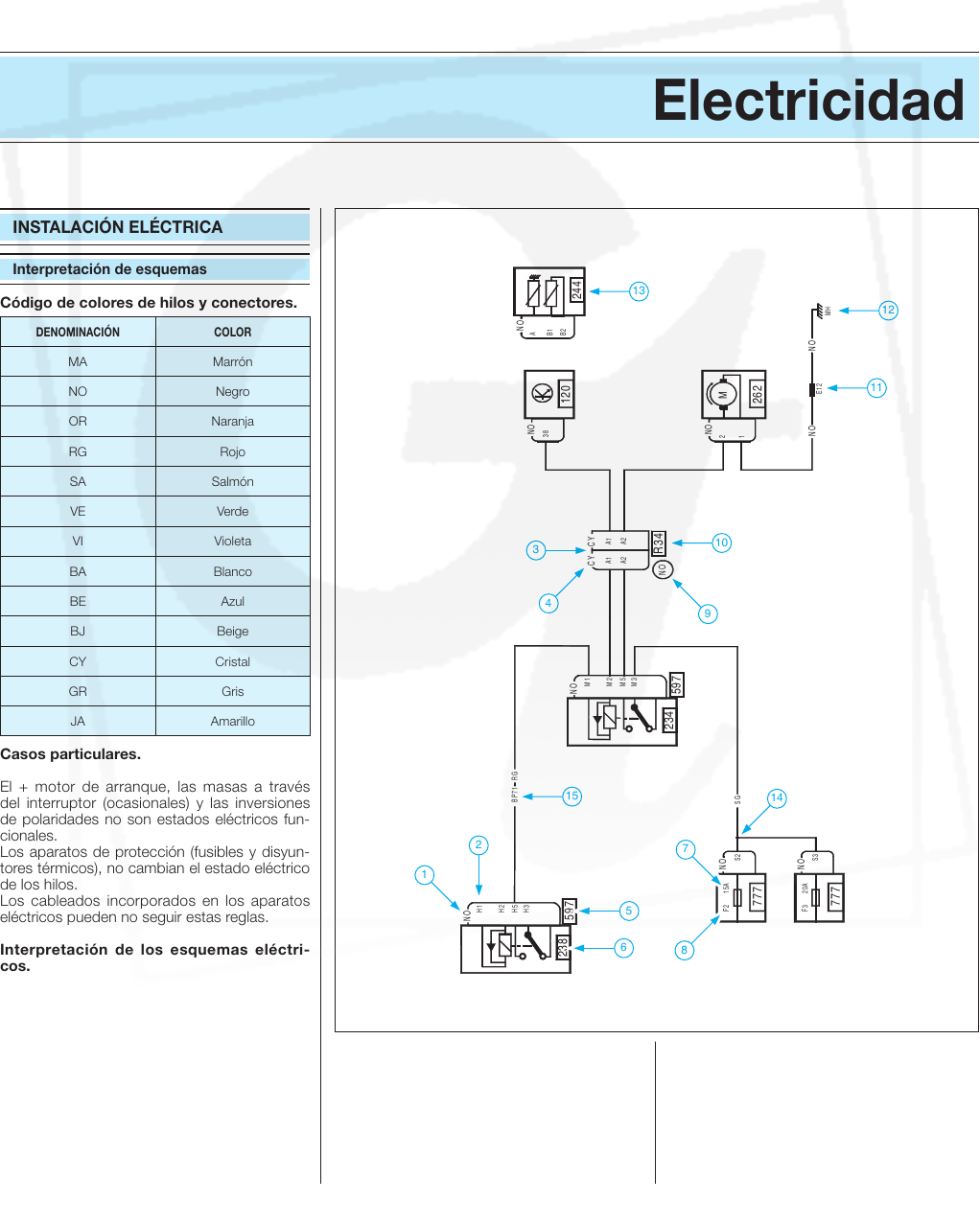 RENAULT MÉGANE II / 191 Electricidad Código de colores de hilos y conectores. DENOMINACIÓN COLOR MA Marrón NO Negro OR Naranja RG Rojo SA Salmón VE Verde VI Violeta BA Blanco BE Azul BJ Beige CY Cristal GR Gris JA Amarillo Casos particulares. El + motor de arranque, las masas a través del interruptor (ocasionales) y las inversiones de polaridades no son estados eléctricos fun- cionales. Los aparatos de protección (fusibles y disyun- tores térmicos), no cambian el estado eléctrico de los hilos. Los cableados incorporados en los aparatos eléctricos pueden no seguir estas reglas. Interpretación de los esquemas eléctri- cos. Los esquemas eléctricos permiten, tras haber identificado el vehículo por medio de: - Los 4 primeros caracteres (tipo de vehículo), que figuran en la placa oval. - Las indicaciones de la placa motor. - El nivel de equipamiento. Seleccionar el esquema de principio aplicado correspondiente a la función a analizar. Estos esquemas de principio aplicado detallan el interior de los órganos simples, (contactor, relés...) y facilitan la comprensión del funciona- miento del sistema y su diagnóstico. INSTALACIÓN ELÉCTRICA Interpretación de esquemas R3 4 23 8 59 7 12 0 24 4 MH 1238 A1 M1 M2 M5 M3 H1 H2 H5 H3 S3S2 F2 1 5A F3 2 0A A2 A1 A2 E1 2 A B1 B2 77 7 77 7 23 4 59 7 26 2 M NO NO NO NO CY CY NO BP 71 RG SG NONO NO NON O 5 6 4 8 3 1 72 14 13 12 15 11 10 9 1.- Color del conector. 2.- Representación del conector. 3.- Representación de un empalme. 4.- Color del conector de empalme. 5.- Número de platina a la que está conectado el aparato. 6.- Número de aparato. 7.- Calibre del fusible. 8.- Posición del fusible en la platina. 9.- Color del porta-módulo. 10.- Número de empalme. 11.- Número de episure. 12.- Número de masa. 13.- Aparato secundario. 14.- Representación de un enlace. 15.- Código de unión (permite identificar la función de un cable), ver repertorio de las uniones. ELECTRICIDAD 192 / RENAULT MÉGANE II 101.- Encendedor. 103.- Alternador. 105.- Bocina electromagnética principal. 107.- Batería. 118.- Unidad de control eléctrico antibloqueo de ruedas. 119.- Unidad de control eléctrico caja de ve- locidades automática. 120.- Unidad de control eléctrico inyección. 123.- Mando condenación eléctrica de puer- tas. 129.- Mando leyes de paso. 130.- Mando elevalunas eléctrico trasero de- recho. 131.- Mando elevalunas eléctrico trasero iz- quierdo. 133.- Mando elevalunas eléctrico pasajero. 134.- Mando retrovisor eléctrico. 135.- Mando bloqueo elevalunas eléctrico trasero. 138.- Condenación eléctrica puerta trasera derecha. 139.- Condenación eléctrica puerta trasera izquierda. 140.- Condenación eléctrica puerta conduc- tor. 141.- Condenación eléctrica puerta pasajero. 146.- Captador de picado 1. 147.- Captador presión atmosférica. 149.- Captador punto muerto superior. 150.- Captador de rueda trasera derecha. 151.- Captador de rueda trasera izquierda. 152.- Captador de rueda delantera derecha. 153.- Captador de rueda delantera izquierda. 155.- Contactor luces de marcha atrás. 156.- Contactor freno de mano. 160.- Contactor de stop. 163.- Motor de arranque. 164.- Dispositivo de sistema de soplado aire frío. 165.- Iluminador de maletero. 166.- Iluminador placa de matrícula derecho. 167.- Iluminador placa de matrícula izquier- do. 168.- Iluminador guantera. 169.- Electroválvula reciclaje de gases. 171.- Embrague acondicionador de aire. 172.- Luz trasera derecha. 173.- Luz trasera izquierda. 176.- Luz de niebla delantera derecha. 177.- Luz de niebla delantera izquierda. 188.- Grupo motoventilador refrigeración. 189.- Altavoz trasero derecho. 190.- Altavoz trasero izquierdo. 191.- Altavoz puerta delantera derecha. 192.- Altavoz puerta delantera izquierda. 193.- Inyector 1. 194.- Inyector 2. 195.- Inyector 3. 196.- Inyector 4. 199.- Aforador de carburante. 200.- Luneta térmica. 201.- Motor elevalunas trasero derecho. 202.- Motor elevalunas trasero izquierdo. 203.- Motor elevalunas del conductor. 204.- Motor elevalunas pasajero. 205.- Manocontacto. 207.- Captador mínimo líquido de frenos. 211.- Motor limpialuneta. 212.- Motor limpiaparabrisas. 213.- Plafonier delantero. 219.- Bomba lavafaros. 225.- Toma de diagnóstico. 226.- Faro derecho. 227.- Faro izquierdo. 234.- Relé grupo motoventilador. 236.- Relé bomba de carburante. 238.- Relé bloqueo inyección. 239.- Retrovisor eléctrico conductor. 240.- Retrovisor eléctrico pasajero. 242.- Sonda de oxígeno posterior. 243.- Sonda nivel de aceite. 244.- Captador temperatura agua inyección. 245.- Sonda de temperatura exterior. 247.- Cuadro de instrumentos. 257.- Cajetín de precalentamiento. 260.- Caja de fusibles y relés habitáculo. 261.- Radio. 267.- Repetidor derecho. 268.- Repetidor izquierdo. 272.- Captador temperatura aire inyección. 299.- Platina de servicios y relés. 300.- Plafonier travesaño trasero. 304.- Techo solar. 317.- Mando techo solar. 319.- Cuadro de mando acondicionador de aire. 325.- Mando satélite radio. 331.- Mando regulador de velocidad. 333.- Contactor cinturón conductor. 338.- Regulador presión turbo. 365.- Altavoz tweeter derecho. 366.- Altavoz tweeter delantero izquierdo. 369.- Bomba agua apoyos turbo. 371.- Absorbedor vapores de gasolina. 385.- Asiento calefactante conductor. 386.- Asiento calefactante pasajero. 414.- Sonda de agua en gasóleo. 418.- Ventilador sonda temperatura habitá- culo. 419.- Caja de control acondicionador de aire. 420.- Estrangulador mezcla. 427.- Unidad de control electrónico alarma. 433.- Captador ultrasonidos alarma. 436.- Electroválvula presión turbo. 438.- Contactor capó motor. 442.- Sirena alarma autoalimentada. 449.- Resistencia recalentador de gasóleo. 450.- Relé recalentador de gasóleo. 469.- Mando monitor. 475.- Motor reciclaje. 485.- Contactor multifunciones. 537.- Motor corrector faro izquierdo. 538.- Motor corrector faro derecho. 541.- Iluminador espejo cortesía. 560.- Contactor apertura portón