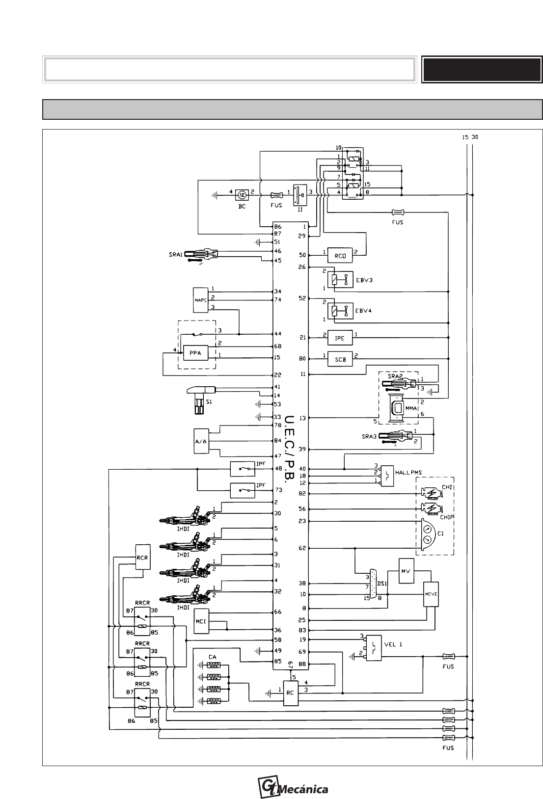 PEUGEOT / 415 PEUGEOT406 2.0 HDI MOTOR: RHY (DESDE 1998) GESTIÓN MOTOR: BOSCH EDC 15C2 418 / PEUGEOT PEUGEOT 406 2.0 HDI La resistencia del inyector es de 0,2 a 0,5 Ω. Comprobación del inyector desde la Unidad Electrónica de Control: Desconectar la U.E.C.: - Terminales 2 y 30; 5 y 6; 31 y 3; 32 y 4: comprobar que la resistencia coin- cida con la especificada. Conectar la U.E.C. Comprobar en los terminales mencio- nados anteriormente que la señal corresponda con la de la figura: “Inyector”. Medidor masa aire Situado a la salida del filtro del aire en el colector de admisión. Su función es la de medir la cantidad de aire que entra en el colector de admisión. Comprobación desde el conector del medidor masa aire: Accionar el contacto. Todas las com- probaciones deben realizarse con el conector enchufado, en el lado del cableado: - Terminal 2 y masa: 12 Vcc. - Terminal 5 y masa: 0,5 Vcc., aproxi- madamente. Vehículo a ralentí y a temperatura de servicio: - Terminal 5 y masa: de 1,8 a 2,2 Vcc. Acelerando levemente: - Terminal 5 y masa: de 4,0 a 4,5 Vcc. Comprobación en la U.E.C.: Accionar el contacto: - Terminal 13 y 40: 0,5 Vcc., aproxima- damente. Vehículo a ralentí y a temperatura de servicio: - Terminal 13 y 40: de 1,8 a 2,2 Vcc. Acelerando levemente: - Terminal 13 y 40: de 4,0 a 4,5 Vcc. Potenciómetro acelerador Está situado al lado del amortiguador delantero derecho. Este componente es una resistencia variable en función de la posición del pedal del acelerador. Tensión de alimentación: 5 Vcc. Comprobación en la U.E.C.: Accionar el contacto: - Terminales 44 y 22: 5 Vcc. - Terminales 15 y 22: de 0,3 a 0,5 Vcc. (pedal del acelerador en reposo). - Terminales 15 y 22: de 3,3 a 3,5 Vcc. (pedal del acelerador pisado a fondo). - Terminales 68 y 22: de 0,1 a 0,3 Vcc. (con el pedal del acelerador en reposo). - Terminales 68 y 22: de 1,8 a 2 Vcc. (pedal del acelerador pisado a fondo). Regulador de combustible Está situado en el cuerpo de la bomba de alta presión. Se encarga de regular la presión de la rampa de inyección. La resistencia del componente es de 2,5 a 3,5 Ω. Comprobación desde el conector del regulador de combustible: Quitar el contacto. Desenchufar el conector del regulador de combustible: - Terminales 1 y 2 comprobar que la resistencia coincida con la señalada. Comprobación en la U.E.C.: Enchufar el conector del regulador de combustible. Accionar el contacto: - Terminales 50 y masa: debemos obte- ner un valor próximo a 9 Vcc. Encender el vehículo. Conectar el osciloscopio en los termi- nales 50 y masa, debemos obtener una señal como se indica en la figura: “Regulador de combustible”. Sensor de posición del árbol de levas Situado en la parte izquierda superior de la culata, al lado de la distribución. Informa a la U.E.C. de la posición del árbol de levas, para que esta realice las modificaciones necesarias de avance y sincronizar las inyecciones de combus- tible. Tensión de alimentación: 5 Vcc. Comprobación en la U.E.C.: - Terminales 18 y 40: obtendremos un valor de 0 ó 5 Vcc., dependiendo de la posición en la que se encuentre el árbol de levas. - Terminales 18 y 40: conectar un osci- loscopio y verificar que la señal corres- ponda con la de la figura: “PMS”. Sensor de presión barométrica Este componente está integrado en la U.E.C. Su comprobación solo es posi- ble con un equipo de diagnosis ade- cuado. Sensor de presión de combustible Este componente está situado en el cir- cuito de la rampa de inyección de alta presión. Es el encargado de medir la presión existente en la rampa de alta presión e informar a la U.E.C. (Unidad Electrónica de Control) para que realice las correcciones oportunas sobre los tiempos de inyección, factores de corrección de avance, etc. Tensión de alimentación: 5 Vcc. Comprobación en la U.E.C.: Accionar el contacto: - Terminales 44 y 34, obtendremos un valor de 5 Vcc. - Terminales 74 y 34, obtendremos un valor de 0,4 a 0,6 Vcc. Encender el vehículo: - Terminales 74 y 34, obtendremos un DIAGNOSIS DE COMPONENTES v o t Inyector v o t Regulador de combustible v o t PMS Electro-válvula de descarga turbo Está situada en el compartimiento motor contra el salpicadero. Está gober- nada por la U.E.C. por el terminal 26. Su función es permitir o impedir el flujo de aire desde el colector de admisión al mecanismo de descarga del turbo. Tensión de alimentación: 12 Vcc. Resistencia del componente: 15 a 25 Ω. Comprobación desde el conector de la electro-válvula de descarga turbo: Quitar el contacto. Desconectar la electro-válvula. Desconectar las tuberías de vacío, no debe de haber circulación de aire a tra- vés del cuerpo del componente. Comprobar la resistencia del compo- nente con la especificada. Conectar la electro-válvula. Comprobar el voltaje de alimentación, ó la señal que envía la U.E.C. (como se indica en la figura: “Descarga turbo”), realizando una prueba en carretera, con la electro-válvula conectada. En dicha prueba debemos conectar un manómetro de presión al colector de admisión, verificando que el soplado del turbo no sobrepase el máximo per- mitido. Electro-válvula de EGR Situada en el compartimiento motor, contra el salpicadero. Su función es conectar el depresor con la válvula EGR. Está gobernada por la U.E. C. por el terminal 52. Tensión de alimentación: 12 Vcc. La resistencia del componente es de 15 a 19 Ω. Comprobación desde el conector de la electro-válvula de EGR: Quitar el contacto. Desconectar la electro-válvula. Desconectar las tuberías de vacío, no debe de haber circulación de aire a tra- vés del cuerpo del componente. Comprobar la resistencia del compo- nente con la especificada. Conectar la electro-válvula y las tuberí- as de vacío. Encender el vehículo hasta que alcance la temperatura de servicio y se activen los electro-ventiladores. Comprobar que la señal corresponda con la figura: “EGR”. Electro-válvula tercer pistón bo