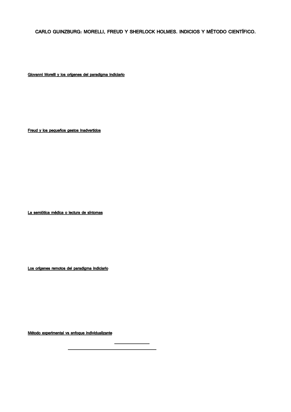 CARLO GUINZBURG: MORELLI, FREUD Y SHERLOCK HOLMES. INDICIOS Y MÉTODO CIENTÍFICO. Este texto trata sobre la cognición, es decir, sobre cómo se conoce. La hipótesis � desde fines del siglo XIX fue resurgiendo una formación cultural indiciaria en las ciencias humanas, que rompe con la estéril oposición entre “racionalismo” e “irracionalismo”. Pero este paradigma indiciario no era nuevo sino que estaba presente desde la astronomía y la medicina de la Edad Antigua. Giovanni Morelli y los orígenes del paradigma indiciario Entre 1874 y 1876 aparecieron una serie de artículos sobre pintura italiana, firmados por Morelli, que proponían un nuevo método para la atribución correcta de las pinturas de los viejos maestros. Según este procedimiento, hay que concentrarse en los detalles menores, especialmente en los menos significativos del estilo típico de la escuela del autor. Por ejemplo, para restaurar correctamente una pintura habrá que centrar la atención en los lóbulos de las orejas, las uñas, la forma de los dedos de las manos y los pies, etc. El método Morelli es similar al que utiliza Sherlock Holmes para interpretar unas pisadas o la ceniza de un cigarrillo. Ambos se dedican a descubrir, a partir de indicios, al autor de un hecho. Freud y los pequeños gestos inadvertidos Según Morelli, los detalles marginales resultaban reveladores porque en ellos la subordinación del artista a las tradiciones culturales desaparecía y daba paso a una manifestación puramente individual. Acentuando su atención en los detalles secundarios, el procedimiento de Morelli “muestra grandes afinidades con el psicoanálisis”, como bien reconoció Freud. Nuestros pequeños gestos inadvertidos revelan nuestro carácter de una manera mucho más auténtica que cualquier postura formal que podemos preparar cuidadosamente. Los ensayos de Morelli le representaron a Freud una propuesta de un método interpretativo que se basaba en considerar los detalles marginales e irrelevantes como indicios reveladores. Justamente porque estos detalles se repetían de manera casi inconsciente, “por la fuerza de la costumbre”, es que proporcionaban la clave para acceder al núcleo más íntimo de la individualidad, a esos elementos sustraídos al control de la conciencia. La semiótica médica o lectura de síntomas Tanto en el método de Freud, como en el de Morelli y el de Holmes, los detalles minúsculos proporcionan la clave para acceder a una realidad más profunda, inaccesible por otros métodos. Para Freud esos detalles son síntomas; para Holmes son pistas o indicios; para Morelli son rasgos pictóricos. Tanto Freud, como Conan Doyle y Morelli eran médicos y en los tres casos podemos invocar el modelo de la semiótica médica. La sintomatología es la disciplina que permite establecer un diagnóstico sobre la base de unos síntomas superficiales (signos), a menudo sin ninguna relevancia para el ojo del lego o del propio doctor Watson. La propia ciencia médica avanzó gracias a la formalización sistemática de numerosas conjeturas indiciarias. Los orígenes remotos del paradigma indiciario Hacia fines del siglo XIX, este modelo basado en la interpretación de indicios llegó a tener gran influencia en el campo de las ciencias humanas. Sin embargo, sus raíces eran mucho más antiguas. Durante miles de años la humanidad vivió de la caza. Los cazadores aprendieron a reconstruir el aspecto y los movimientos de una presa invisible a través de sus rastros: huellas, excrementos, plumas, olores, etc. De esta manera, daban significado y contexto hasta la más mínima huella. Sucesivas generaciones de cazadores enriquecieron y trasmitieron ese patrimonio del saber, que hoy pervive en numerosos cuentos populares y figuras retóricas del habla cotidiana. El arte adivinatorio propio de la Antigüedad se basaba en la lectura de mensajes escritos en las estrellas, en los cuerpos humanos y en casi todas partes. Método experimental vs enfoque individualizante Desde la teoría platónica del conocimiento, el paradigma indiciario sobrevivió oculto y eclipsado. Pero la censura decisiva es la aparición de un nuevo paradigma científico basado en la física de Galileo. El uso sistemático de las matemáticas y del método experimental implicaba la necesidad de hacer mediciones y repetir fenómenos para postular una ley general aplicable a todos los casos futuros (inducción/deducción). Pero el paradigma indiciario hacía imposible esto último porque tenía por objeto ante todo lo cualitativo, el caso o la situación en cuanto individuales (abducción). Es así que durante la Edad Contemporánea, y sobre todo con el positivismo, casi todas las disciplinas científicas intentaron seguir el método experimental, sin éxito. Así, la medicina combina hoy ambos métodos: los médicos siguen interpretando síntomas, pero utilizan clasificaciones de enfermedades para analizar la sintomatología específica de un paciente en particular. Esto genera algunos problemas, dado que no todos los síntomas que presenta un paciente se adecúan a la rígida clasificación “científica” de las enfermedades. El cuadro clínico de un paciente se revela como una situación mucho más compleja, que no siempre sigue la evolución prescrita por una clasificación simplista. Los síntomas toman formas específicas de acuerdo a cada paciente y, por lo tanto, requieren tratamientos también específicos. El conocimiento real de una enfermedad sigue siendo indirecto e indiciario. Las autopsias médicas, por ejemplo, reconstruyen una historia previa a partir de las marcas presentes en un cuerpo inerte. Pero otras disciplinas también utilizan el paradigma indiciario. La meteorología combina el método experimental y el conjetural. Durante siglos, se apropió de saberes populares y hasta el día de hoy actúa interpretando las formas de las nubes, la velocidad y dirección del viento, el comportamiento de los animales, leyendo