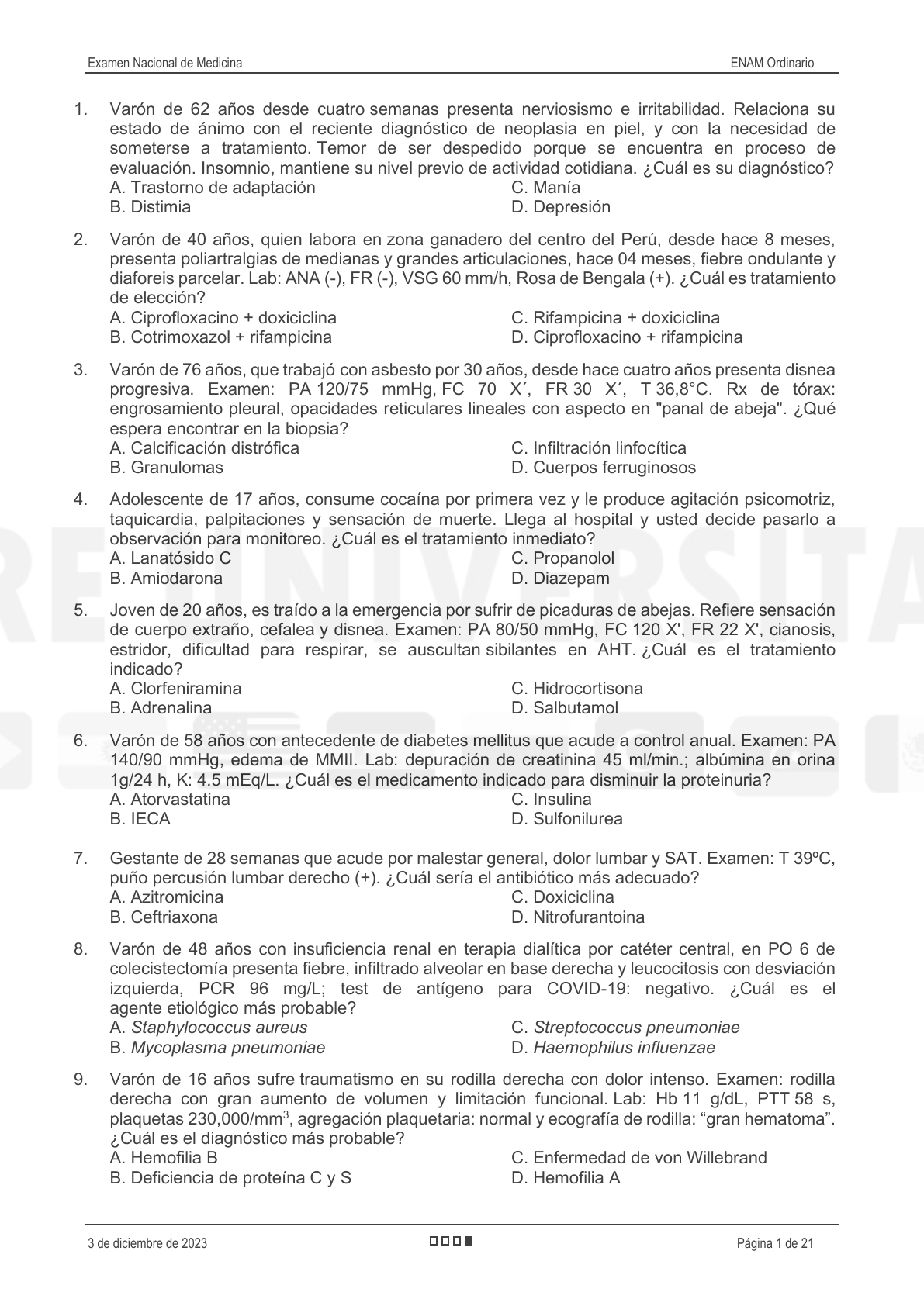 Examen Nacional de Medicina ENAM Ordinario 3 de diciembre de 2023 Página 1 de 21 1. Varón de 62 años desde cuatro semanas presenta nerviosismo e irritabilidad. Relaciona su estado de ánimo con el reciente diagnóstico de neoplasia en piel, y con la necesidad de someterse a tratamiento. Temor de ser despedido porque se encuentra en proceso de evaluación. Insomnio, mantiene su nivel previo de actividad cotidiana. ¿Cuál es su diagnóstico? A. Trastorno de adaptación B. Distimia C. Manía D. Depresión 2. Varón de 40 años, quien labora en zona ganadero del centro del Perú, desde hace 8 meses, presenta poliartralgias de medianas y grandes articulaciones, hace 04 meses, fiebre ondulante y diaforeis parcelar. Lab: ANA (-), FR (-), VSG 60 mm/h, Rosa de Bengala (+). ¿Cuál es tratamiento de elección? A. Ciprofloxacino + doxiciclina B. Cotrimoxazol + rifampicina C. Rifampicina + doxiciclina D. Ciprofloxacino + rifampicina 3. Varón de 76 años, que trabajó con asbesto por 30 años, desde hace cuatro años presenta disnea progresiva. Examen: PA 120/75 mmHg, FC 70 X´, FR 30 X´, T 36,8°C. Rx de tórax: engrosamiento pleural, opacidades reticulares lineales con aspecto en "panal de abeja". ¿Qué espera encontrar en la biopsia? A. Calcificación distrófica B. Granulomas C. Infiltración linfocítica D. Cuerpos ferruginosos 4. Adolescente de 17 años, consume cocaína por primera vez y le produce agitación psicomotriz, taquicardia, palpitaciones y sensación de muerte. Llega al hospital y usted decide pasarlo a observación para monitoreo. ¿Cuál es el tratamiento inmediato? A. Lanatósido C B. Amiodarona C. Propanolol D. Diazepam 5. Joven de 20 años, es traído a la emergencia por sufrir de picaduras de abejas. Refiere sensación de cuerpo extraño, cefalea y disnea. Examen: PA 80/50 mmHg, FC 120 X', FR 22 X', cianosis, estridor, dificultad para respirar, se auscultan sibilantes en AHT. ¿Cuál es el tratamiento indicado? A. Clorfeniramina B. Adrenalina C. Hidrocortisona D. Salbutamol 6. Varón de 58 años con antecedente de diabetes mellitus que acude a control anual. Examen: PA 140/90 mmHg, edema de MMII. Lab: depuración de creatinina 45 ml/min.; albúmina en orina 1g/24 h, K: 4.5 mEq/L. ¿Cuál es el medicamento indicado para disminuir la proteinuria? A. Atorvastatina B. IECA C. Insulina D. Sulfonilurea 7. Gestante de 28 semanas que acude por malestar general, dolor lumbar y SAT. Examen: T 39ºC, puño percusión lumbar derecho (+). ¿Cuál sería el antibiótico más adecuado? A. Azitromicina B. Ceftriaxona C. Doxiciclina D. Nitrofurantoina 8. Varón de 48 años con insuficiencia renal en terapia dialítica por catéter central, en PO 6 de colecistectomía presenta fiebre, infiltrado alveolar en base derecha y leucocitosis con desviación izquierda, PCR 96 mg/L; test de antígeno para COVID-19: negativo. ¿Cuál es el agente etiológico más probable? A. Staphylococcus aureus B. Mycoplasma pneumoniae C. Streptococcus pneumoniae D. Haemophilus influenzae 9. Varón de 16 años sufre traumatismo en su rodilla derecha con dolor intenso. Examen: rodilla derecha con gran aumento de volumen y limitación funcional. Lab: Hb 11 g/dL, PTT 58 s, plaquetas 230,000/mm3, agregación plaquetaria: normal y ecografía de rodilla: “gran hematoma”. ¿Cuál es el diagnóstico más probable? A. Hemofilia B B. Deficiencia de proteína C y S C. Enfermedad de von Willebrand D. Hemofilia A Examen Nacional de Medicina ENAM Ordinario 3 de diciembre de 2023 Página 2 de 21 10. Varón de 36 años, que sufre aplastamiento por caída de pared sobre los MMII, llega a la emergencia a las 2 horas del incidente presentando parestesias y dolor refractario a analgésicos. Examen: palidez, tumefacción muscular y pulso pedio ausente en miembro inferior izquierdo. ¿Cuál es el diagnóstico más probable? A. Embolismo graso B. Trombosis venosa C. Radiculopatía traumática D. Síndrome compartimental 11. Varón de 40 años que en su primer día postoperatorio de una hernioplastía inguinal, presenta dolor intenso en el escroto del mismo lado de la cirugía. Examen: aumento de volumen del testículo y dolor a la palpación. ¿Cuál es el diagnóstico probable? A. Orquitis B. Torsión testicular C. Gangrena de Fournier D. Absceso escrotal 12. Varón de 18 años, que acude porque hace 2 semanas presentó cuadro diarreico, desde hace dos días astenia y edema de MMII. Examen: PA 148/98 mmHg; FC 110 X'. Lab: examen de orina con hematíes y cilindros hemáticos, proteinuria 1,0 g/24 h. ¿Cuál es el diagnóstico? A. Infección del tracto urinario B. Síndrome nefrítico C. Insuficiencia renal aguda D. Síndrome nefrótico 13. En un distrito la lactancia materna exclusiva es menor de 50% por lo cual el personal del centro de salud del ámbito desarrolla un plan de comunicación educativa en salud dirigido a las gestantes. ¿Cuál de los elementos o estrategias de la Carta de Ottawa se implementa en este caso? A. Crear entornos favorables a la salud B. Fortalecer los servicios de salud C. Desarrollo de habilidades personales D. Fomento de acciones preventivas 14. Varón de 18 años, que presenta hace 24 h vómitos y deposiciones líquidas, como agua de lavado de arroz, sin moco, sin sangre asociado a calambres generalizados y oliguria. Examen: PA 100/50 mmHg, FC 100 X'; mucosa oral seca y aumento de peristaltismo abdominal. Lab: reacción inflamatoria en heces negativo. ¿Cuál es el organismo patógeno? A. Entamoeba histolytica B. Eschericha coli C. Vibrio cholerae D. Shigella spp 15. Se recibe neonato a las 34 semanas de EG, nacido por cesárea. A los 20 minutos de vida presenta taquipnea, aleteo nasal, cianosis, quejido espiratorio audible, tiraje intercostal y subcostal. Rx. tórax: parénquima con una granulación reticular fina difusa (aspecto en vidrio esmerilado). ¿Cuál es el diagnóstico probable? A. Taquipnea transitoria del RN B. Enfermedad de membrana hialina C. Neumonía neonatal D. Ductus arterioso per