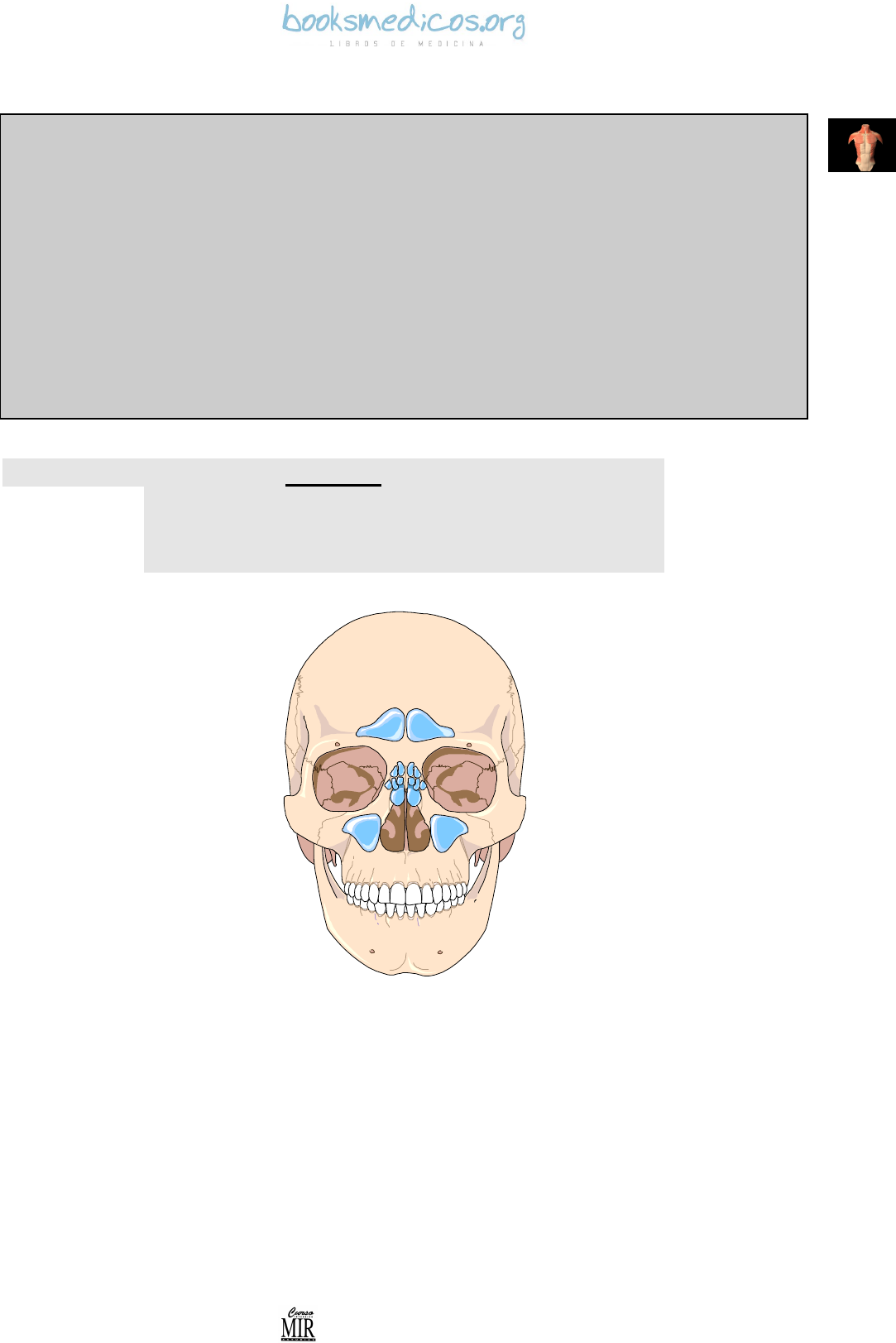 Capítulo I: Embriología Curso Intensivo MIR Asturias 13 CAPÍTULO I: EMBRIOLOGÍA ÍNDICE 1. ETAPAS DEL DESARROLLO 2. EMBRIOLOGÍA ESPECIAL 3. . http://booksmedicos.org Capítulo I: Embriología Curso Intensivo MIR Asturias 14 1. – ETAPAS DEL DESARROLLO El desarrollo prenatal se divide en etapas definidas por el desarrollo de ciertas características morfológicas. Con la unión del espermatozoide y el óvulo, se forma el cigoto. La edad real de un embrión o un feto es alrededor de dos se- manas menor que la fecha de la última menstruación, ya que la concepción tiene lugar unas dos semanas más tarde. Desde ese momento tienen lugar las siguientes etapas: 1. Segmentación: inicio de las divisiones mitóticas del cigoto. El tamaño final no cambia, porque los blastómeros se hacen cada vez más pequeños. 2. Mórula: Se produce la compactación de los blastómeros, que forman una estructura apretada con forma de pelota. 3. Blastocisto: En la mórula se forma una cavidad (la palabra “blastocisto” deriva del griego blastos=germen; kys- tis=vejiga). La masa central de células se denomina embrioblasto. 4. Gástrula: Se forma un disco embrionario con tres capas (ectodermo, mesodermo y endodermo). Ocurre hacia la tercera semana. 5. Néurula: Se forma la placa neural y se cierra, formando el tubo neural. Cuarta semana. 6. Embrión: Se suele utilizar este término desde la mitad de la segunda semana. Se refiere al desarrollo temprano, hasta la octava semana. Sólo funcionan el corazón y la circulación. 7. Feto: periodo posterior al embrionario (de la novena semana hasta el nacimiento). Primera Semana En la primera semana tiene lugar: - restablecimiento del número diploide de cromosomas - sexo cromosómico - inicio segmentación OJO Las semanas de la embriología se cuentan desde el momento de la fecundación y no con la fecha de última menstruación Capítulo I: Embriología Curso Intensivo MIR Asturias 15 Sangre materna Vellosisdad coriónica primaria Tallo de conexión Saco vitelino secundario Placa precordal Remanente del saco vitelino primario Epitelio endometrial Mesodermo somático extraembrionario Amnios Epiblasto hipoblasto Disco bilaminar embrionario Placa precordal Segunda Semana Estroma endometrial Secrección glandular Sincitiotrofoblasto Masa celular interna Cavidad del blastocisto Citotrofoblasto Hipoblasto (endodermo primario) Cavidad uterina Capítulo I: Embriología Curso Intensivo MIR Asturias 16 HOJAS EMBRIONARIAS Capítulo I: Embriología Curso Intensivo MIR Asturias 17 2. EMBRIOLOGÍA ESPECIAL 2.1. CABEZA Y CUELLO El desarrollo de la cabeza y el cuello tiene lugar a par- tid de los arcos branquiales o faríngeos, que son ba- rras de mesénquima separadas por unos surcos deno- minados hendiduras branquiales. En la porción más craneal del intestino anterior se forman unas evagina- ciones denominadas bolsas faríngeas, que se introdu- cen en el mesénquima sin llegar a unirse con las hendi- duras exteriores. Cada arco branquial o faríngeo posee un tejido mesenquimático cubierto externamente por ectodermo e internamente por endodermo. A esto se le añade tejido que migra desde la cresta neural. De cada arco faríngeo se desarrollan las siguientes estructuras: - I ARCO FARÍNGEO (mandibular): casi todas las estructuras del oído medio (martillo, yunque, mús- culo del martillo) además de la lengua, epiglotis y V par craneal. - II ARCO FARÍNGEO ( hioideo): partes del oído medio (estribo, apófisis estiloides y músculo del estribo) y VII par craneal. - III ARCO FARÍNGEO (faríngeo): músculo esti- lofaríngeo, asta mayor y porción inferior del cuer- po del hioides. IX par craneal. - IV y VI ARCO FARÍNGEO (laríngeo): casi todos los cartílagos de la laringe y faringe además del X pc. De las bolsas faríngeas de endodermo se desarrollan: - I BOLSA FARÍNGEA: cavidad timpánica, antro mastoideo y trompa faringotimpánica (de Eusta- quio). - II BOLSA FARÍNGEA: amígdala palatina. - III BOLSA FARÍNGEA: timo y paratiroides infe- riores - IV BOLSA FARÍNGEA: paratiroroides superio- res (descienden más que las derivadas de la III bolsa). De este modo tenemos que el oído medio deriva del I y II arcos faríngeos, y de la I bolsa faríngea (MIR). Techo del rombencéfalo Oído interno Condensación mesenquimática Primera hendidura faríngea Receso tubotimpánico Conducto auditivo externo Huesecillos del oído incluidos en el mesénquima laxo Pared del oído interno Cavidad timpánica primitiva Trompa de Eustaquio Desarrollo embrionario del oido medio MIR 04 (7995): ¿De dónde deriva embriológicamente el oído medio?: 1. Primera bolsa branquial. 2. Bolsa de Rathke. 3. Primer arco branquial. 4. Segunda bolsa branquial. 5. Primer surco branquial. ANULADA Capítulo I: Embriología Curso Intensivo MIR Asturias 18 CARA La cara se desarrolla a partir de 3 prominencias: fron- tonasal, maxilar y mandibular, que están formadas por mesodermo y revestidas por el ectodermo. OJO El ojo comienza a desarrollarse al surgir a cada lado del cerebro anterior unas evaginaciones denominadas surcos ópticos que darán lugar a las vesículas ópticas. Al ponerse en contacto con el ectodermo superficial, las vesículas ópticas promueven en éste los cambios necesarios para la formación de la placoda cristalinia- na. Ambas estructuras se invaginan. La vesícula óptica da lugar a las capas pigmentaria y nerviosa de la retina. La placoda cristaliniana forma el cristalino. En la cara inferior de la vesícula óptica se forma una invaginación por la que penetra la arteria hialóidea, que terminará siendo la arteria central de la retina. 2.2. APARATO RESPIRATORIO El aparato respiratorio se forma a partir de una evagi- nación de la pared ventral del intestino anterior. El endodermo origina el epitelio y glándulas traqueo bronquiales y el mesodermo forma el tejido conjunti- vo, cartílago, músculos, vasos sanguíneos o linfáticos. Del tubo laringotraqueal se origina la yema traquea