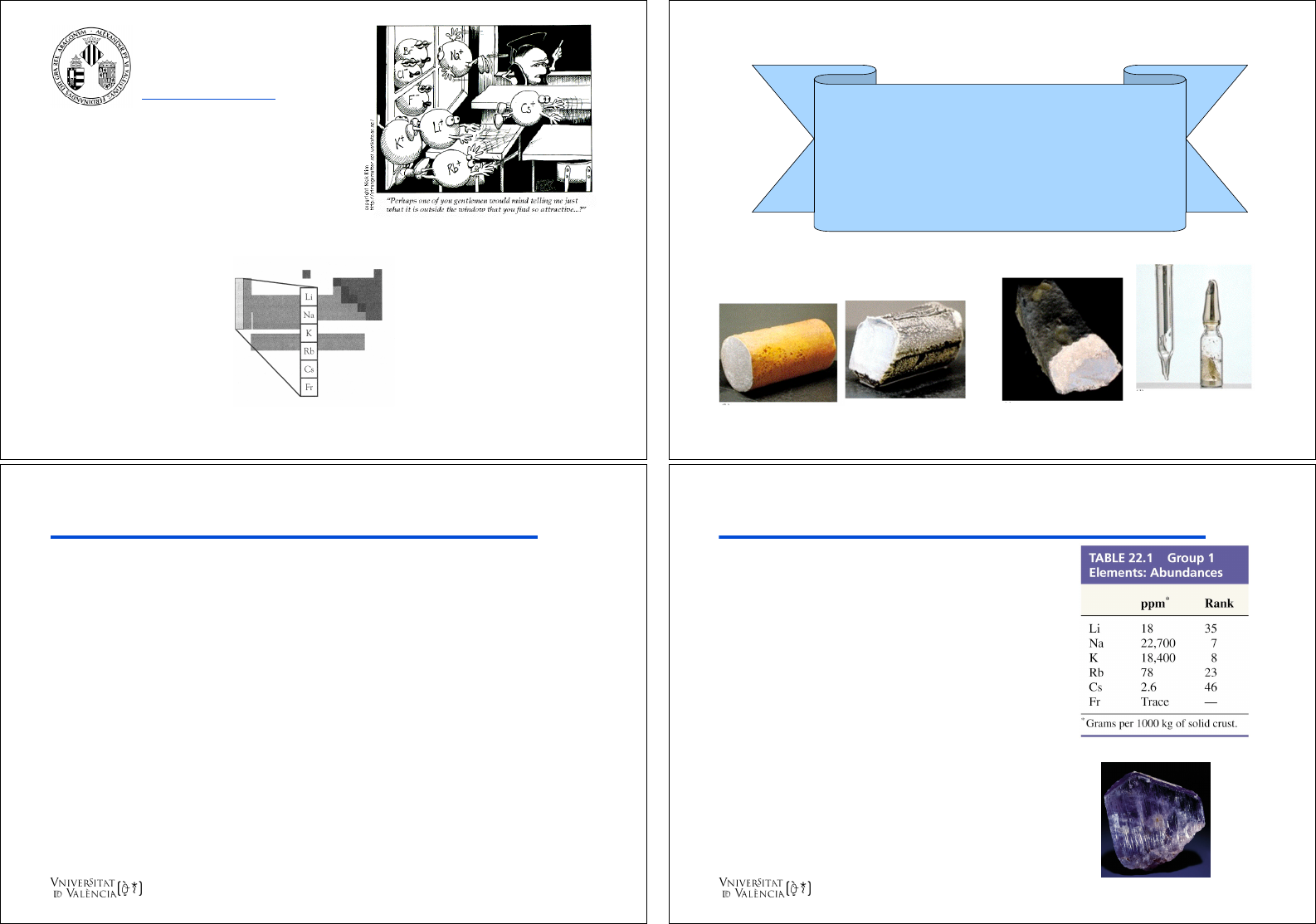 Módulo 12555- Química Inorgánica Título: Ingeniería Química Responsable: Juan José Borrás http://www.uv.es/~borrasj Curso 2006-07 Tema 9: Metales alcalinos En este tema nos ocuparemos de un grupo de metales de propiedades poco corrientes para ser metales. Los metales alcalinos tienen una muy baja densidad y son extraordinariamente reactivos El Fr es un elemento radioactivo Rb y Cs (se deben almacenar en contenedores sellados)PotasioNaLi Química Inorgánica _ Ingenieros T-3jueves, 14 diciembre 2006 Esquema del tema ! Propiedades generales del grupo ! Los elementos • Obtención y usos de los metales • Reactividad de los metales " Reactividad frente al aire " Reactividad frente al agua " Metales alcalinos y NH3 • Características y usos principales de los metales ! Compuestos principales • Óxidos e hidróxidos " NaOH: # Industrial cloro-alcali: diferentes métodos de obtención # Detergentes • Haluros • Sales terciarias " carbonatos, bicarbonatos. Método Solvay • y sulfatos ! Singularidad del Li. Relación diagonal con el Mg Química Inorgánica _ Ingenieros T-4jueves, 14 diciembre 2006 LiAl(SiO3)2 Abundancia y estado natural de los elementos ! Siempre aparecen en la naturaleza en forma combinada • en depósitos de sal • sales disueltas en el mar ! Compuestos más importantes • NaCl (sal común) • Na2SO4·10H2O (sal de Glauber) • Na2CO3 (sosa Solvay) • K2CO3 (potasa) • NaNO3 (nitrato de Chile) • Na2AlF6 (criolita) ! El Fr es un elemento radioactivo de vida media 21 minutos Química Inorgánica _ Ingenieros T-5jueves, 14 diciembre 2006 Obtención de los elementos ! Los metales son demasiado reactivos para ser encontrados libres en la naturaleza. Se aislaron tardíamente debido a las dificultades siguientes: • Sus compuestos son muy estables por lo que la obtención por descomposición térmica no es posible • Los metales son muy reductores por lo que no pueden obtenerse por reducción de los óxidos • La electrolisis de disoluciones acuosas no es posible porque los metales obtenidos reaccionan vigorosamente con el agua ! Deben ser obtenidos por electrolisis de sales fundidas (haluros). Se suele añadir otras sales para disminuir el punto de fusión ! El aislamiento o identificación de los elementos es relativamente reciente: • Sodio y potasio se obtuvieron por electrólisis (1807) • Li se descubrió en 1817 • Cs (1860) y Rb (1861) se identificaron a partir de los espectros de emisión • Francio (radioactivo) (1939) a partir del decaimiento del Ac radioactivo Química Inorgánica _ Ingenieros T-7jueves, 14 diciembre 2006 Propiedades generales del grupo Química Inorgánica _ Ingenieros T-8jueves, 14 diciembre 2006 Propiedades generales ! Todos ellos son metales: excelentes conductores de la electricidad y el calor • Na se utiliza como material de transferencia de calor en ciertos tipos de reactores nucleares ! Son metales blandos • Li se deja cortar con un cuchillo y el K se puede aplastar como la mantequilla ! Son los metales más reactivos cuando están puros • Son fuertemente reductores ! Estructura electrónica ns1. Los cationes alcalinos están presentes en una amplia variedad de compuestos químicos muy relevantes (entre los más sintetizados). ! Los cationes (con la excepción de Li+) tienen bajas densidades de carga • Esto permite explicar la buena solubilidad de las sales y la habilidad para estabilizar aniones que no pueden forman sales con otras especies catiónicas Química Inorgánica _ Ingenieros T-9jueves, 14 diciembre 2006 78291,87Cs 82391,53Rb 90640,86K 108980,97Na 1621800,53Li !H(atomización) (kJ·mol-1) Punto de fusión (ºC) Densidad (g·cm-3) Elemento Puntos de fusión (ºC) Propiedades generales ! Puntos de fusión muy bajos: disminuyen al descender en el grupo (Cs se funde en la mano) ! La blandura y los bajos puntos de fusión se correlacionan directamente con fuerzas de cohesión pequeñas o lo que es lo mismo entalpías de atomización bajas • ~400–600 kJ·mol-1 para un metal típico ! Li, Na y K tienen densidades inferiores a las del agua (poco frecuente en los metales) • El Li sería ideal para construir buques que no se hundieran…. • El problema es que serían muy blandos y que su elevada reactividad con el agua los destruiría al instante. Química Inorgánica _ Ingenieros T-10jueves, 14 diciembre 2006 Propiedades generales ! Al tener su EI tan baja los metales alcalinos se encuentran normalmente como especies monocatiónicas M+ formando normalmente compuestos iónicos ! Son elementos con un marcado carácter reductor • Se utiliza Na fundido para producir Zr y Ti de sus cloruros: " TiCl4(g) + 4 Na(l) --> 4 NaCl(s) + Ti(s) (Método van Arkel-de Boer) • Reaccionan con el agua reduciendo el H2O a H2: " 2 Na(s) + 2 H2O(l) --> 2 NaOH + H2(g) • Liberan sus electrones de valencia cuando se disuelven en amoníaco ! Reaccionan con la mayor parte de los no metales • Todos los alcalinos en estado fundido arden en Cl2(g) formando el cloruro del metal • Sólo el Li lo hace con el N2: " 6 Li(s) + N2(g) -->2 Li3N(s) • Reaccionan con el O2 dando diversos productos Química Inorgánica _ Ingenieros T-11jueves, 14 diciembre 2006 Reactividad frente al aire ! En cuanto entran en contacto con el aire se oxidan rápidamente perdiendo la lustrosa superficie metálica ! Pueden formar los óxidos (M2O), peróxidos (M2O2) o superóxidos (MO2) • Conforme aumenta la masa atomica, aumenta la tendencia a formar los superóxidos • El Li se oxida a Li2O que a su vez reacciona con el CO2 para dar el carbonato de litio (amarillo) " Li(s) + O2(g) --> 2 Li2O(s) " Li2O(s) + CO2(g) --> Li2CO3(s) • El Na forma mayoritariamente el peróxido " 2 Na(s) + 2 O2(g) --> Na2O2(s) • K, Rb y Cs forman los superóxidos MO2 Li Química Inorgánica _ Ingenieros T-12jueves, 14 diciembre 2006 Reacción del Na con O2 2 Na(s) + 2 O2(g) --> Na2O2(s) !H = - 504.9 kJ·mol -1 2Na(s) + 1 2 O2 150!200ºC " #"""" Na2O + 1 2 O2 300!