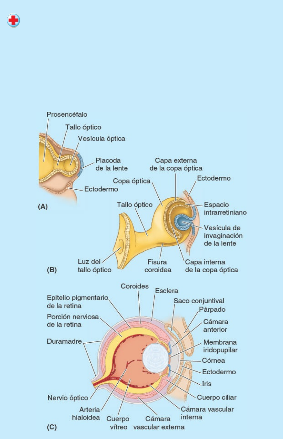 Desprendimiento de retina En el embrión, las capas de la retina en desarrollo están separadas por un espacio intrarretiniano (fig. C8-24 B). Durante el período fetal precoz se fusionan las capas y obliteran dicho espacio. Aunque la capa celular pigmentaria queda firmemente unida a la coroides, su fijación a la capa nerviosa no es firme. Por consiguiente, la retina puede desprenderse a causa de un golpe en el ojo (fig. C8-25). El desprendimiento de la retina suele producirse por filtración de líquido entre sus capas nerviosa y pigmentaria, quizás días o incluso semanas después deltraumatismo ocular. Los pacientes con desprendimiento de retina pueden tener la sensación de percibir resplandores de luz o manchas flotantes delante del ojo. 1639 https://booksmedicos.org https://booksmedicos.org booksmedicos.org Push Button0: