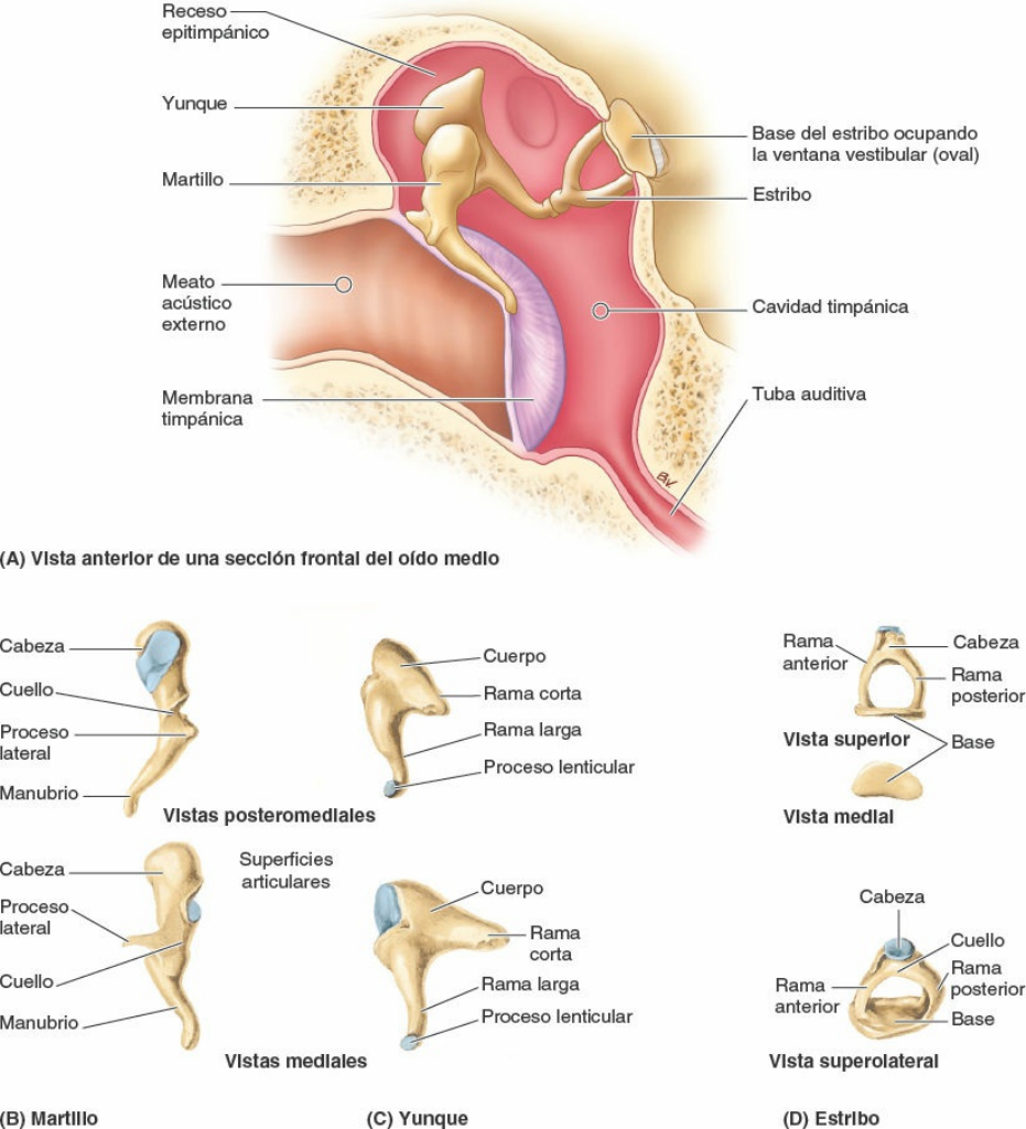 FIGURA 8-116. Huesecillos del oído. A) Huesecillos in situ. B a D) Detalles de cada uno de los huesecillos. El estapedio es un pequeño músculo situado dentro de la eminencia piramidal, una prominencia cónica hueca en la pared posterior de la cavidad timpánica (v. figs. 8-112 B y 8-114 B). Su tendón penetra en la cavidad timpánica tras emerger de un foramen puntiforme en el vértice de la eminencia, y se inserta en el cuello del estribo. El estapedio tracciona posteriormente del estribo y hace oscilar su base en la ventana vestibular, lo que tensa el ligamento anular y reduce la amplitud de oscilación. También previene el exceso de movimiento del estribo. El nervio del estapedio procede del nervio facial (NC VII). Oído interno El oído interno contiene el órgano vestibulococlear implicado en la recepción del 1743 https://booksmedicos.org https://booksmedicos.org 8 CABEZA Oído Oído interno booksmedicos.org Push Button0: