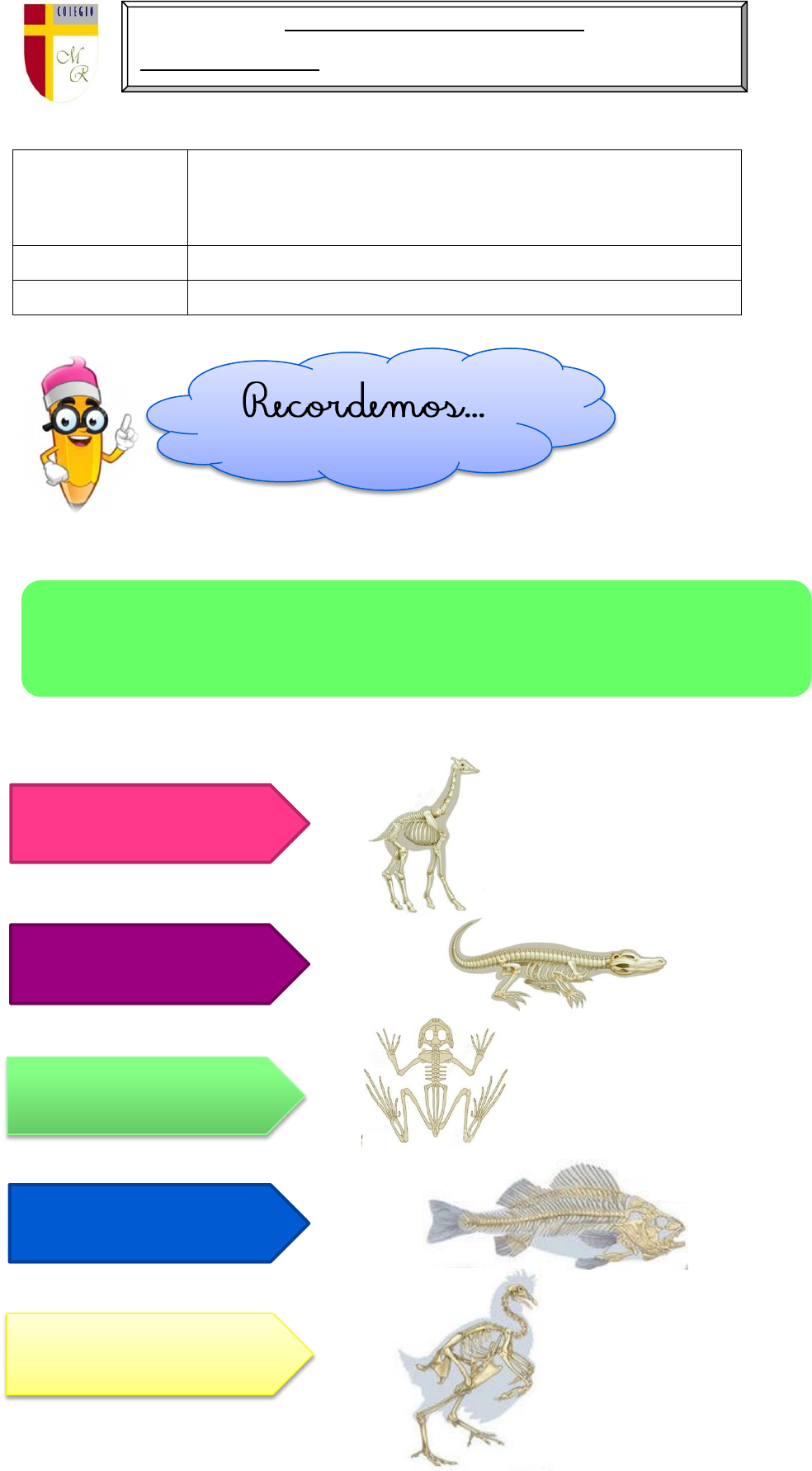 OA (OA 1) Observar, describir y clasificar los vertebrados en mamíferos, aves, reptiles, anfibios y peces, a partir de características como cubierta corporal, presencia de mamas y estructuras para la respiración, entre otras. Objetivo semanal Distinguir características de los anfibios y reptiles. Fechas Semana del 29 de junio al 03 de julio. Animales Vertebrados Existen 5 tipos de Animales Vertebrados Actividad Semanal Ciencias Naturales 2° Año Básico Docente de Asignatura: Karen Abarca Carreño Los Animales Vertebrados se caracterizan principalmente porque poseen columna vertebral y esqueleto. Esta estructura, otorga soporte, movilidad al cuerpo y protección a los órganos internos. Mamíferos Anfibios Peces Aves Reptiles Los anfibios son otro grupo de vertebrados. Los anfibios como ranas, sapos y salamandras tienen una piel húmeda, delgada y desnuda. No poseen escamas, ni pelos ni plumas. La gran mayoría de los anfibios nacen de huevos que fueron puestos en el agua. Cuando nacen, viven y nadan de una forma similar a los peces, respirando a través de branquias. Luego, cambian su cola y se les forman las patas traseras. En esta etapa de su vida, comienzan a vivir sobre la tierra. Ahora, respiran con pulmones y a través de su piel. Algunos ejemplos de anfibios que habitan en Chile son el sapo popeye, la rana jaspeada y la ranita de Darwin. Anfibios Tienen la piel húmeda, delgada y desnuda. Nacen de un huevo (Ovíparos). Cuando nacen respiran por branquias, al llegar a adultos lo hacen por los pulmones. La mayoría tiene cuatro extremidades en forma de patas. Anfibios Pueden desplazarse nadando si están en el agua, o saltando si están en la tierra. Las serpientes son animales vertebrados pues poseen huesos. Las serpientes pertenecen al grupo de los reptiles. También son reptiles las tortugas, cocodrilos y lagartijas. La gran mayoría de los reptiles son animales terrestres. Para respirar utilizan pulmones. Se reproducen por huevos que ponen sobre la tierra, y cuando nacen las crías, estas son iguales a los padres. Su piel está cubierta de escamas. Algunos reptiles que habitan en Chile son la lagartija esbelta, el gruñidor del sur y la culebra de cola larga. Reptiles Reptiles Tienen el cuerpo cubierto de escamas. Respiran por pulmones. Se reproducen por huevos La mayoría de los reptiles viven en la tierra pero hay algunos que son acuáticos. Algunos tienen cuatro extremidades en forma de patas y otras como las serpientes no tienen patas. Se desplazan reptando. Antes de trabajar, recuerda: Escribir fecha y objetivo de esta clase en el cuaderno de Ciencias Naturales. Observar el video que está publicado en la página de nuestro colegio, donde se explican y describen las actividades que se presentan a continuación. Por último, cuando termines las actividades, envía fotografías de lo realizado a mi correo karen.abarca@colegio-manuelrodriguez.cl, a mi WhatsApp +56964549343 o a tu profesora jefe, para conocer tus avances. Actividad 1. Observa los siguientes videos sobre los Anfibios y los Reptiles para conocer más acerca de estos animales vertebrados. https://www.youtube.com/watch?v=RRDbPK6DeCk Los anfibios para niños - Animales vertebrados - Ciencias naturales para niños https://www.youtube.com/watch?v=X2OSPe0d9u4 Los reptiles para niños - Animales vertebrados - Ciencias naturales para niños 2. Realizar actividad de lectura y exploración, en las páginas 44 y 45 en el texto de Ciencias Naturales, sobre las los Anfibios y los Reptiles, y responder preguntas planteadas en el cuaderno. 3. Completa el siguiente esquema en tu cuaderno con el nombre de los animales según corresponda. mailto:karen.abarca@colegio-manuelrodriguez.cl https://www.youtube.com/watch?v=RRDbPK6DeCk https://www.youtube.com/watch?v=X2OSPe0d9u4 4. Dibuja un anfibio e indica su nombre y sus características: - Cubierta corporal - Hábitat - Extremidades - Desplazamiento - Tipo de reproducción - Otros datos interesantes. 5. Resuelve las siguientes adivinanzas y dibuja en tu cuaderno el animal del que se habla. De colores verdetes somos, de ojos saltones y grandes, muy largas para saltar, tenemos las patas de atrás. Duro arriba, blando abajo, con mi cabeza alargada voy a paso de caracol. Muy larga, muy lisa, llevo puesta una bella camisa, entera bordada, sin costura y sin puntada. 6. Nombra y escribe en tu cuaderno 2 semejanzas y 2 diferencias entre los anfibios y los reptiles. Semejanzas Diferencias Responde de manera oral: Colegio Manuel Rodríguez Docente Karen Abarca Asistente Maciel Cabrera CIENCIAS 2º Ciencias naturales 2° básico semana del 29 de Junio al 3 de Julio. Objetivo de aprendizaje Observar, describir y clasificar los vertebrados en mamíferos, aves, reptiles, anfibios y peces, a partir de características como cubierta corporal, presencia de mamas y estructuras para la respiración, entre otras. Objetivo semanal Distinguir características de los anfibios y reptiles. Los ANIMALES VERTEBRADOS tienen columna vertebral y esqueleto. Esta estructura, otorga soporte, movilidad al cuerpo y protección a los órganos internos. Se clasifican en 5 grupos: MAMÍFEROS AVES ANFIBIOS REPTILES PECES Los Anfibios son animales vertebrados que se caracterizan por tener piel desnuda. Los anfibios se reproducen a través de huevos. Son animales acuáticos y la mayoría se desplaza nadando. Respiran mediante sus pulmones. ANFIBIOS Algunos ejemplos de anfibios que habitan en Chile son el sapo popeye, la rana jaspeada y la ranita de Darwin Desplazamiento: Se desplazan nadando o saltando Cubierta corporal: su piel es desnuda y húmeda Poseen: La mayoría tiene cuatro patas Cuando son adultos, respiran por pulmones Respiran mediante: Cuando nacen respiran por branquias Reproducción: Ovíparos (nacen a través de huevos) Hábitat: Acuático Y Terrestre Algunos reptiles que habitan en Chile son la lagartija esbelta, el gruñidor del sur y la culebra de cola larga. . Las serpientes son animales vertebrados 