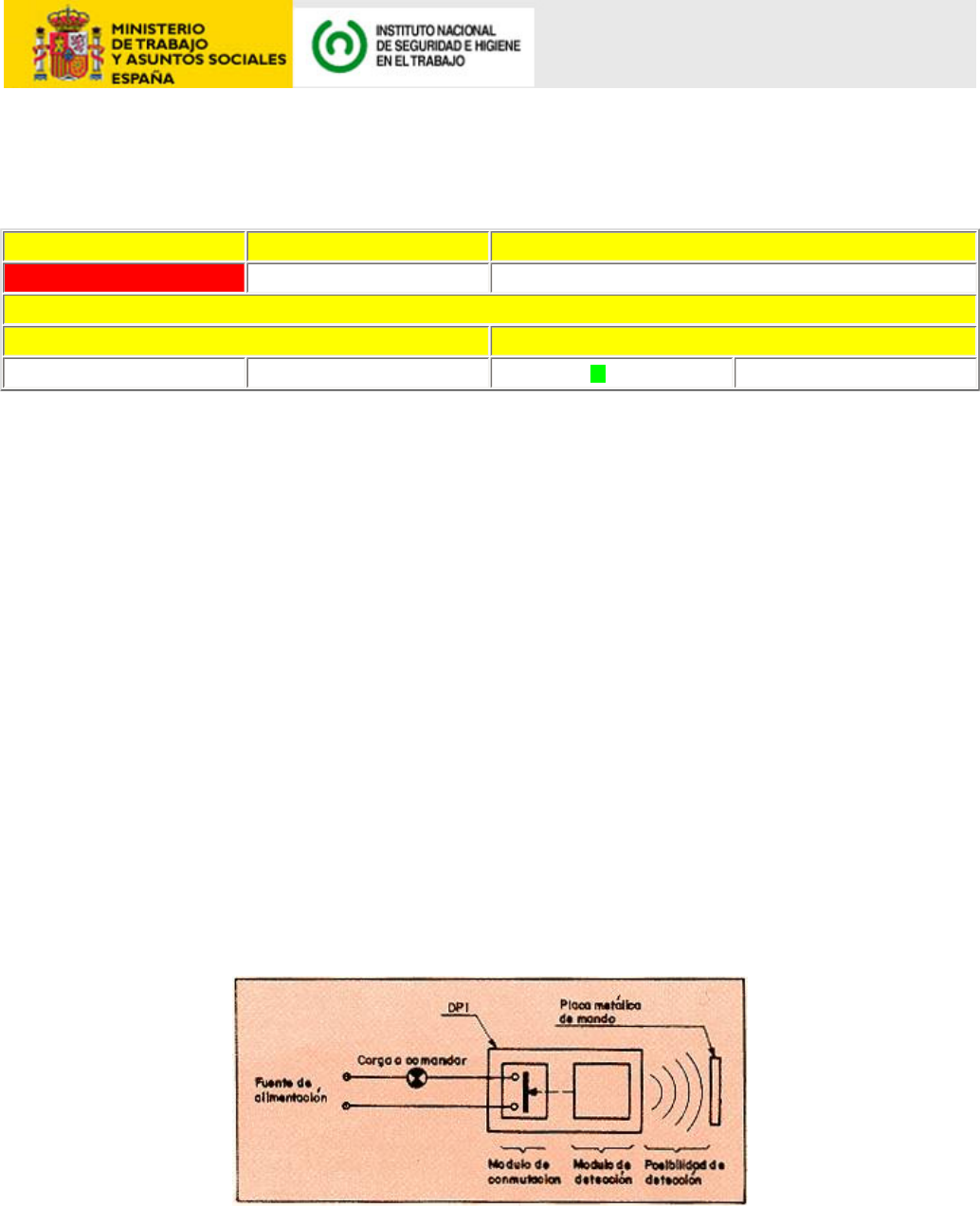 NTP 154: Detectores de proximidad inductivos Inductive proximity sensors Detecteurs de proximité inductifs Vigencia Actualizada por NTP Observaciones No válida ANÁLISIS Criterios legales Criterios técnicos Derogados: Vigentes: Desfasados: Sí Operativos: Redactor: Pedro Blanch Gonzálbez Ingeniero Industrial CENTRO DE INVESTIGACIÓN Y ASISTENCIA TÉCNICA - BARCELONA Generalidades Los detectores de proximidad inductiva (DPI) son detectores de posición electrónicos, que dan una señal de salida sin contacto mecánico directo. Formas de construcción más normales ● Forma cilíndrica - DIN-EN 50008 - corriente continua o bien DIN-EN 50036 - corriente alterna Diámetros - 10, 12,18 mm Grado protección normal IP - 67 (NTP-34) ● Forma cuadrada -según DIN-EN 50025 -corriente continua o bien DIN-EN 50036 - corriente alterna Grado de protección normal IP-65 ● Los interiores encapsulados aseguran la condición de doble aislamiento (NTP-71) Constitución Se distinguen tres partes fundamentales en los DPI. a. Módulo de detección La detección se fundamenta en el fenómeno de inducción electromagnética. El módulo de detección cumple tres funciones: ❍ Producir el campo magnético alterno de excitación. ❍ Detectar la energía degrada en la placa. ❍ Accionar el módulo de conmutación. El propio detector lleva incorporado un circuito oscilante L, R, C que produce el campo oscilante. Al acercar la placa varía la reluctancia magnética del conjunto, hasta que llega un momento en que la oscilación desaparece, detectándose la placa. La resistencia equivalente del circuito: Su variación en función de la posición de la placa es: b. Módulo de conmutación El módulo de conmutación puede tomar diversas formas, según está destinado a corriente continua o alterna. Las más comúnmente utilizadas son: Dando lugar a los modelos de dos y tres bornes de salida, estos últimos a extracción o inyección de corriente. c. Placa La placa influye notablemente en el funcionamiento del DPI, tanto por su material como por su forma y tamaño, que hacen variar las características de detección. Así suponiendo un valor 1 para el máximo de detección de un determinado aparato, se ve cómo afecta el material: Naturaleza placa Alcance Acero St - 37 1 Inox 0,85 Latón 0,50 Aluminio 0,45 Cobre 0,4 En función de la forma de espesor constante: Placa cuadrada-lado Alcance a 1 a/2 0,85 a/4 0,50 Definiciones geométricas Ataque lateral El ataque lateral es la aproximación de la placa de medida perpendicularmente al eje de referencia y en dirección al centro de la cara sensible. Ataque axial El ataque axial es la aproximación de la placa de medida centrada en el eje de referencia. Alcance El alcance es la distancia en que la aproximación de la placa de medida a la cara sensible determina el cambio de la señal de salida. Alcance nominal (SN) El alcance nominal es un dato convencional que sirve para designar el aparato sin tener particularmente en cuenta las dispersiones de fabricación, ni las diferencias debidas a las condiciones externas tales como tensión o temperatura. Alcance real (SR) El alcance real es el que resulta de medir el alcance de un aparato a la tensión de alimentación y temperatura nominal. Alcance útil (S) El alcance útil es el que resulta de medir el alcance de un aparato en condiciones específicas de temperatura y de tensión. Alcance de trabajo (Sa) El alcance de trabajo es el que asegura un cambio de estado de la señal de salida, en condiciones de temperatura y de tensión específicas. Puede escogerse entre cero y el límite inferior del alcance útil. Reproductibilidad La reproductibilidad es la precisión de reproducción de dos medidas efectuadas en el transcurso de un intervalo de tiempo específico, estando comprendidos la temperatura de la caja y la tensión en límites específicos. Carrera diferencial La carrera diferencial es la distancia entre el punto de acción, cuando se acerca la placa al detector de proximidad y el punto de relajamiento, cuando esta placa se aleja. Material sin amortiguación Un material sin amortiguación es aquél cuya influencia sobre las características normalizadas es inapreciable, ejemplo: materiales no conductores de electricidad. Condiciones de seguridad Del propio aparato Enclavamiento a la conexión Para evitar que el impulso de conexión del aparato provoque maniobras erróneas, se debe instalar un supresor del impulso de conexión, cuando sea necesario. Es decir, durante la puesta en tensión un detector de cierre no debe dejar pasar corriente por su carga si no está en presencia de la placa. Análogamente un detector de apertura no debe dejar pasar la corriente por su carga, en la conexión, estando en presencia de la placa. Protección contra errores de conexión Los DPI han de estar protegidos contra errores de cableado externo: ● 2 bornes - inversión de polaridad ● 3 bornes - una cualquiera de las 6 posibilidades Protección contra sobretensiones Las cargas inductivas y capacitivas de la red provocan perturbaciones; éstas pueden destruir el aparato provoca reacciones intempestivas. Por ejemplo, alimentación a base de transformador y filtrado, o bien elementos R-C de amortiguación conectados en paralelo con bobinas. Contra cortocircuitos Esta protección puede ser interna o externa, e incluso cíclica. Del Montaje Generales a. Una vez que el detector alcance la posición de trabajo, posición de detección asegurada, la placa permanecerá en esta posición y no recuperará su posición libre. b. La placa estará accionada directamente por medios mecánicos rígidos. c. No deben utilizarse detectores de imán permanente en maniobras de seguridad. d. Si los DPI carecen de medios propios de regulación, la placa (o accionador) montada en la máquina deberá ser regulable. A este fin no podrán usarse los taladros, alargados o no, de fijación del DPI. e. Si se necesitasen más contactos, se accionará un conta