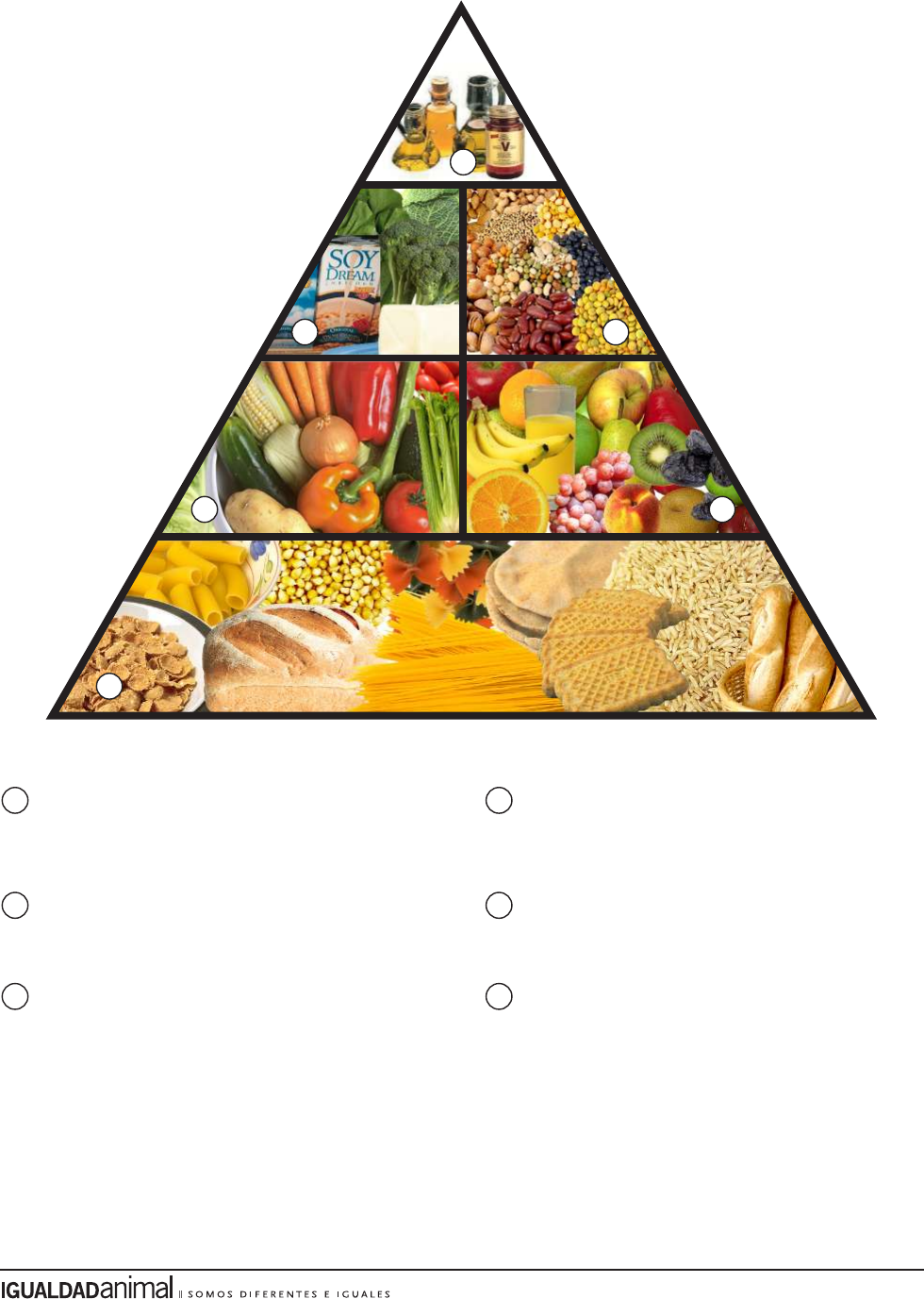 Consumir una cierta variedad de alimentos de todos los grupos, asegurando la obtención de suficientes nutrientes, fitoquímicos y fibra y haciendo las comidas más interesantes.. Limitar la utilización de grasas saturadas, aceites, azúcares añadidos y sal. Cereales (6-11 raciones): Pasta, arroz, pan, bollería, cereales de desayuno, trigo, maíz, avena, centeno, quinoa, amaranto, espelta, mijo, muësli, cous cous, etc. Verduras y hortalizas (3 o más raciones): Espinacas, col, berros, pimientos, tomates, acelgas, patatas, cebollas, apio, zanahorias, espárragos, coles, etc. Frutas y Frutos Secos (2 o más raciones): Naranjas, manzanas, plátanos, fresas, kiwis, uvas, mangos, aguacates, peras, albaricoques, nectarinas, orejones de albaricoque, ciruelas, higos secos, uvas pasas, etc. Alimentos ricos en calcio (6 a 8 raciones): Brócoli, espinacas, leche de soja enriquecida, tofu, margarinas vegetales, zumo de naranja enriquecido, higos secos, sésamo, tahini, melaza, etc. Legumbres o alternativas a éstas (2 a 3 raciones): Garbanzos, lentejas, soja, tempeh, tofu, judías de diversas clases, guisantes, pistachos, almendras, cacahuetes, etc. Otros esenciales (1 a 2 raciones): Aceite de oliva, girasol, lino, nueces, canola, productos enriquecidos con B12 como cereales de desayuno, leches vegetales, zumos, margarinas vegetales, hamburguesas vegetales, etc. suplemento de B12. Procurar consumir productos integrales ricos en minerales. Utilizar el agua de cocción de verduras para hacer sopas y cremas, aprovechando así los minerales y vitaminas. Beber entre 6 y 8 vasos de líquido al día. Desarrollar alguna actividad física cada día. Algunos consejos: Pirámide nutricional basada en los trabajos y estudios de Brenda Davis, Vesanto Melina & David Bousseau - Becoming Vegan. Ed. BPC - 2000 Raciones diarias aproximadas recomendadas de cada grupo de alimentos para un/a humano/a de talla corporal media y activo/a. Adaptar según necesidades y características individuales. Nota: Consultar reverso sobre qué conforma una ración. Para más información sobre nutrición vegana: http://www.igualdadanimal.org Pirámide de Alimentación Vegana (100% Vegetariana) 1 2 3 4 5 6 Una alimentación libre de productos de origen animal evita participar directamente en la explotación de éstos respetando así sus intereses justamente, y siendo además perfectamente sana y apta para tod@s. (tofu) 1 2 3 4 5 6 Los rangos en las raciones permiten diferencias de tamaño corporal, actividad, edad, etc. Por ejemplo, alguien pequeñ@ y poco activ@ necesita menos raciones que quien sea más grande y activ@. Grupo de Alimentos Raciones por día ¿Qué cuenta como una ración? Comentarios Importantes Otros esenciales: 1-2 raciones Ácido graso Omega-3 Vitamina B12 Ácido graso Omega-3: 1 cucharilla de aceite de lino 4 de aceite de canola 3 cucharadas de nueces 1 vaso (240 ml) de judías de soja Vitamina B12: Alimentos enriquecidos (cereales de desayuno, leches vegetales, zumos, etc.) y levadura de cerveza cultivada en un medio rico en B12 o un suplemento de B12. Presta atención a estos nutrientes importantes. La mejor fuente de Omega-3 para las personas veganas es el aceite de lino. Utilízalo en ensaladas, con vegetales, patatas y cereales. Puedes tomar un sumplemento de B12 para asegurarte que obtienes suficiente cantidad de esta vitamina de una forma sencilla. Cereales (pan, cereales de desayuno, müesli, pasta, arroz, trigo, centeno, cuscús, bulgur, quinoa, amaranto, etc.) 6-11 raciones 1 rodaja de pan Un bol de cereales de desayuno 1/2 de cereales cocinados, de arroz o pasta. Elije principalmente cereales integrales. Algunos ejemplos son el arroz integral, la quinoa, avena, trigo, centeno, así como panes y cereales integrales. Vegetales 3 o más raciones 1/2 vaso (120 ml) de vegetales 1 vaso (240 ml) de ensalada 3/4 de vaso (180 ml) de zumo Consume una amplia variedad de vegetales. Incluye vegetales crudos todos los días. Los vegetales verdes son buenas fuentes de folatos, y muchos también proveen de calcio. Fruta y frutos secos 2 o más raciones 1 1/2 manzana, plátano, naranja, pera 1/2 vaso (120 ml) fruta 3/4 vaso (180 ml) de zumo 1/4 vaso de frutos secos Consume una amplia variedad de fruta, incluyendo aquellas ricas en vitamina C. Los cítricos, fresas, kiwis, papaya, mangos y muchas otras frutas son ricas en vitamina C. Alimentos ricos en calcio 6-8 raciones 1/2 vaso (120 ml) de leche de soja enriquecida 1/4 vaso (60 ml) de tofu enriquecido 1/2 vaso (120 ml) de zumo de naranja enriquecido. 1/4 vaso (60 ml) de almendras 3 cucharadas (45 ml) de mantequilla de almendra 2 cucharadas (30 ml) de sésamo 1 vaso (240 ml) de vegetales verdes ricos en calcio (brócoli,col, espinacas, coles, berros, etc.) cocinados o 2 vasos (480 ml) si son crudos. 1 vaso (240 ml) de legumbres ricas en calcio 1/4 vaso (60 ml) de algas secas 1 cucharada (15 ml) de melaza 5 higos secos Muchos de estos alimentos son comunes a otros grupos (como el de vegetales y legumbres). Incluye alimentos ricos en calcio en cada comida. Legumbres o alternativas 2-3 raciones 1 vaso (240 ml) de legumbres cocidas 1/2 vaso (120 ml) de tofu o tempeh 1 hamburguesa vegetal 3 cucharadas (45 ml) de mantequilla de cacahuete o de otras semillas 1/4 vaso (60 ml) de nueces y semillas 2 vasos (480 ml) de leche de soja Para obtener el máximo beneficio, consume una amplia variedad de alimentos ricos en proteínas. Consumir vegetales o frutas ricos en vitamina C, con estos alimentos aumenta la absorción del hierro. Las nueces y semillas proveen vitamina E y minerales. 6 1 2 3 5 4 Pirámide de Alimentación Vegana (100% Vegetariana)