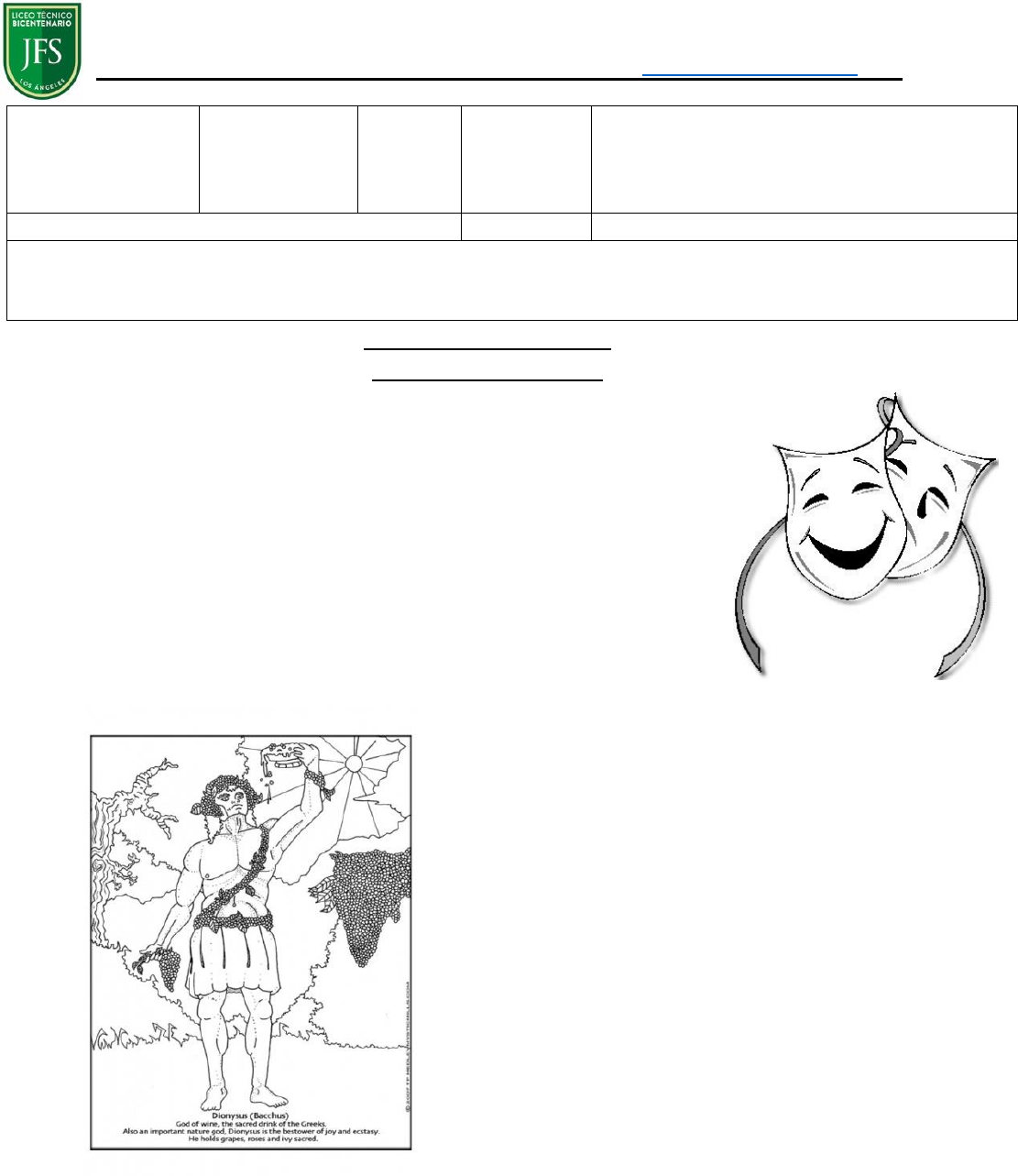 LICEO TÉCNICO BICENTENARIO JUANITA FERNÁNDEZ SOLAR Patricio Castro 1051 Teléfono 2324935 – 2320218 - Los Ángeles Web: www.liceotecnicolosangeles.cl Deparmento de Lengua y Literatura Guía de Aprendizaje: Género Dramático 2° medio Nombre Estudiante Profesor(a): Fecha Objetivo: Identificar elementos básicos del Género Dramático. Comprender la relevancia del Siglo de Oro en la representación teatral. GUÍA DE APRENDIZAJE: GÉNERO DRAMÁTICO 1. NOCIONES BÁSICAS SOBRE EL GÉNERO DRAMÁTICO Una característica básica del género dramático es que se presenta por medio del diálogo, es decir, no hay un narrador que ordene el argumento para nosotros los lectores, no vemos la mano del autor interviniendo directamente, sino que todo lo que ocurre en la obra se manifiesta a través del intercambio comunicativo entre los personajes de la obra. Dado esto, es posible que dos o más actores representen este diálogo en lo que conocemos como representación teatral. Esta característica es particular de las obras dramáticas (a diferencia de la narrativa y la lírica) y se denomina virtualidad teatral. 2. ORÍGENES Las primeras manifestaciones dramáticas conocidas en el mundo occidental, se realizaron en la antigua Grecia. Éste era entonces un pueblo campesino. En consecuencia, un elemento fundamental de su vida era el proceso de crecimiento y maduración de los frutos. Como todo pueblo primitivo, tenían una estrecha relación con la naturaleza y una visión religiosa también ligada a la tierra. Había un dios a quien se atribuía la bendición de tener un año próspero y de cosechar frutos abundantes y saludables. Para celebrar a Dionisio (dios de la fertilidad de la tierra, de la uva y el vino) se celebraban grandes fiestas, en las cuales muchos se disfrazaban y “actuaban” como ciertos personajes. Así surgieron las primeras manifestaciones artísticas relacionadas con este género. Los ditirambos o cantos a Dionisio, que, con el tiempo, pasaron de ser una canción improvisada a un verdadero himno coral con música y actuación mímica que posteriormente dio origen a la gran tragedia griega en el S VI a.c. 3. CARACTERÍSTICAS Representa un conflicto humano entre dos fuerzas contrarias. La temática puede ser muy variada: lucha de una mujer por independizarse, una conquista amorosa. Un conflicto contra un elemento externo (antagonismo o rivalidad) o una lucha interna (una angustia, una necesidad, etc) Para solucionar el conflicto los participantes llevan a cabo acciones. Lo cual es denominado acción dramática. 4. ACCIÓN DRAMÁTICA Organizada en torno a un conflicto, que implica la participación de los personajes. Por medio de la interacción de los personajes se nos presenta un mundo ficticio. http://www.liceotecnicolosangeles.cl/ LICEO TÉCNICO BICENTENARIO JUANITA FERNÁNDEZ SOLAR Patricio Castro 1051 Teléfono 2324935 – 2320218 - Los Ángeles Web: www.liceotecnicolosangeles.cl 5. ESTRUCTURA INTERNA DE LA OBRA DRAMÁTICA Presentación del conflicto Se produce cuando conocemos las partes que se oponen en la historia (las fuerzas antagónicas) y sus motivos. (1er acto) Desarrollo Es el momento en que cada una de las fuerzas lucha por conseguir su objetivo y vencer al otro. Son los actos intermedios, que van desde el inicio al final de la obra. En el desarrollo se identifican dos elementos: la tensión dramática, que es el momento mismo en que ambas fuerzas se enfrentan de modo directo, causando el clímax de la obra, lo que llevará a que – después – una de las dos resulte beneficiada. Asimismo, encontramos en esta fase el momento de distensión dramática, que es cuando baja la tensión del clímax y se relajan los ánimos para dar cabida al desenlace. Desenlace Una de las partes se impone y triunfa sobre la otra, logrando una solución al conflicto planteado al comienzo de la obra. (último acto) 5.1. EJEMPLO DE LA ESTRUCTURA INTERNA Estructura interna Romeo y Julieta Presentación del conflicto (Acto primero) En una riña se evidencia la discordia de las familias Montesco y Capuleto. Se presenta a los protagonistas: Romeo, agobiado por conflictos amorosos; y Julieta, oprimida por un matrimonio que se le impone. Al conocerse, nace un profundo amor que, internamente querrían concretar, pero que cuenta con un implacable antagonista, el odio entre ambas familias, encarnado en este acto por personajes como Teobaldo (sobrino de la señora Capuleto) y Benvolio (sobrino de Montesco) Desarrollo ( Actos segundo, tercero y primera parte del cuarto) Romeo y Julieta deciden concretar su matrimonio en secreto. Inmediatamente empiezan los conflictos, Mercucio (pariente y amigo de Romeo), muere a manos de Teobaldo, quien, a su vez, muere el enfrentarse con Romeo y a este último lo destierran. Esta pelea corresponde al clímax de la obra. Desenlace (Parte final de acto cuarto y todo el acto quinto) Julieta, desesperada, porque la obligan a casarse con Paris, bebe una pócima que la hace parecer muerta. Los esfuerzos por explicar al desterrado Romeo lo sucedido, fallan. Romeo, al creer que Julieta ha muerto, se quita la vida; y cuando esta despierta y ve a su amado muerto hace lo mismo. http://www.liceotecnicolosangeles.cl/ LICEO TÉCNICO BICENTENARIO JUANITA FERNÁNDEZ SOLAR Patricio Castro 1051 Teléfono 2324935 – 2320218 - Los Ángeles Web: www.liceotecnicolosangeles.cl 6. ESTRUCTURA EXTERNA Acto Cada una de las partes en que se divide la obra. Está delimitado por la abertura y cierre del telón. Época antigua: eran tres (presentación, desarrollo, desenlace) Época moderna: a elección del autor. Cuadro Es el ambiente físico en que se desarrolla la acción. (en teatro escenografía) Escena Unidad dramática limitada por la entrada y salida de un personaje. 7. EL LENGUAJE DRAMÁTICO En el lenguaje dramático predomina la función del lenguaje apelativa y utiliza el estilo directo, reproduciendo el diálogo de los personajes directamente. Pero, además de ello, dentro del 