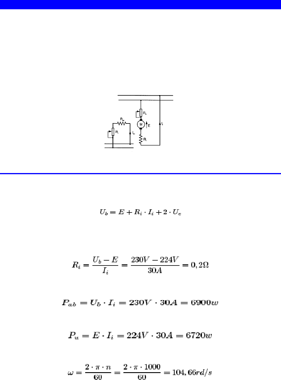 Unidad 5. Principios de Máquinas Problemas propuestos. Soluciones. Tema 4. Motores eléctricos 1 Problemas resueltos Problema 1. Un motor de c.c (excitado según el circuito del dibujo) tiene una tensión en bornes de 230 v., si la fuerza contraelectromotriz generada en el inducido es de 224 v. y absorbe una corriente de 30 A. (se desprecian la reacción de inducido y las pérdidas mecánicas). Calcular: a) Resistencia total de inducido. b) Potencia absorbida de la línea. c) Potencia útil en el eje. d) Par nominal si el motor gira a 1000 r.p.m. e) Rendimiento eléctrico. Solución Del esquema sabemos que la excitación del motor es independiente. La ecuación eléctrica del circuito equivalente sería: Consideramos despreciable la caída de tensión en las escobillas, por lo que podremos escribir: a) b) c) d) El par lo obtenemos a partir de la potencia útil y la velocidad de giro. Unidad 5. Principios de Máquinas Problemas propuestos. Soluciones. Tema 4. Motores eléctricos 2 e) Por lo que el rendimiento será η=97,39%. Problema 2. De un motor de c.c. de excitación derivación tiene una potencia de 40 C.V., se sabe que las pérdidas del motor son del 5% de su potencia en el eje. Si Ub=400 v., Rd=0,2 Ω y Ri=0,1 Ω. Calcular: a) Intensidad en la línea. b) Intensidad de excitación. c) Intensidad de cortocircuito. d) Valor del reóstato de arranque para que en ese régimen no se supere el valor de intensidad 2 In. e) Par motor si gira 1500 r.p.m. Solución. a) b) c) En el momento del arranque la velocidad es nula, por lo que la fcem también será nula. d) Al intercalar una resistencia de arranque en serie con el inducido para limitar el valor de la intensidad, se tendrá: Unidad 5. Principios de Máquinas Problemas propuestos. Soluciones. Tema 4. Motores eléctricos 3 e) El par lo obtenemos a partir de la potencia útil y la velocidad de giro. Problema 3. Un motor eléctrico de corriente continua con excitación en derivación que tiene las siguientes características: Tensión alimentación U= 600 V, resistencia del devanado de excitación Rexc = 600 Ω. Resistencia del inducido Ri = 0,1 Ω. Intensidad absorbida de la red Iabs = 138 A. Potencia útil 100 CV. Determine: a) La intensidad de excitación y la intensidad del inducido. b) Rendimiento del motor. c) El par útil cuando el motor gira a 1200 rpm. Nota: Despreciar en este problema la caída de tensión en las escobillas y la resistencia del reóstato de arranque y de los polos auxiliares. Solución. a) b) Unidad 5. Principios de Máquinas Problemas propuestos. Soluciones. Tema 4. Motores eléctricos 4 c) Problema 4. Un motor de c.c. excitación serie de tensión en bornes 230V., gira en régimen nominal a 1200 r.p.m. El devanado inducido tiene una resistencia de 0,3Ω, y la del devanado de excitación es de 0,2 Ω, la resistencia de los polos auxiliares es de 0,02Ω y su fcem es de 220 V. Determinar: a) Corriente en el momento del arranque. b) Intensidad absorbida de la línea. c) Potencia absorbida de la red. d) Pérdida de potencia en los devanados. e) Rendimiento del motor. Solución. a) Como en el momento del arranque la velocidad es nula, eso hace que también sea nula la fcem, por lo que tendremos la expresión: b) Unidad 5. Principios de Máquinas Problemas propuestos. Soluciones. Tema 4. Motores eléctricos 5 Al ser un motor con excitación serie, tal como se ve en el circuito la corriente de inducido es la misma que la de excitación y es la absorbida de la red, por lo que: c) d) e) Como no tenemos información acerca de las pérdidas mecánicas y en el hierro, vamos a considerar que la potencia útil es la potencia eléctrica interna, y así tendremos: Por lo que el rendimiento será del 95,96%. Problema 5. Un motor de c.c. excitación derivación tiene una tensión de alimentación de 120 V, la potencia que absorbe de la red es de 3,6 Kw, cuando gira en un régimen a 1000 r.p.m. presenta un rendimiento del 80%, y la resistencia del devanado de excitación es 30 Ω. Determinar: a) Fuerza contraelectromotriz. b) Resistencia del devanado del inducido. c) Par útil en el eje. Solución. a) Calculamos las intensidades a partir de la potencia absorbida de la red. Unidad 5. Principios de Máquinas Problemas propuestos. Soluciones. Tema 4. Motores eléctricos 6 En el enunciado no se comenta que existan pérdidas en el hierro, ni mecánicas, por lo que solamente consideraremos las pérdidas en el cobre, que son las únicas que podemos calcular. A partir del rendimiento podemos calcular la potencia eléctrica interna. b) c) A partir de la velocidad de giro en el eje y de la potencia útil, calculamos el par. Problema 6. Un motor de c.c. excitación compound larga tiene las siguientes características: Tensión en bornes 150 V, resistencia de inducido 0,21 Ω resistencia de excitación serie, resistencia de excitación derivación 20 Ω, en régimen nominal gira a 1000 r.p.m. genera una fcem de 120 V y suministra una potencia mecánica de 4800w. Calcular: a) Intensidades de corriente en sus bobinados. b) Resistencia de excitación serie. c) Par motor y rendimiento del motor. Solución. a) A partir del esquema eléctrico adjunto calculamos las intensidades que recorren los devanados del motor. Unidad 5. Principios de Máquinas Problemas propuestos. Soluciones. Tema 4. Motores eléctricos 7 b) c) El par lo calculamos a partir de la velocidad de giro y la potencia útil, como no mencionan pérdidas en el hierro ni mecánicas, consideramos que la potencia útil en el eje es igual a la potencia mecánica interna e igual a la potencia eléctrica interna. Problema 7. Para una determinada aplicación se requiere un motor de elevado par de arranque, por lo que se elige un motor en serie que proporciona 18 CV a 1 500 rpm, cuando se conecta a 220 V, absorbe 67 A. Se sabe que Ri+Rp=0,35 Ω, Rs=0,05 Ω y Ve=1 V. Determina: a) ¿Cuál será su velocidad, si la corriente absorbida aumenta un 30 %? b) ¿Cuál será su velocidad, si la corr