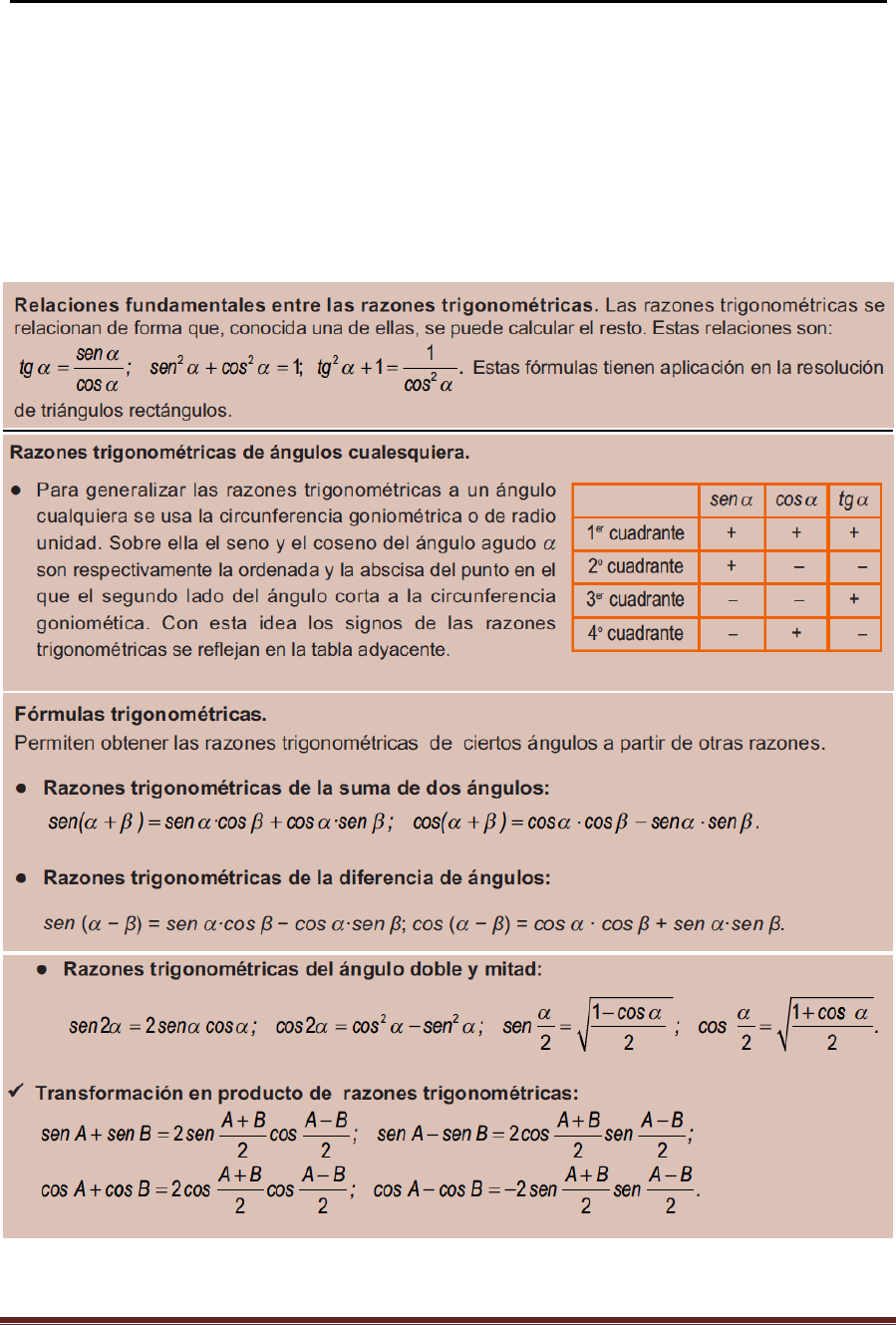 MATEMATICAS I Unidad 5; Fórmulas y funciones trigonométricas Unidad 5: Fórmulas y funciones trigonométricas Página 1 Unidad 5: FÓRMULAS Y FUNCIONES TRIGONOMÉTRICAS La característica que llama más la atención al alumno cuando estudia trigonometría es la enorme cantidad de fórmulas que tiene que aprender o memorizar. Localiza en tu libro de texto, o apuntes, las formulas trigonométricas que aparecen resaltadas como importantes. Allí hallarás una demostración y explicación de cómo se utilizan. Estas son algunas de las más utilizadas: Presta atención al ejemplo que aparece resuelto en este video. MATEMATICAS I Unidad 5; Fórmulas y funciones trigonométricas Unidad 5: Fórmulas y funciones trigonométricas Página 2 Video 5 – 1 – a : https://www.youtube.com/watch?v=KNKtro9N0nE Presta atención a la resolución del ejercicio de simplificación que aparece en el siguiente video. Video 5 – 2 – a : https://www.youtube.com/watch?v=_7SVKP74Pn4 Presta atención a la resolución de todos los ejercicios de simplificación que aparecen en el siguiente video. Video 5 – 2 – b : https://www.youtube.com/watch?v=8sN8sXqjl-A https://www.youtube.com/watch?v=KNKtro9N0nE https://www.youtube.com/watch?v=_7SVKP74Pn4 https://www.youtube.com/watch?v=8sN8sXqjl-A MATEMATICAS I Unidad 5; Fórmulas y funciones trigonométricas Unidad 5: Fórmulas y funciones trigonométricas Página 3 Ejercicio 5 – 1.- (IDENTIDADES TRIGONOMÉTRICAS) Copia en tu cuaderno la resolución de los ejercicios de identidades trigonométricas que aparecen en el siguiente video. Video 5 – 3 – a : https://www.youtube.com/watch?v=He7SY4kFDVA Ejercicio 5 – 2.- (IDENTIDADES TRIGONOMÉTRICAS) Copia en tu cuaderno la resolución de los ejercicios de identidades trigonométricas que aparecen en el siguiente video. Video 5 – 3 – b : https://www.youtube.com/watch?v=A5mcbFkMJR0 Aquí tienes otro ejemplo de la resolución de un ejercicio de identidades trigonométricas que aparece en el siguiente video. Video 5 – 3 – c : https://www.youtube.com/watch?v=Yu63ixRvXkY https://www.youtube.com/watch?v=He7SY4kFDVA https://www.youtube.com/watch?v=A5mcbFkMJR0 https://www.youtube.com/watch?v=Yu63ixRvXkY MATEMATICAS I Unidad 5; Fórmulas y funciones trigonométricas Unidad 5: Fórmulas y funciones trigonométricas Página 4 Y otro ejemplo más de la resolución del ejercicio de identidades trigonométricas que aparece en el siguiente video. Video 5 – 3 – d : https://www.youtube.com/watch?v=5FioTmDE5Ho Ejercicio 5 – 3.- (IDENTIDADES TRIGONOMÉTRICAS) Ahora una para ti sin video de ayuda. Demuestra la siguiente identidad: https://www.youtube.com/watch?v=5FioTmDE5Ho MATEMATICAS I Unidad 5; Fórmulas y funciones trigonométricas Unidad 5: Fórmulas y funciones trigonométricas Página 5 Las ecuaciones trigonométricas son muy variadas. Te pido que resuelvas las más sencillas. En primer lugar te muestro unas cuantas resueltas por mí mismo. Ejemplo 1.- (ecuación de primer grado) i) Averigua los ángulos que cumplen la ecuación sen x = 0,4 ii) Averigua los ángulos que cumplen la ecuación sen x = - 0,4 iii) Averigua los ángulos que cumplen la ecuación cos x = 0,4 iv) Averigua los ángulos que cumplen la ecuación cos x = - 0,4 v) Averigua los ángulos que cumplen la ecuación tan x = 0,4 vi) Averigua los ángulos que cumplen la ecuación tan x = - 0,4 Solución: Este tipo de ecuaciones tiene como máximo dos soluciones. La calculadora científica nos permite averiguar una solución, la otra la averiguamos con un truco. Las resolveremos en grados; si el ejercicio pidiera la solución en radianes pues no hay problema, después los pasaríamos a radianes, como hemos visto en el ejercicio 1. i) SHIFT SEN-1 0,4 = y las calculadora nos da una solución 23º34º41º Este ángulo está situado en el primer cuadrante donde los valores de seno son positivos. El otro ángulo estará en el segundo cuadrante, donde también los valores de seno son positivos. Este ángulo es 180 – A. Soluciones: 23º34º41º y 180 - 23º34º41º = 156º25º19º ii) SHIFT SEN-1 - 0,4 = y las calculadora nos da una solución. -23º34º41º Este ángulo está situado en el cuarto cuadrante donde los valores de seno son negativos. El otro ángulo estará en el tercer cuadrante, donde también los valores de seno son negativos. Este ángulo es el complementario 180 – A. Soluciones: - 23º34º41º y 180 – (-23º34º41º) = 203º34º41º. Pero el ángulo negativo no se suele utilizar y lo pasamos a positivo sumándole 360º, y obtenemos 360 + (-23º34º41º) = 336º25º19º iii) SHIFT COS-1 0,4 = y las calculadora nos da una solución.87º42º27º. Este ángulo está situado en el primer cuadrante donde los valores de coseno son positivos. El otro ángulo estará en el cuarto cuadrante, donde también los valores de coseno son positivos. Este ángulo es 360 – A. Soluciones: 87º42º27º. y 360 - 87º42º27º = 272º17º33º iv) SHIFT COS-1 - 0,4 = y las calculadora nos da una solución.113º34º41º Este ángulo está situado en el segundo cuadrante donde los valores de coseno son negativos. El otro ángulo estará en el tercer cuadrante, donde también los valores de coseno son negativos. Este ángulo es el complementario 360 – A. Soluciones: 113º34º41º y 360 - 113º34º41º = 246º25º19º v) SHIFT TAN -1 0,4 = y las calculadora nos da una solución. 21º48º5º MATEMATICAS I Unidad 5; Fórmulas y funciones trigonométricas Unidad 5: Fórmulas y funciones trigonométricas Página 6 Este ángulo está situado en el primer cuadrante donde los valores de tangente son positivos. El otro ángulo estará en el tercer cuadrante, donde también los valores de tangente son positivos. Este ángulo es 180 + A. Soluciones: 21º48º5º y 180 + 21º48º5º = 201º48º5º vi) SHIFT TAN-1 - 0,4 = y las calculadora nos da una solución. -21º48º5º Este ángulo está situado en el cuarto cuadrante donde los valores de tangente son negativos. El otro 