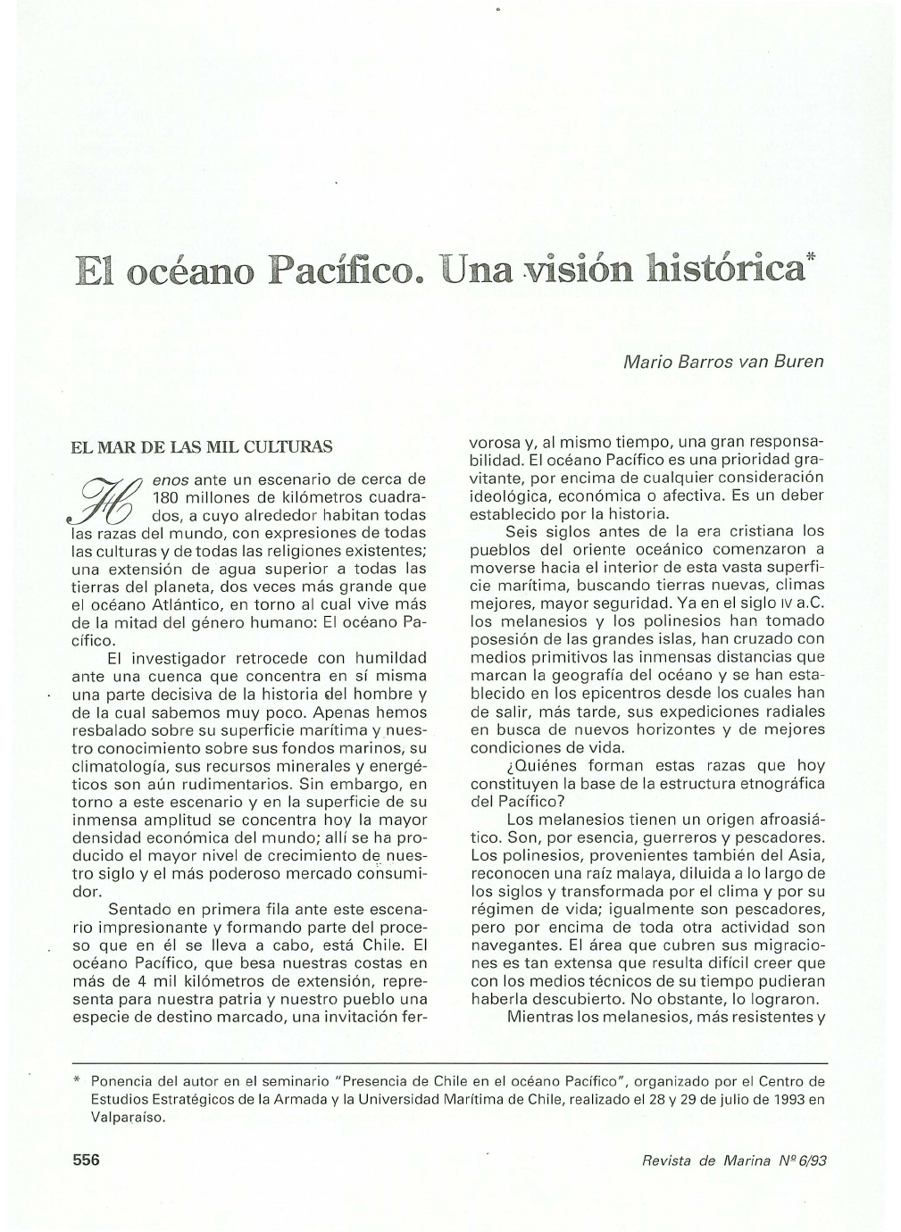 El océano Pacifico. Una visión h 61 stórica* EL MAR DE IAS MIL CULTURAS enos ante un escenario de cerca de 180 millones de kilómetros cuadra- dos, a cuyo alrededor habitan todas las razas del mundo, con expresiones de todas las culturas y de todas las religiones existentes; una extensión de agua superior a todas las tierras del planeta, dos veces más grande que el océano Atlántico, en torno al cual vive más de la mitad del género humano: El océano Pa- cífico. El investigador retrocede con humildad ante una cuenca que concentra en sí misma una parte decisiva de la historia '1e l hombre y de la cual sabemos muy poco. Apenas hemos resba lado sobre su superfici e marítima y nues- tro conocimiento sobre sus fondos marinos, su climatología, sus recursos minerales y energé- t icos son aún rudimentarios . Sin embargo, en torno a este escenario y en la superficie de su inmensa amplitud se concentra hoy la mayor densidad económ ica del mundo; allí se ha pro- ducido el mayor nivel de crecimiento de. nues- tro siglo y el más poderoso mercado consumi- dor. Sentado en primera fila ante este escena- rio impresionante y formando parte del proce- so que en él se lleva a cabo, está Chile. El océano Pacífico, que besa nuestras costas en más de 4 mil kilómetros de extensión, repre- senta para nuestra patria y nuestro pueblo una especie de dest ino marcado, una inv itación fer- Mario Barros van Buren vorosa y, al mismo tiempo, una gran responsa- bilidad. El océano Pacífico es una prioridad gra- v itante, por encima de cualquier cons ideración ideológica, económica o afectiva. Es un deber establec ido por la historia. Seis siglos antes de la era cristiana los pueblos del oriente oceánico comenzaron a moverse hacia el interior de est a vasta superfi- cie marítima, buscando t ierras nuevas, climas mejores, mayor seguridad. Ya en el siglo IV a.C. los melanesios y los polinesios han tomado posesión de las grandes islas, han cruzado con medios primitivos las inmensas distancias que marcan la geografía del océano y se han esta- blecido en los epicentros desde los cua les han de salir, más tarde, sus expediciones radiales en busca de nuevos horizontes y de mejores condiciones de vida. ¿Quiénes forman estas razas que hoy co nstituyen la base de la estructura etnográfica del Pacífico? Los melanesios tienen un origen afroasiá- tico. Son, por esencia, guerreros y pescadores. Los polinesios, provenientes también del Asia, reconocen una raíz malaya, diluida a lo largo de los siglos y transformada por el clima y por su régimen de v ida; igua lmente son pescadores, pero por encima de toda otra actividad son navegantes . El área que cubren sus migracio- nes es tan extensa que resulta difícil creer que con los medios técnicos de su tiempo pudieran haberla descubierto . No obstante, lo lograron. Mientras los melanesios, más resistentes y * Ponencia del auto r en el seminario " Presencia de Chile en el océa no Pacífico " , organizado por el Centro de Estudios Estratég icos de la Armada y la Universidad Marítima de Chile, realizado el 28 y 29 de juli o de 1993 en Valparaíso. 556 Revista de Marina NQ 6/93 feroces, se afirmaron en las t ier ras obtenidas, los po lines ios se desplazaron hacia los extre- mos de l océano Pacífico, eludiendo las invasio- nes que otros pueblos de mayor cultura o de mayor poder efectuaron en los sig los VI y v 11 de nuestra era . Estos pueblos fueron los chinos y sus parientes los thais, que comenzaro n a ex- plorar y a ocupar las áreas terrestres del gran océano, cuando todavía Europa era una trans i- ción sombría entre las invasiones bárbaras y los despojos de la v ieja cu ltura grecorromana. Estos nuevos invasores traían consigo una cultura muy alta y un prog reso técnico adm ira- bl e, pero substancialmente distinto a los va lo- res esp iritua les de los po lines ios. La tradición cuenta que desde Samoa partió el éxodo de estas razas hacia los cuat ro puntos cardinales de la periferia oceáni ca. Por el norte llegaron a las islas de Hawai, por el sur hasta las islas de Cook y Nueva Zelanda y por el este hasta la so litaria Rapa-Nu i, después de poblar el archi- pi élago de Tahiti. Se ha formado así el gran triá ngu lo po li nés ico que hoy nos asombra, cu - yas manifestaciones habrían de influir fuerte- mente en los pueblos vec inos, sirv iendo -al mismo t iempo- de recios lazos de unidad en- tre aque ll as com unidades dispersas por todo el CH IN A 1 N DI A ":80N1 N :·VOLCANO EL OCEANO PACIFICO. UNA VISION HISTORICA océano Pacífico y separadas por miles de millas marinas. 1A HORA DE ESPAÑA El año 1513, Vasco Núñez de Balboa admi- ra por primera vez el océano Pacífico y toma posesión de él en nombre de los reyes cató- licos. Apenas siete años más tarde, un portu- gués al servic io de España, Hernando de Maga- ll anes, une con sus naves los océanos Atlánti co y Pacífico y navega éste en cas i toda su exten- sión, para morir en él. Su expedición es la pr i- mera en dar la vuelta al globo terrestre y ll evar a la Corte españo la la nueva de este inmenso mundo que, al decir de aq uellos va lerosos na- vega ntes, se encuentra abierto al expansionis- mo español , no sólo para las perspectivas co- merci ales si no también para la propagación de la fe cristiana . El sig lo XVI es el de la hegemonía españo la. Son sus velas, con sus rojas cruces de Malta y los pendones morados de Castilla los que han de lanzarse, con un ímpetu irres istib le, hacia esos horizontes desconocidos para el europeo y a la conqu ista de estos pueb los sencillos y ·· -· .,H AWA I ~ILIP IH AS IM_ARIA NA~ / ',, 69,q, / ' I ~IMIIIDMIA:Ü. CAROLINA$ / ' ' ·~<; <7 tt PALAOS G ILBE RT / ·LINE '-, 4i1 ,2;º .,- ~ ., B lRMAAC , / '-., :'\ o 1 ~ · <ic:i.. GIJ. § PH OENIX "\. ~ 1 /-0.1).A,~ o' 0 z d ~! ~ALOMON c¿ l ll(E / "\. ...o~~ 0 '\ : STA CR •;.MARO U E 5 ~_5 MlGíl/\CION POLINES I A TRIANGULO PO L1 NEStC0 Revista de Marin