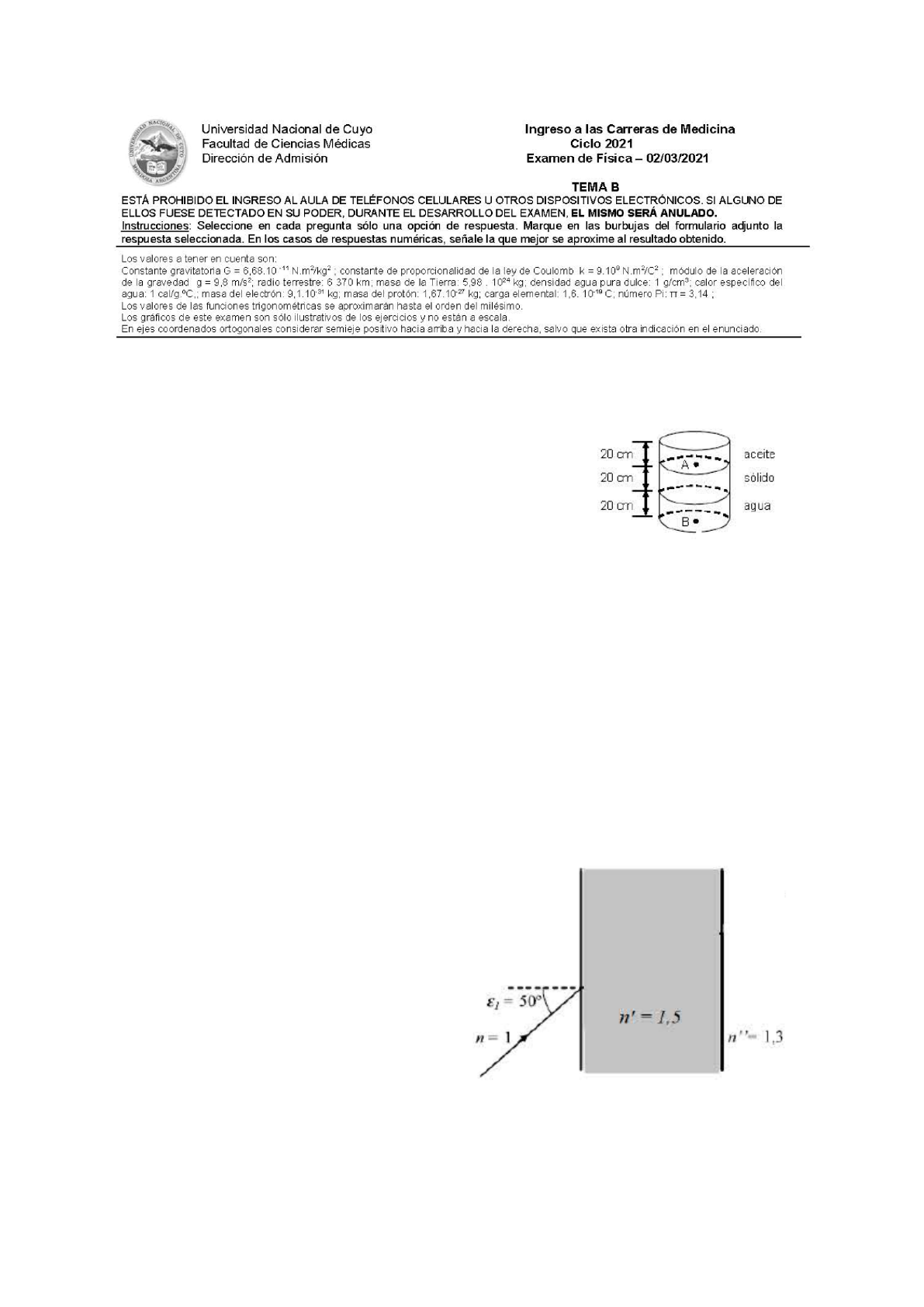 1. Un tubo de 10 cm2 de sección transversal contiene aceite, un sólido y agua como se indica. Determine la masa del sólido, si la diferencia de presiones entre By A es de 8 kPa: A. 300 g B. 412 g C. 205 g D. 616 g 2. El agua fluye con un caudal de 30 mL/s a través de una abertura que se encuentra en el fondo de un tanque grande donde el líquido tiene una profundidad de 4 m. Indicar el caudal con que escapa el agua si a su nivel superior se le agrega una presión de 50 kPa: A. 4,52. 10-5 m3/s B. 1,99. 10-5 m3/s C. 6,15. 10-5 m3/s D. 3,01. 10-5 m3/s 3. Sean las láminas planoparalelas de la figura adjunta. Un rayo de luz monocromática que se propaga en el aire incide en la primera cara formando con la normal un ángulo E1 50°. El material de la lámina tiene un índice de refracción n' = 1,5 y el medio donde emerge el rayo de luz posee un índice de refracción n1 2 = 1,3. Determinar la desviación angular "d" entre el rayo incidente y el emergente de la lámina: A. d = 36,10° B. d = 0,0° C. d = 23,74° D. d = 13.90° 4. Sea el prisma isósceles de la figura, sumergido en agua (n' = 4/3), con 𝛼 = 90°, índice de refracción n = 1,75 y con una de sus superficies espejada. Un rayo de luz monocromático incide en el prisma de manera que el rayo emergente se propaga en dirección perpendicular a la base del prisma. Determinar el ángulo de incidencia E1: A. E1= 141,01° B. E1= 13,61° C. E1= 68,11° D. E1 = 23,59° 5. Un pequeño globo aerostático se encuentra en reposo a una cierta altura. Si consideramos que su peso es de 1200 N. ¿Qué peso debería perder para ascender con una aceleración de 2 m/s2?: A. 285 N B. 248 N C. 320 N D. 203 N 6. Una masa, de 4 500 g, comienza a ascender por un plano inclinado de 53° con la vertical con una velocidad inicial de 14 m/s. Cuando su desplazamiento es de 8 m, su velocidad ascendente ha disminuido en una cantidad de 8,8 m/s. El coeficiente de rozamiento cinético entre la masa y el plano es: A. 0,68 B. 0,59 C. 0,74 D. 0,35 7. Una chapa cuadrada de aluminio tiene 0,2 m de lado a 30°C. ¿A qué temperatura la superficie será 34 mm2 mayor?: Dato: Coeficiente de dilatación lineal del aluminio, αAI = 25. 10-6 °C-1 A. 58,1 °F B. 116,6 °F C. 147,2 °F D. 47 °F 8. Un condensador posee una carga de 15μC cuando el potencial entre las placas es Vi. Si su carga se incrementa a 18 μC, el potencial entre las placas se incrementa en 6V. ¿Cuál es la capacidad del condensador?: A. 2,5 μF B. 5 μF C. 3 μF D. 0,5μF 9. Un capacitor de 20 μF está cargado con una diferencia de potencial de 1 000 V. Si sus placas se conectan a las de otro capacitor descargado de 5 μF. Calcular la diferencia de potencial final entre las placas de cada capacitor: A. 800 V B. 500 V C. 80 V D. 100 V 10. La expresión dimensionalmente homogénea para la fuerza F es: F = K . v + 𝐴 . 𝑃 𝑚.𝑔.ℎ − 𝐵 . 𝑣2 Donde m es masa; v es velocidad; g es aceleración de la gravedad; P es potencia y h es altura. Encontrar las unidades del cociente: en el Sistema Internacional. 𝐾 . 𝐴 𝐵 A. m/s (metro por segundo) B. W (watts) C. J (joule) D. N (newton) 11. En un laboratorio experimental, bajo ciertas condiciones, hallan la ecuación de cálculo del desplazamiento (Ay) de una partícula en relación con magnitudes mecánicas, a través de la siguiente ecuación dimensionalmente correcta: Donde T es trabajo y H es altura. Hallar la dimensión de la magnitud "X" A. M. L . T-2 B. M. L0 . T-2 C. M0. L-2. T0 D. M0. L-1. T 12. La siguiente ecuación es dimensionalmente correcta: Donde: P es potencia mecánica; δ es densidad; v es velocidad y 𝝙t es tiempo. Determinar el valor de (x + y)2 : A. 25 B. 9 C. 36 D. 16 13. Sobre un cubo de hielo a 0°C se coloca una moneda de plata de 1,5 cm de diámetro, de 15 g, que se encuentra a 85°C. Cuando la moneda está a 0°C ha descendido en el hielo "h" cm, manteniéndose horizontal. Sin considerar las pérdidas de calor al medio ambiente, calcule la distancia "h" en cm. DATOS: Densidad hielo= 0,92 g/cm3; Calor específico Plata = 5,59.10-2 cal/g °C; Calor Latente fusión hielo = 80 cal/g A. h = 1,01 cm B. h = 1,56 cm C. h = 2,03 cm D. h = 0.54 cm 14. Para realizar un agujero en un tablón de madera dura se utiliza un taladro, cuya potencia es de 1/4 CV, con una mecha de hierro de 0,392 N. Sabiendo que se emplea para ello medio minuto y que el 40% de la energía puesta en juego se utiliza para realizar el agujero (el resto se disipa en forma de calor); calcular la variación de temperatura de la mecha: Dato: Calor específico del hierro: 0,119 cal/g.°C A. 440 K B. 695 K C. 166 K D. 111 K 15. Tres vectores concurrentes forman entre sí ángulos de 120°; si sus módulos se relacionan de la siguiente manera: F1= 2.F2 y F2 = F3. El módulo de la resultante es: A. F1 B. 2.F1 C. 1,33.F1 D. 0,5.F1 16. Un objeto de 10 kg sobre una mesa sin rozamiento está sometido a fuerzas horizontales de módulos F1 = 20N y F2 = 30N, tal como se indica en la figura y según el sistema ortogonal graficado. Una tercera fuerza F3 se aplica para que el objeto se encuentre en equilibrio estático. El valor de F3 es: Nota: el versor i corresponde al eje x, y el versor j corresponde al eje y A. -5Ni - 26Nj B. 35Ni + 15Nj C. 5Ni + 26Nj D. -20Ni + 30Nj 17. Una lente delgada convergente tiene 0,20 m de distancia focal y se utiliza para obtener una imagen de tamaño doble que el objeto. Indicar a qué distancia se encuentra la imagen de la lente si la misma es invertida: A. 60 cm B. 120 cm C. 30 cm D. 1,2 cm 18. Una moto de prueba se desplaza por una pista horizontal para realizar controles de reacción del motor. Para ello parte del reposo y se mueve con aceleración constante de 3 m/s2. Se realizan mediciones a través de dos sensores de velocidad separados 2 000 cm entre sí. Calcular el módulo de la velocidad de la moto al pasar por el segundo sensor si emplea un tiempo de 1 400 ms para recorrer la distancia entre ambos sensores? A. 11,7 m/s B.