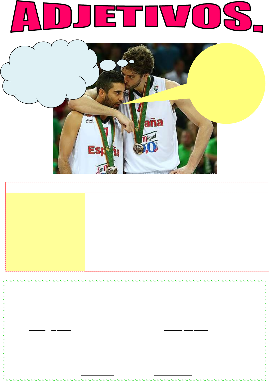 CONOCE LA LENGUA ESPAÑOLA. CEIP Manuel Siurot (La Palma del Condado). EJEMPLOS DE ADJETIVOS ADJETIVOS CON GÉNERO COMÚN (igual forma para el masculino y femenino) ágil, agradable, amable, amigable, cobarde, eficaz, emocionante, equivalente, familiar, frágil, fuerte, genial, grande, hiriente, impresionante, inseparable, inteligente, maleable, potente, principal, saludable, simple, soez, sonriente, soportable, sorprendente, tiquismiquis, torpe, valiente, veloz… ADJETIVOS CON GÉNERO MASCULINO y FEMENINO (cambian su morfema final: ‘-o/-a’) aburrido/da, alto/ta, ateo/a, atractivo/sa, avaricioso/sa, bajo/ja, bello/lla, bonito/ta, caluroso/sa, creativo/va, comprensivo/va, concentrado/da, curioso/sa, despiadado/da, despistado/da, escrupuloso/sa, estiloso/sa, extrovertido/da, flojo/ja, furioso/sa, gordo/da, harto/ta, imaginativo/va, irritado/da, largo/ga, lento/ta, malvado/da, malicioso/sa, permisivo/sa, pesado/da, presumido/da, presuntuoso/sa, rápido/da, raudo/da, risueño/ña, simpático/ca, sordociego/ga, talentoso/sa, testarudo/da, tímido/da, tonto/ta, tozudo/da, trabajador/ra, vago/ga, vivo/va, zurdo/da… CONCORDANCIA. Los adjetivos siempre concuerdan en género y número con el sustantivo al que se refieren. Por ejemplo, si uno está en singular y masculino, el otro también. Si el sustantivo tiene un determinante, entonces concuerdan los tres. Ten en cuenta que el adjetivo puede ir delante o detrás del sustantivo, incluso a veces pueden ir separados. Ejemplo: ‘La lengua española es muy rica y contiene muchísimos aspectos. Este idioma es maravilloso’. CASOS ESPECIALES. ► Si un adjetivo se refiere a dos o más sustantivos (en singular) a la vez, entonces el adjetivo debe usarse en plural. Ejemplo: ‘La carne y el pescado frescos son alimentos que necesitan consumirse pronto. ► Si un adjetivo se refiere a dos sustantivos, uno en masculino y otro en femenino, entonces el adjetivo debe usarse en masculino (y plural). Ejemplo: ‘El gato y la gata negros maúllan en la calle y el parque oscuros’. Los adjetivos son palabras que sirven para describir y expresar cualidades de los sustantivos. (‘Dicen cómo es el sustantivo’). Somos merecidos campeones de Europa, el equipo ganador, los mejores amigos, jugadores expertos y habilidosos, grandes profesionales, inseparables amigos… CONOCE LA LENGUA ESPAÑOLA. CEIP Manuel Siurot (La Palma del Condado). ADJETIVOS APOCOPADOS. Los adjetivos apocopados son aquellos que acortan su forma cuando se utilizan delante del sustantivo. A veces, un adjetivo toma forma apocopada en masculino y no en femenino. Ejemplos: ► ‘grande / gran‘: hombre grande / gran hombre; mujer grande / gran mujer. ► ‘malo-mala / mal’: día malo / mal día; noche mala / mala noche (no cambia). ► ‘bueno-buena / buen’: coche bueno / buen coche; moto buena / buena moto (no cambia). FORMAR ADJETIVOS A PARTIR DE SINTAGMAS. En ciertas ocasiones, un grupo de palabras (sintagma) puede actuar como un adjetivo. Lo podemos reconocer porque se pueden sustituir por un sustantivo. Ejemplos: día de lluvia día lluvioso; comida de familia comida familiar; pantalón de deporte pantalón deportivo; vela de olor vela olorosa; noche de calor noche calurosa; pared de roca pared rocosa; día de fiesta día festivo; ropa de color ropa colorida; moto de agua moto acuática; etc. USO DEL ADJETIVO. Los adjetivos pueden ir delante o detrás de un sustantivo. También pueden estar separados del sustantivo por un verbo copulativo, por un adverbio o incluso por otro tipo de palabras. Ejemplos: ► Adjetivo delante del sustantivo: ‘Nuestro bonito huerto lo cavamos ayer’. ► Adjetivo detrás del sustantivo: ‘Nuestro huerto bonito lo cavamos ayer’. ► Adjetivo tras verbo copulativo (atributo): ‘Nuestro huerto es bonito y lo cavamos ayer’. ► Adjetivo tras verbo pseudocopulativo (complemento copulativo): ‘El agricultor acabó cansado’. ► Adjetivo tras un adverbio: ‘Tengo un perro muy fiel en mi casa de campo’. ► Adjetivo tras una preposición: ‘He pintado los calabacines de blanco para que los reconozcas’ (los calabacines blancos). ► Sintagma nominal que funciona como un adjetivo: ‘Los pimientos de color verde aún no los cogeremos’ (verdosos). ► Adjetivo tras aclaraciones: ‘Los tomates, aparentemente maduros, los recogimos ayer por la tarde’. ► Otros casos: ‘Alegre, por la noticia recibida, nos recibió con una gran sonrisa’ (‘Alegre’ se refiere a ’yo’). SIGNIFICADO DEL ADJETIVO. El adjetivo tiene significado descriptivo pero no principal. Ello supone que, en muchas ocasiones, podemos suprimir el sustantivo y la oración siguen teniendo sentido completo (aunque pierde información). Ejemplos: ‘Las buenas costumbres son relativas’ ‘Las costumbres son relativas’. (La oración pierde significado pero conserva el sentido. Si quitásemos el adjetivo ‘sonriente, la oración dejaría de tener sentido ya que este verbo, aunque copulativo, necesita algún tipo de complemento). CONOCE LA LENGUA ESPAÑOLA. CEIP Manuel Siurot (La Palma del Condado). GRADOS DEL ADJETIVO. El grado del adjetivo hace referencia a que puede expresar distintos niveles de intensidad. Se establecen 3 grados: En 1988 se produjo un hecho histórico en la NBA. Coincidieron en el mismo equipo Tyrone Bogues (1,60 m.) y Manute Bol (2,31). Es la diferencia mayor de altura entre dos jugadores que hayan coincidido en un equipo. Se considera al rumano Gheorghe Muresan (2.31) como el más alto de la historia de la NBA, solo unos milímetros más alto que Bol. Bogues es el más bajo de la historia de la NBA. ► GRADO POSITIVO. Se utiliza el adjetivo en modo descriptivo establecer ninguna intensidad. Ejemplos: ‘Manute Bol es gigantesco’. / ‘Este hombre gigantesco se llama Manute Bol’. / ‘Aquella persona bajita se llama Tyrone Bogues’. ► GRADO COMPARATIVO. Se comparan cualidades o características entre distintas personas, cosas, lugares…