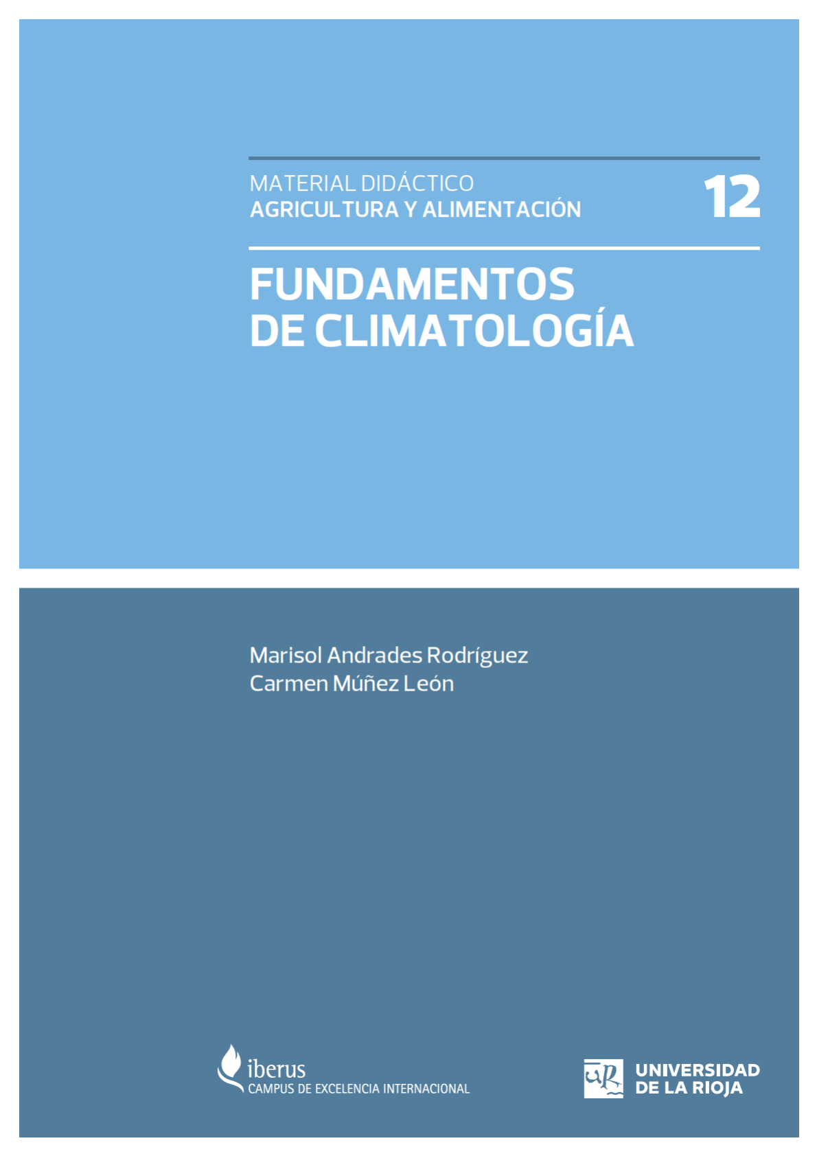 FUNDAMENTOS DE CLIMATOLOGÍA MATERIAL DIDÁCTICO Agricultura y Alimentación 12 Marisol Andrades Rodríguez Carmen Múñez León FUNDAMENTOS DE CLIMATOLOGÍA UNIVERSIDAD DE LA RIOJA Servicio de Publicaciones 2012 Andrades Rodríguez, Marisol Fundamentos de climatología / Marisol Andrades Rodríguez, Carmen Múñez León. - Logroño : Universidad de La Rioja, Servicio de Publicaciones, 2012. 64 p. - (Material Didáctico. Agricultura y Alimentación ; 12) ISBN 978-84-695-2799-3 1. Climatología. I. Título. II. Universidad de La Rioja. Servicio de Publicaciones. III. Serie 551.58 Fundamentos de climatología de Marisol Andrades Rodríguez, Carmen Múñez León (publicado por la Universidad de La Rioja) se difunde bajo una Licencia Creative Commons Reconocimiento-NoComercial-SinObraDerivada 3.0 Unported. Permisos que vayan más allá de lo cubierto por esta licencia pueden solicitarse a los titulares del copyright. © Marisol Andrades Rodríguez © Universidad de La Rioja, Servicio de Publicaciones, 2012 publicaciones.unirioja.es E-mail: publicaciones@unirioja.es ISBN 978-84-695-2799-3 Edita: Universidad de La Rioja, Servicio de Publicaciones INDICE TEMA 1. TIEMPO Y CLIMA .................................................................................................... 7 1.1. Tiempo y clima. Meteorología y Climatología ....................................................................... 7 1.2. El I.N.M ...................................................................................................................................... 7 1.2.1. Estaciones Pluviométricas ............................................................................................. 8 1.2.2. Estaciones Termopluviométricas ................................................................................. 8 1.2.3. Estaciones Completas .................................................................................................... 8 TEMA 2. LA RADIACIÓN SOLAR....................................................................................... 11 2.1. Introducción ............................................................................................................................. 11 2.2. La radiación solar ..................................................................................................................... 11 2.3. Espectros de emisión de la radiación solar .......................................................................... 12 2.4. La atmósfera: estructura, composición y efecto sobre la radiación solar ........................ 13 2.4.1. Estructura y composición............................................................................................ 13 2.5. Influencia de la atmósfera sobre la radiación. Balance de la radiación ............................ 14 2.6. Efecto invernadero .................................................................................................................. 16 2.7. Influencia de la latitud ............................................................................................................. 16 2.8. Influencia de la continentalidad ............................................................................................. 17 2.9. Aparatos de medida. Unidades .............................................................................................. 17 TEMA 3. LA TEMPERATURA .............................................................................................. 19 3.1. Definición de la temperatura. Formas de la transmisión del calor. Transmisión en el suelo, en el agua y en el aire ................................................................................................... 19 3.2. Naturaleza cíclica de los cambios de temperatura y uniformidad térmica global........... 19 3.2.1. Variación diaria de la temperatura.............................................................................. 19 3.2.2. Variación anual de la temperatura .............................................................................. 20 3.2.3. Uniformidad térmica global ........................................................................................ 21 3.3. Variación de la temperatura con la altura ............................................................................. 21 3.4. Inversión térmica ..................................................................................................................... 21 3.5. Distribución geográfica de la temperatura ........................................................................... 23 3.6. Aparatos de medida. Unidades .............................................................................................. 24 TEMA 4. LA PRESIÓN ATMOSFÉRICA .......................................................................... 25 4.1. Definición de presión.............................................................................................................. 25 4.2. Isobaras y campos de isobaras ............................................................................................... 25 4.3. Variación de la presión con la altura ..................................................................................... 27 4.4. Distribución geográfica de la presión ................................................................................... 27 4.5. Aparatos de medida. Unidades .............................................................................................. 30 5 MARISOL ANDRADES RODRÍGUEZ – CARMEN MÚÑEZ LEÓN 6 TEMA 5. EL VIENTO............................................................................................................... 31 5.1. Definición y origen del viento................................................................................................ 31 5.2. Fuerzas que intervienen en la dirección del viento ............................................................. 33 5.3. Clasificación 