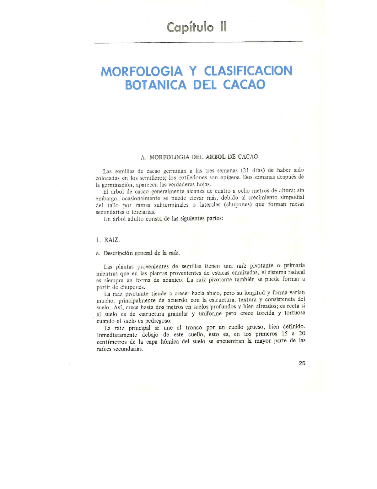 25-32 A. MORFOLOGICA DEL ARBOL DE CACAO 1. RAIZ a. Descripción general de la raíz b. Micorrizas c. Anatomía de la raíz 2. TRONCO Y RAMAS DEL CACAO a. Descripción general del tronco y las ramas b. Anatomía del tronco y las ramas >>>>> 33-42 <<<<< 3. HOJA a. Descripción general de la hoja b. Anatomía de la hoja 4. FLOR a. Inflorescencia b. La flor 5. EL FRUTO B. CLASIFICACION BOTANICA DEL CACAO BIBLIOGRAFIA