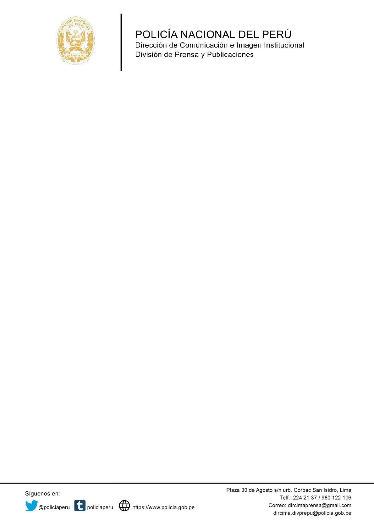 NOTA DE PRENSA N.° 389 DIRCOTE CAPTURA A DELINCUENTE TERRORISTA DE SENDERO LUMINOSO EN EL VRAEM En megaoperativo denominado “Luchamos por la Paz 2020”. Durante megaoperativo contraterrorista personal de la Dirección Contra el Terrorismo - DIRCOTE PNP, con el apoyo del Frente Policial y Comando Especial Vraem capturó al delincuente terrorista de Sendero Luminoso, Abilio Palomino Ñaña o Eracliyo Palomino Limache, camarada Eracliyo, en el distrito de Llochegua, provincial de Huanta, departamento Ayacucho. El subversivo fue capturado en cumplimiento a la medida limitativa de derecho (detención preliminar) por el delito de terrorismo en agravio del Estado peruano, emitida por el Juzgado Penal Supraprovincial Transitorio Especializado en Crimen Organizado. Tras un paciente trabajo de inteligencia operativa, agentes especializados ubicaron al delincuente terrorista en inmediaciones de la trocha carrozable de la zona de playa hermosa - Llochegua. Al capturado se le atribuye su participación en el ataque al puesto policial de la Mina Cobriza, el 30 de agosto de 2007, donde fueron asesinados el Suboficial de Primera PNP Ricardo Mendoza Suárez y el vigilante particular Marco Dávila Rottier, con subsecuente robo de armamento del Estado. El sedicioso fue trasladado a la sede de la Comisaría PNP Llochegua - Frente Policial Vraem, para la formulación de la documentación sustentatoria y luego será puesto a disposición de la Dirección Contra el Terrorismo - DIRCOTE PNP para las investigaciones del caso, con conocimiento de la fiscal provincial penal de la Fiscalía Especializada en Delitos de Terrorismo y Lesa Humanidad de Huánuco. En tanto, la Policía continúa con los operativos tendientes a la identificación, ubicación y captura de integrantes de la red de apoyo y colaboradores (cuadros nativos) de la organización terrorista Sendero Luminoso. Lima, 2 de febrero de 2020 MCE/lebm 12:15 NOTA DE PRENSA N.° 389