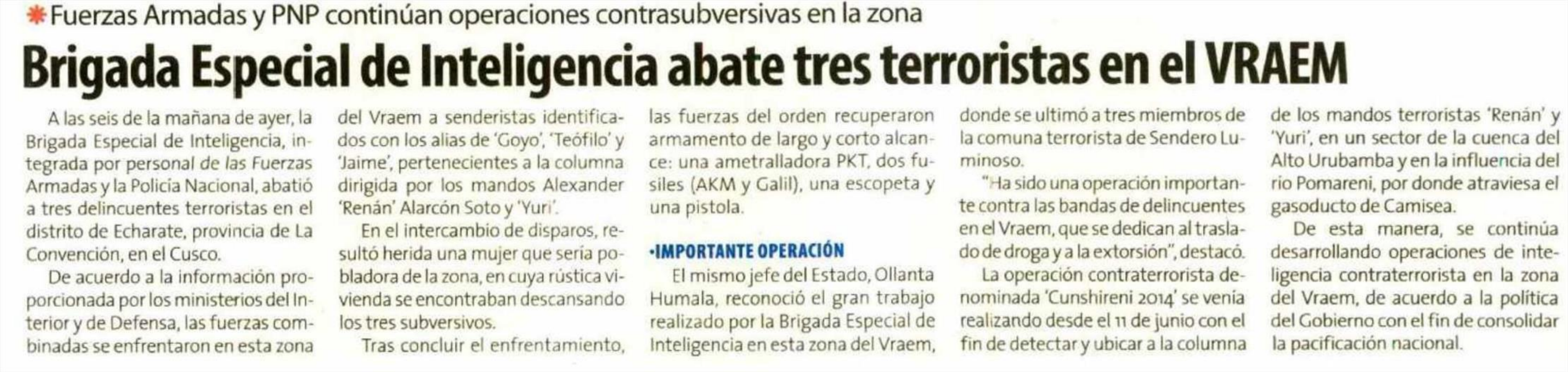 Fuerzas Armadas y PNP continúan operaciones contrasubversivas en la zona Brigada Especial de Inteligencia abate tres terroristas en el VRAEM A las seis de la mañana de ayer. la Brigada Especial de Inteligencia. ~n te~rada por personal de las Fuerzas Armadas y la Policia Nacional, abatió a tres delincuentes terroristas en el distrito de Echarate. prow~Icia de La Corrvenci0n. en el Cusco. De acuerdo a la informaoón pro- porc~onada por los m~n~stef~os del In- terior y de Defensa. las fuerzas com- binadas se enfrentaron en esta zona del Vraem a senderistas identifica- dos con los alias de ’Goyo’. ’Te0lilo’ y ’Janine’. pertenecientes a la columna d~riglda por los mandos Alexander ’l~en~n’ Alarcón Soto y ’Yur,’ En el intercambio de disparos, re- sultó her~da una mujer que serpa po bladora de la zona, en (t~ya rustica vi- vienda se encontraban descansando los tres subvers~vos. Tras concluir el enfrent,m~~ento, las fuerzas del orden recuperaron armamento de largo y corto alean ce: una ametralladora PKT. dos fu. siles (AKM y Galil). una escopeta y una p~stola ¯ IMPORTANTE OPEIIACION El mismo jefe del Estado, Ollanta Humala. reconoció el l~ran trabajo realizado por la Brigada Especial de Inteligencia en esta zona del Vraem, donde se ultimo a tres miembros de la ( omuna terrorista de Sendero tu ".la sido una operaci0n importan te contra las bandas de delincuentes en el Vraem. que se dedican al trasla- do de droga y a la extorsión", destaco La operación contraterronsta de- nominada ’Cunsbireni 2014’ se venía real,zando desde el ~~ de junio con el fin de detectar y ubicar a la columna de los mandos terroristas ’l~enan’ y ’Yuri’. en un sector de la cuenca del Alto Urubamba y en la influencia del rio Pomareni, por donde atraviesa el gasoducto de Camisea. De esta manera, se continúa desarrollando operaciones de inte- ligencia contraterrorista en la zona del Vraem. de acuerdo a la política del Gobierno con el fin de consolidar la pacificación nacional