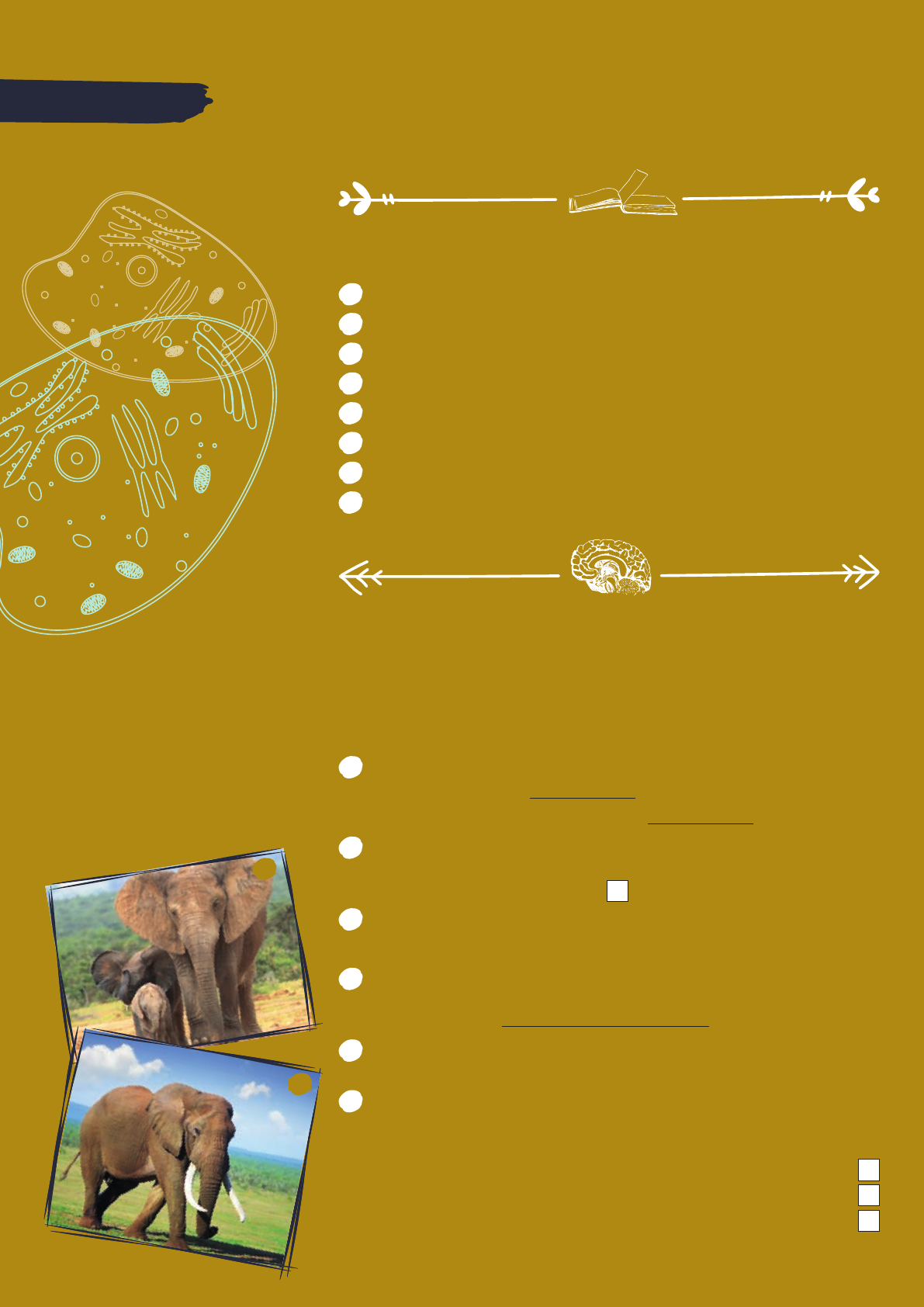 ¿Qué vas a aprender? 1 La Tierra: el planeta de la vida. 2 Los niveles de organización de la materia. 3 Los bioelementos y las biomoléculas esenciales de los seres vivos. 4 La célula. 5 Tipos de células. 6 Las funciones vitales. 7 La clasificación de los seres vivos. 8 La biodiversidad. Los cinco reinos. ¿Qué sabes antes de empezar? Los elefantes son los mamíferos terrestres más grandes. Comen unos 300 kg al día de hierbas, frutos… Viven juntos, en manadas de unos veinte individuos y tienen muy buena memoria. El embarazo de una ele- fanta dura entre 18 y 22 meses, dependiendo de la especie. 1 Completa con: seres vivos y materia inerte. a) Los elefantes son . b) Las rocas del suelo que pisan son . 2 Indica si la siguiente afirmación es falsa o verdadera: «No todas las células de un elefante son iguales. Sus formas están relacionadas con la función que realizan.» 3 Lee de nuevo el texto. ¿Cuáles son las tres funciones vitales? 4 Las plantas crecen hacia el sol y dirigen su raíz hacia el interior de la tierra buscando la humedad. ¿A qué función vital corresponden esas respuestas? . 5 La foto A es de un elefante asiático y el de la foto B, de uno africa- no. ¿Pertenecen a la misma especie? 6 Estamos rodeados de seres unicelulares, e incluso algunos habitan en nuestro interior. Indica si son verdaderas (V) o falsas (F) estas afirmaciones: a) Las bacterias son seres unicelulares. b) Las bacterias pertenecen al reino Animal. c) Las bacterias pertenecen al reino Moneras. Los seres vivos: clasificación y funciones BLOQUE LA BIODIVERSIDAD EN EL PLANETA TIERRA UNIDAD 6 A B 4 LA BIODIVERSIDAD EN EL PLANETA TIERRA Actividades 1.1 Completa la siguiente tabla con SÍ, si se corresponde con una característica de la Tierra que le permita albergar vida, o con NO, si no lo es. Características Sí/No Presencia de todos los elementos químicos. Presencia de agua líquida. Existencia de atmósfera. Existencia de un satélite llamado Luna. Distancia entre la Tierra y el Sol. Presencia de agua en forma de hielo. 1.2 Rellena las siguientes frases con la palabra correcta en cada hueco. a) La distancia entre la Tierra y el Sol permite que la terrestre sea suave y haya líquida. b) La presencia de químicos básicos es fundamental, ya que los seres los emplean para fabricar . c) Una característica esencial de la como planeta es la presencia de líquida, que permite a los seres vivos disponer de ella. d) La Tierra posee una capa de gases que la envuelve que se llama , que protege a los seres vivos de las solares peligrosas y mantiene la sin cambios bruscos. 1.3 Señala si las siguientes frases son verdaderas (V) o falsas (F): a) La presencia de elementos químicos básicos protege a los seres vivos de las radiaciones solares peligrosas. b) La distancia entre la Tierra y el Sol es la misma que la de otros planetas del sistema solar. c) La atmósfera terrestre evita cambios bruscos de la temperatura media terrestre. d) La distancia entre la Tierra y el Sol permite la existencia de la atmósfera terrestre. e) La atmósfera terrestre permite que haya vida en la Tierra porque protege a los seres vivos de las radiaciones solares peligrosas. La Tierra: el planeta de la vida La Tierra presenta unas características que la hacen capaz de albergar vida: 1 Distancia entre la Tierra y el Sol. Permite que la temperatura terrestre sea suave y haya agua líquida. Presencia de agua líquida. A disposición de los seres vivos. Presencia de elementos químicos básicos Que los seres vivos emplean en fabricar sus propias moléculas. Existencia de atmósfera terrestre. Que protege a los seres vivos de las radiaciones solares peligrosas y mantiene la temperatura sin cambios bruscos. 5UNIDAD 6 Actividades 2.1 Relaciona con flechas entre ambas columnas. • Átomo • Grupo de células con función conjunta. • Molécula • Agrupación de tejidos con una función específica. • Célula • Unidad más pequeña que forma la materia. • Tejido • Ser vivo individual. • Órgano • Unidad estructural y funcional de la vida. • Sistema • Conjunto de órganos que actúan de forma coordinada. • Organismo • Agrupación de átomos. 2.2 Ordena de mayor complejidad a menor complejidad los siguientes niveles de organización de la ma- teria. Tejido – sistema – átomo – organismo – célula – molécula. 2.3 Escribe las características que presentan los seres vivos y que los diferencian de la materia inerte. Los niveles de organización de la materia y las características de los seres vivos La materia que forma a los seres vivos está estructurada en una serie de niveles de organización con un grado de complejidad creciente. 1. Átomo. Unidad más pequeña que forma la materia. 7. Organismo. Ser vivo individual, en este caso, pluricelular. 4. Tejido. Agrupación de células semejantes con una misma función. molècules macromolèculesátoms virus cèl·lules organismes poblacions biocenosi ecosistema biosfera molècules macromolèculesátoms virus cèl·lules organismes poblacions biocenosi ecosistema biosfera 2. Molécula. Agrupación de átomos. 3. Célula. Unidad estructural y funcional de la vida. 6. Sistema. Conjunto de órganos que actúan de forma coordinada. 5. Órgano. Agrupación de tejidos con una función específica y determinada. Los seres vivos presentan las siguientes características que los diferencian de la materia inerte: 1. Los seres vivos presentan moléculas exclusivas. 2. Los seres vivos están formados por células. 3. Los seres vivos realizan las funciones vitales: nutrición, relación y re- producción. 2 6 LA BIODIVERSIDAD EN EL PLANETA TIERRA Actividades 3.1 Nombra en cada caso la biomolécula a la que nos referimos. a) Interviene en muchas funciones, como el transporte de sustancias. b) Proporciona energía. c) Contiene la información genética. d) Forman parte de los huesos. e) Forman estructuras como la piel o los músculos. f) Es la forma de almacenar energí
