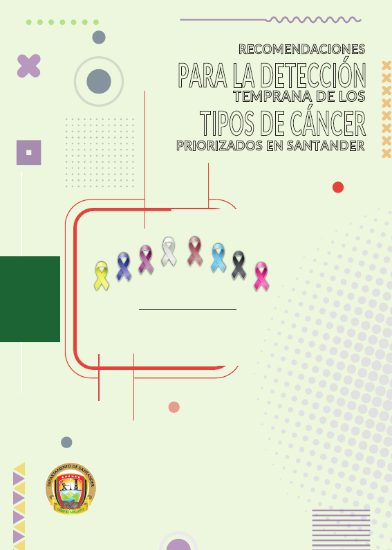 RECOMENDACIONES TEMPRANA DE LOS PRIORIZADOS EN SANTANDER PARA LA DETECCIÓN TIPOS DE CÁNCER Detección Temprana Cáncer Infantil Cáncer Gástrico Cáncer Pulmón Cáncer Oral Cáncer Próstata Cáncer Piel Cáncer Mama Cáncer Colorrecatal Para uso en entornos institucionales Dimensión Vida Saludable y Condiciones no Transmisible SECRETARÍA DE SALUD C O N TE N ID O 04 PRESENTACIÒN 06 CÁNCER INFANTIL 14 CÁNCER COLORRECTAL 20 CÁNCER GÁSTRICO 24 CÁNCER DE PULMÓN 30 CÁNCER ORAL 36 CÁNCER DE PRÓSTATA 42 CÁNCER DE PIEL 46 52 CÁNCER DE MAMA CÁNCER DE MAMA 56 RECOMEDACIONES 58 BIBLIOGRAFÌA Recomendaciones para la Detección Temprana de los Tipos de Cáncer Priorizados en Santander Primera Edición Noviembre de 2019 500 ejemplares Diseño realizado en el marco del proyecto: Fortalecimiento de los Estilos de Vida Saludable y Control de Enfermedades no Transmisibles, Incluida la Salud Bucal, Visual y Auditiva en el Departamento de Santander Número SSEPI: 20160680000095 Como pieza educomunicativa de la Estrategia Integral: “Modelo Educomunicativo para el Control del Cáncer, Departamento dé Santander” Contenido ALIADOS RECOMENDACIONES TEMPRANA DE LOS PRIORIZADOS EN SANTANDER PARA LA DETECCIÓN TIPOS DE CÁNCER Diseño Comunicativo: Maria Nelsy Bautista Otero Periodista, Comunicadora Social Organizacional Esp, Gerencia Publicitaria y Abogada Oscar Prieto Chinome Diseñador Gráfico 2 3 Detección Temprana Dimensión Vida Saludable y Condiciones no TransmisiblesSecretaría de Salud El cáncer es una enfermedad caracterizada por la proliferación anormal y desordenada de células que conduce al crecimiento descontrolado de un tumor maligno en un determinado tejido u órgano1. Actualmente se conocen más de 100 diferentes tipos de cáncer. La mayoría de ellos toman el nombre del órgano o de las células en donde empiezan; por ejemplo, el cáncer que empieza en el colon se llama cáncer de colon. El cáncer no se presenta por una sola causa, sino que se origina por múltiples factores, se considera que la mayoría de cánceres se originan por la exposición a factores de riesgo, relacionados con el estilo de vida y el medio ambiente. Santander no es ajeno a éste problema de salud pública, donde el número de enfermos y personas muertas por esta causa ha ido aumentando en los últimos años; ocasionando un impacto negativo a quién lo padece y afectando de manera directa a sus familias. Hoy se diseñan estrategias que permitan reducir el cáncer, se contempla la creación e implementación de programas efectivos que logren mejorar la detección precoz, el diagnóstico oportuno y un tratamiento específico y efectivo. En el marco del Contrato Interadministrativo N°. 1735 de 2019, suscrito entre el Departamento de Salud Pública de la Universidad Industrial de Santander y la Gobernación de Santander, se ofrece esta cartilla como parte de una estrategia educomunicativa de la Dimensión Vida Saludable y Condiciones no transmisibles de la Secretaria de Salud de Santander, la cual permitirá a los profesionales de la salud de las IPS públicas, desarrollar capacidades para la detección oportuna de cánceres priorizados de la región, reconocer los factores de riesgo, evidenciar las señales de alarma y el camino a seguir. 1Instituto Nacional de Cancerología. El cáncer. Aspectos básicos sobre su biología, clínica, prevención, diagnóstico y tratamiento. Fecha de consulta: mayo 20 de 2013. [Disponible en: http://www.cancer.gov.co/documentos/Cartillas/Elcancer.pdf]PR ES EN TA C IÓ N Presentación4 5 Detección Temprana Dimensión Vida Saludable y Condiciones no TransmisiblesSecretaría de Salud CÁNCER INFANTIL El objetivo es ofrecerles esta herramienta que les ayude en su difícil pero importante tarea de diagnosticar y cuidar a los niños con cáncer; es un material educativo construido por expertos médicos especializados en el área y con una vasta experiencia en la oncología infantil. Existen señales o síntomas que puede hacer sospechar que el niño padece cáncer. Dependiendo de la edad, varía la frecuencia de los diferentes tipos de neoplasias, pero en todos los grupos etarios la enfermedad oncológica más frecuente son las leucemias; posteriormente según la edad, se ubican otros tipos de tumores, como se registra en el siguiente cuadro. Menores de 5 años Leucemias Neuroblastoma Tumor de Wilms Tumores testiculares (saco vitelino) Retinoblastoma 5 a 10 años Leucemias Linfoma Hodgkin Tumores del SNC Sarcoma partes blandas Mayores de 10 años Leucemias Linfoma no Hodgkin Linfoma Hodgkin Tumores del SNC Tumor de células germinales (ovario, extragonadales) Cánceres más frecuentes en niños según grupos de edad SIGNOS Y SÍNTOMASNo es fácil, pero es posible La forma de presentación inicial de los cánceres en la edad pediátrica, puede ser muy inespecífica y ésta es una de las razones por las cuales el diagnóstico puede retardarse, dado que el personal de salud que lo evalúa en primera instancia supone que se trata de las patologías más frecuentes; y si a esto se agrega el hecho de que no se haga un examen clínico adecuado, lo más probable es que puedan pasar días, semanas y hasta meses, antes de llegar a un diagnóstico correcto. Las Leucemias, por ejemplo, pueden manifestarse inicialmente como un síndrome febril al cual no se le encuentra causa y puede convertirse en prolongado, sin que haya compromiso ni clínico ni paraclínico de otros parámetros, o puede manifestarse solo como un dolor óseo o articular, que progresivamente empieza a aumentar en intensidad y frecuencia y a volverse incapacitante. Probablemente en estos casos, en el examen físico ya es posible encontrar un dolor exquisito a la presión, especialmente de la cara anterior de la tibia, signo que es muy sugestivo de infiltración ósea por leucemia. En otros casos puede manifestarse en un comienzo solo con un trastorno hemorrágico purpúrico (equimosis y petequias), que aunque no s
