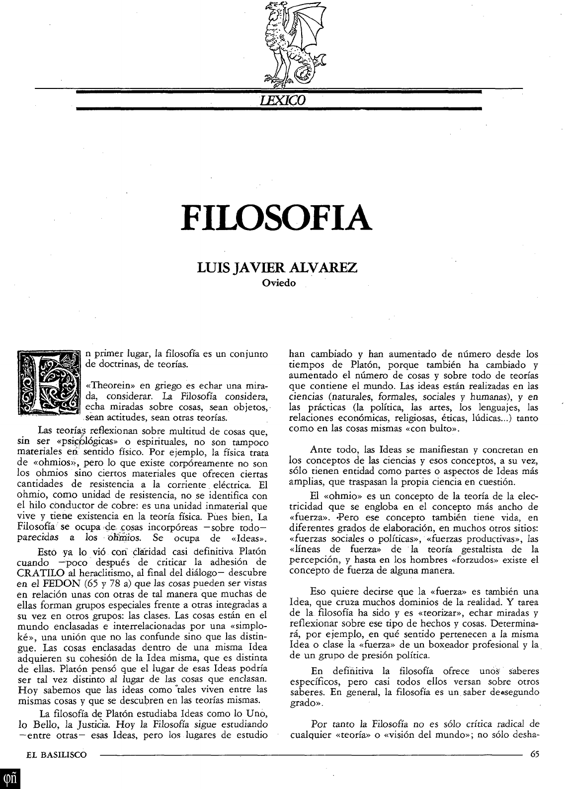 LÉXICO FILOSOFÍA LUIS JAVIER ALVAREZ Oviedo n primer lugar, la filosofía es un conjunto de doctrinas, de teorías. «Theorein» en griego es echar una mira- da, considerar. La Filosofía considera, echa miradas sobre cosas, sean objetos, sean actitudes, sean otras teorías. Las teoría:^ reflexionan sobre multitud de cosas que, sin ser «psipíjlógicas» o espirituales, no son tampoco materiales erí; sentido físico. Por ejemplo, la física trata de «ohmios», pero lo que existe corpóreamente no son los ohmios sino ciertos materiales que ofrecen ciertas cantidades de resistencia a la corriente eléctrica. El ohmio, como unidad de resistencia, no se identifica con el hilo conductor de cobre: es una unidad inmaterial que vive y tiene existencia en la teoría física. Pues bien, La Filosofía se ocupa de. cosas incorpóreas —sobre todo- parecidas a los oKlnios. Se ocupa de «Ideas». Esto ya lo vio con cláíridad casi definitiva Platón cuando —'poco después de criticar la adhesión de CRATILO al heraclitismo, al fmal del diálogo— descubre en el FEDON (65 y 78 a) que las cosas pueden ser vistas en relación unas con otras de tal manera que muchas de ellas forman grupos especiales frente a otras integradas a su vez en otros grupos: las clases. Las cosas están en el mundo enclasadas e interrelacionadas por una «simplo- ké», una unión que no las confunde sino que las distin- gue. Las cosas enclasadas dentro de una misma Idea adquieren su cohesión de la Idea misma, que es distinta de ellas. Platón pensó que el lugar de esas Ideas podría ser tal vez distinto al lugar de las cosas que enclasan. Hoy sabemos que las ideas como "tales viven entre las mismas cosas y que se descubren en las teorías mismas. La filosofía de Platón estudiaba Ideas como lo Uno, lo Bello, la Justicia. Hoy la Filosofía sigue estudiando —entre o t ras- esas Ideas, pero los lugares de estudio han cambiado y han aumentado de número desde los tiempos de Platón, porque también ha cambiado y aumentado el número de cosas y sobre todo de teorías que contiene el mundo. Las ideas están realizadas en las ciencias (naturales, formales, sociales y humanas), y en las prácticas (la política, las artes, los lenguajes, las relaciones económicas, religiosas, éticas, lúdicas...) tanto como en las cosas mismas «con bulto». Ante todo, las Ideas se manifiestan y concretan en los conceptos de las ciencias y esos conceptos, a su vez, sólo tienen entidad como partes o aspectos de Ideas más amplias, que traspasan la propia ciencia en cuestión. El «ohmio» es un concepto de la teoría de la elec- tricidad que se engloba en el concepto más ancho de «fuerza». -Pero ese concepto también tiene vida, en diferentes grados de elaboración, en muchos otros sitios: «fuerzas sociales o políticas», «fuerzas productivas», las «líneas de fuerza» de la teoría gestaltista de la percepción, y hasta en los hombres «forzudos» existe el concepto de fuerza de alguna manera. Eso quiere decirse que la «fuerza» es también una Idea, que cruza muchos dominios de la realidad. Y tarea de la filosofía ha sido y es «teorizar», echar miradas y reflexionar sobre ese tipo de hechos y cosas. Determina- rá, por ejemplo, en qué sentido pertenecen a la misma Idea o clase la «fuerza» de un boxeador profesional y la de un grupo de presión política. En definitiva la filosofía ofrece unos- saberes específicos, pero casi todos ellos versan sobre otros saberes. En general, la filosofía es un saber deesegundo grado». Por tanto la Filosofía no es sólo crítica radical de cualquier «teoría» o «visión del mundo»; no sólo desha- EL BASILISCO 65 EL BASILISCO, número 3, julio-agosto 1978, www.fgbueno.es http://www.fgbueno.es ce sofismas, denuncia falsas pretensiones de verdad en las religiones históricas o en otros sistemas totalizadores sobre el mundo (ideologías), sino que además construye un Corpus dé verdades nuevas. No sólo hace el camino («regressus») hacia la disolu- ción de los contenidos de conciencia —cualesquiera que estos sean—, en la frontera misma con el escepticismo (teórico, que no práctico, el cual es imposible sino es ejercido y cancelado a la vez a través del suicidio). Tam- bién hace —de hecho— el camino de vuelta («progre- ssus») y vuelve a colocar de la mejor manera posible —de la más verdadera— las piezas del mecano de la reali- dad. (Lo que ocurre es que las piezas del mecano de la realidad son incontables. No porque sean muchas o pocas sino porque decir su número exacto es un pecado filosófico: equivale a traspasar una barrera de seguridad y perderse en el dogmatismo metafísico). Esto es una de las más firmes consecuciones de la filosofía. Se pueden decir muchas verdades sobre las cosas y las Ideas, pero no se puede decir la Verdad. «Sobre lo que no se sabe, más vale callarse». Pero la filosofía no es sólo un conjunto de. doctrinas sobre ideas, cosas y teorías. No es solóla más radical de las críticas a toda concepción global deí mundo y a toda Idea interconceptual de las prácticas humanas (políticas, éticas, artísticas, económicas, científicas). Es también, ella misma, una práctica. La práctica, en primer lugar, de unos hombres, de unos especialistas: los filósofos. Pero también la práctica de cualquier hombre en algunas cir- cunstancias determinadas: el juez que ha de decidir fre- cuentemente si la interrupción del embarazo se trata de un homicidio o no. El dirigente político que decide —en un momento dado— rechazar la vía parlamentaria para promover una revolución, (o al revés). El arquitecto que decide romper con una tradición artística y técnica y emprender otro camino... Todos ellos -están aplicando — aún tal vez sin sa,berlo— Ideas filosóficas. Porque todo el mundo en una sociedad urbana, desarrollada,tecnifica- da, tiene «ideas» y es, por lo tanto, filósofo mundano en alguna medida. Pero sobre todo, la