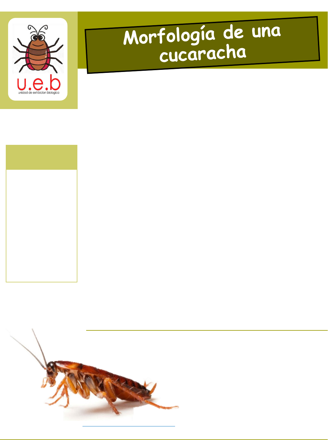 Las cucarachas son insectos pertenecien- tes al orden Blattodea. Este grupo apa- reció en el cámbrico y los registros fósi- les mas antiguos datan de hace 340 mi- llones de años (Ponce et al., 2005). Ac- tualmente se conocen cerca de 3,500 es- pecies distribuidas a nivel mundial, sin embargo, solo el 1 % de las cucarachas son consideradas plaga para el hombre (Gutiérrez, 2015). La morfología actual de las cucarachas tiene carácter ancestral conservándose prácticamente sin cambios a través de cientos de millones de años. Su cuerpo es aplanado dorso ventralmente (Gutiérrez, 2015). En el cuerpo de los artrópodos se distinguen generalmente tres regiones (cabeza, tórax y abdomen). La cabeza (hipognata) está conformada por una boca, mandíbulas con estructuras maci- zas (tipo mordedor-masticador); antenas filiformes muy largas, multisegmenta- das que sirven para oler y sentir; dos ojos compuestos y dos simples (ocelos) en los laterales de la cabeza. El tórax está formado por tres segmentos: protórax (detrás de la cabeza), mesotórax (porción media entre el protórax y el metatórax) y el metatórax (porción ubicada delante del abdomen). Y el abdomen está forma- do por 11 segmentos o tergos (Marino, 2011). Los sistemas y aparatos que conforman la estructura interna de los artrópodos son los siguientes: sistema muscular, sistema digestivo, sistema nervioso, apa- rato excretor, aparato circulatorio, apa- rato respiratorio y aparato reproductor. El tubo digestivo está dividido en tres regiones: estomodeo, mesodeo y procto- deo. El estómago alberga la boca, farin- ge, esófago y estomago; el mesodeo es el intestino, que presenta varias glándulas digestivas; el proctodeo es la porción ter- minal (ectodérmica) del tubo digestivo, finaliza en el telson, una región que se encuentra al final del abdomen donde se encuentra el ano (ASOCAE ONGD, 2017). 1. Coloca la cucaracha en la cámara letal hasta que no se mueva. 2. Observar la cucaracha bajo el mi- croscopio estereoscópico o lupa y reconocer su morfología externa dorsal y ventralmente (Fig. 2). Actividad de secundaria Edad 13-15 Introducción Objetivos 1. Reconocer la organización morfológica interna de un insecto. 2. Localizar los diferentes órganos internos de un insecto. Materiales Microscopio este- reoscopio o lupa Estuche y charola de disección Navaja de bisturí Alfileres Cámara letal (éter) Ejemplar vivo de cucaracha Métodos Fig. 1 Cucaracha www.venenoparacucarachas.com 4. Fijar con alfileres el ejem- plar a la charola de disec- ción y reconoce el aparato digestivo, los túbulos de Malphigi, las tráqueas, el aparato reproductor, el sis- tema nervioso, el circulato- rio y el muscular (Fig. 4 y Fig. 5). 5. Dibuja lo observado. 3, Con la ayuda de la navaja de bisturí, realizar cortes al ejemplar. Separar las patas desde las coxas, así como las alas. Cortar a lo largo de la zona de contacto entre los terguitos y esternitos (pleuras), para separar la parte dorsal del cuerpo, de la ventral (Fig. 3). Página 2 Morfología de una cucaracha Fig. 2 Morfología dorsal y ventral de una cucaracha. es.dreamstime.com Fig. 3 Terguitos en parte dorsal y esternitos en parte ventral de insec- tos. www.bioscripts.net Fig. 4 Morfología interna de una cucaracha. naturalezaviva- raul.blogspot.mx Página 3 Fig. 5 Morfología externa e interna de una cucaracha. encolombia.com ASOCAE ONGD, Asociación Española para la Cultura, el Arte y la Educación. Los artrópodos generalidades. [EN LINEA] Disponible en: https://natureduca.com/zoologia-invertebrados-los-artropodos-generalidades.php. Gutiérrez, A. (2015) Estudio y evaluación de los patógenos de cucarachas (insecta: Blattodea) urbanas en la provincia de Buenos Aires, como potenciales agentes de control. Tesis Doctoral. [EN LINEA] Disponible en: http://sedici.unlp.edu.ar/handle/10915/49958. Ponce, G.; Cantú, P.; Flores, A.; Badii, M.; Barragán, A.; Zapata, R.; & Fernandez, I. (2005) Cucarachas: bio- logía e importancia en la salud pública. Revista Salud publica y nutrición. 6 (3): [EN LINEA] Disponible en: http://www.medigraphic.com/pdfs/revsalpubnut/spn-2005/spn053f.pdf. Mariño, E. (2011) Fosiles vivientes: cucarachas. CONABIO. Biodiversitas. 97: pp. 6-9. [EN LINEA] Disponi- ble en: http://bioteca.biodiversidad.gob.mx/janium/Documentos/7259.pdf. Bibliografía citada https://natureduca.com/zoologia-invertebrados-los-artropodos-generalidades.php http://sedici.unlp.edu.ar/handle/10915/49958 http://www.medigraphic.com/pdfs/revsalpubnut/spn-2005/spn053f.pdf http://bioteca.biodiversidad.gob.mx/janium/Documentos/7259.pdf