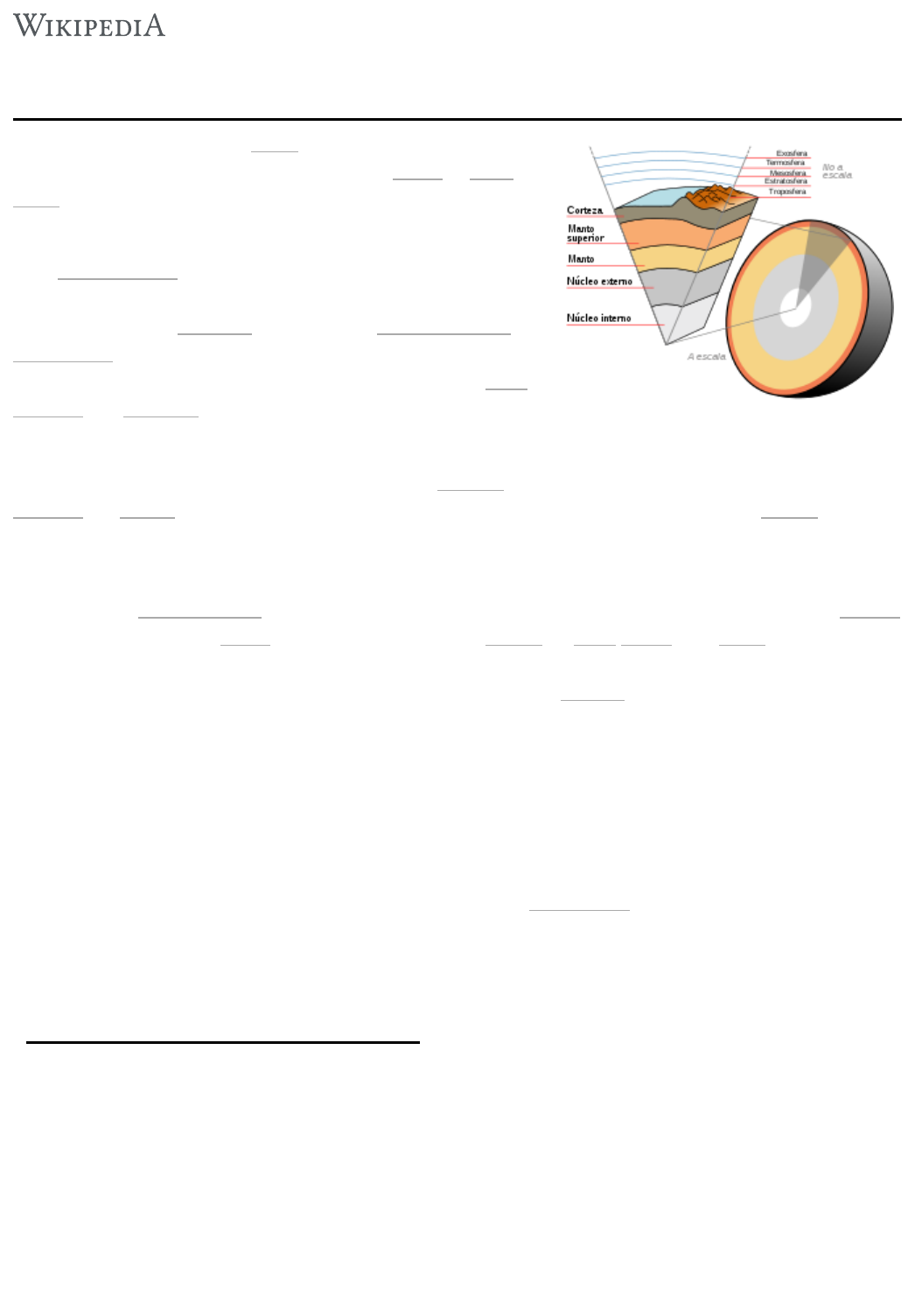 Estructura interna de la Tierra La estructura interna de la Tierra está formada por tres capas concéntricas de diferente composición y dinámica, la corteza, el manto y núcleo, que en conjunto forman la geósfera, también conocida como tierra sólida. En la física aristotélica, la palabra geósfera se aplicaba a cuatro lugares esféricos naturales, anidados concéntricamente alrededor del centro de la Tierra, como describe Aristóteles en sus lecturas Física (Aristóteles) y Meteorológica, donde explica el objeto de la ciencia meteorológica o atmosférica. Se creía que explicaban los movimientos de los cuatro elementos de la antigüedad: tierra, agua, aire y fuego. En los textos modernos y en la ciencia del sistema Tierra, la geósfera se refiere a las partes sólidas de la Tierra; se usa junto con la atmósfera, la hidrósfera y la biósfera para describir los sistemas de la Tierra. En ese contexto, a veces se usa el término litosfera en lugar de geósfera o tierra sólida. La litosfera, sin embargo, solo se refiere a las capas superiores de la Tierra sólida (rocas de la corteza oceánica y continental y el manto superior). Como la de otros planetas terrestres (planetas formados principalmente por material rocoso), está dividida en capas de densidad creciente. La Tierra tiene una corteza externa rocosa compuesta por silicatos, un manto viscoso, y un núcleo subdividido en dos capas, una externa líquida, mucho más fluida que el manto y una interna sólida. Muchas de las rocas que hoy forman parte de la corteza se formaron hace menos de 100 millones de años, durante el periodo Cretácico. Sin embargo, las formaciones rocosas más antiguas conocidas tienen 4400 millones de años, lo que nos indica que el planeta ha tenido una corteza sólida desde entonces. Gran parte de nuestro conocimiento acerca del interior de la Tierra ha sido inferido de otras observaciones. Por ejemplo, la fuerza de la gravedad es una medida de la masa terrestre. Después de conocer el volumen del planeta, se puede calcular su densidad. El cálculo de la masa y volumen de las rocas de la superficie, y de las masas de agua, nos permiten estimar la densidad de la capa externa. La masa que no está en la atmósfera o en la corteza debe encontrarse en las capas internas de la tierra. La fuente más fiable de la estructura interna de la Tierra la proporciona el estudio de las ondas sísmicas, cuya velocidad está en función de los diferentes parámetros físicos y químicos de los materiales que atraviesan. Estructura Capas definidas por su composición Corteza Manto Núcleo Desarrollo histórico y concepciones alternativas Referencias Bibliografía Enlaces externos Corte en sección transversal de las capas que constituyen el planeta Tierra Índice https://es.wikipedia.org/wiki/Tierra https://es.wikipedia.org/wiki/Corteza_terrestre https://es.wikipedia.org/wiki/Manto_terrestre https://es.wikipedia.org/wiki/N%C3%BAcleo_de_la_Tierra https://es.wikipedia.org/wiki/F%C3%ADsica_aristot%C3%A9lica https://es.wikipedia.org/wiki/Arist%C3%B3teles https://es.wikipedia.org/wiki/F%C3%ADsica_(Arist%C3%B3teles) https://es.wikipedia.org/wiki/Historia_de_la_meteorolog%C3%ADa https://es.wikipedia.org/wiki/Los_cuatro_elementos_de_la_Naturaleza https://es.wikipedia.org/wiki/Antig%C3%BCedad_cl%C3%A1sica https://es.wikipedia.org/wiki/Atm%C3%B3sfera_terrestre https://es.wikipedia.org/wiki/Hidr%C3%B3sfera https://es.wikipedia.org/wiki/Bi%C3%B3sfera https://es.wikipedia.org/wiki/Litosfera https://es.wikipedia.org/wiki/Planeta_terrestre https://es.wikipedia.org/wiki/Densidad https://es.wikipedia.org/wiki/Corteza_terrestre https://es.wikipedia.org/wiki/Silicato https://es.wikipedia.org/wiki/Manto_terrestre https://es.wikipedia.org/wiki/Viscosidad https://es.wikipedia.org/wiki/N%C3%BAcleo_de_la_Tierra https://es.wikipedia.org/wiki/Cret%C3%A1cico https://es.wikipedia.org/wiki/Onda_s%C3%ADsmica https://es.wikipedia.org/wiki/Archivo:Earth-crust-cutaway-spanish.svg La estructura de la tierra podría establecerse según dos criterios diferentes. Según su composición química, el planeta puede dividirse en corteza, manto y núcleo (externo e interno); según sus propiedades geológicas se definen la litosfera, la astenosfera, la mesosfera y el núcleo (externo e interno).1 Las capas se encuentran a las siguientes profundidades:2 Capa Profundidad (km) ... Corteza (varía localmente entre 5 y 70 km) 0-35 Litosfera (varía localmente entre 5 y 200 km) 0-100 Astenosfera 100-400 Manto 35-2890 Manto superior 35-660 Manto inferior 660-2890 Núcleo 2890-6371 Núcleo externo 2890-5150 Núcleo interno 5150-6371 La división de la Tierra en capas ha sido determinada indirectamente utilizando el tiempo que tardan en viajar las ondas sísmicas reflejadas y refractadas, creadas por terremotos. Las ondas transversales (S, o secundarias) no pueden atravesar el núcleo, ya que necesitan un material viscoso o elástico para propagarse, mientras que la velocidad de propagación es diferente en las demás capas. Los cambios en dicha velocidad producen una refracción debido a la ley de Snell. Las reflexiones están causadas por un gran incremento en la velocidad sísmica (velocidad de propagación) y son parecidos a la luz reflejada en un espejo. Es la capa más superficial donde habitamos,está formada por roca, la corteza terrestre es una capa comparativamente fina; su grosor oscila entre 11 km en las dorsales oceánicas y 70 km en las grandes cordilleras terrestres como los Andes y el Himalaya.1 Los fondos de las grandes cuencas oceánicas están formados por la corteza oceánica, con un espesor medio de 7 km; está compuesta por rocas máficas (silicatos de hierro y magnesio) con una densidad media de 3,0 g/cm3. Los continentes están formados por la corteza continental, que está compuesta por rocas félsicas (silicatos de sodio, potasio y aluminio), más ligeras, con una densidad media de 2,7 g/cm3. La frontera entre corteza y manto se manifiesta e