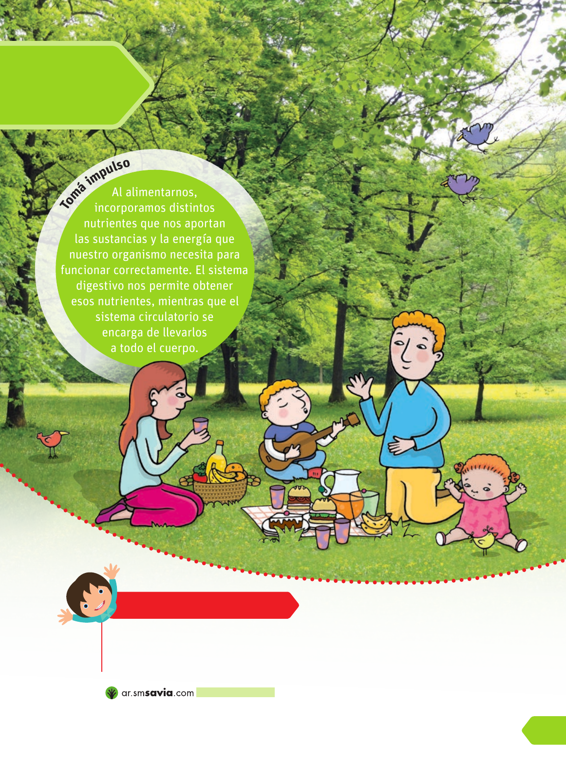 To má im puls o Al alimentarnos, incorporamos distintos nutrientes que nos aportan las sustancias y la energía que nuestro organismo necesita para funcionar correctamente. El sistema digestivo nos permite obtener esos nutrientes, mientras que el sistema circulatorio se encarga de llevarlos a todo el cuerpo. ¡Sabés más de lo que creés! 1. ¿Qué sistemas del cuerpo humano participan en la función de nutrición? 2. ¿Estarías alimentándote correctamente si consumieras lo que ves en la imagen? 3. ¿Las comidas son un buen momento para compartir en familia? ¿Por qué? AMPLIÁ TU MIRADA ¿Cuál es la importancia de la nutrición? Mirá el video y descubrilo. La función de nutrición1 © e di ci on es s m s .a . P ro hi bi da s u fo to co pi a. L ey 1 1. 72 3 9 La organización del cuerpo humano en sistemas Los seres humanos somos organismos complejos, es de- cir que nuestro cuerpo posee todos los niveles de organiza- ción. Así, nuestras células forman tejidos, los tejidos consti- tuyen órganos, y los órganos se agrupan formando sistemas de órganos, cada uno con funciones específicas. Estos siste- mas no se encuentran aislados, se relacionan todo el tiempo entre sí. Si se los distingue es para facilitar el estudio y la comprensión de la estructura del cuerpo humano y de su funcionamiento. Neuronas Tejido nervioso Cerebro Sistema nervioso Las neuronas son células del tejido nervioso que se encuentran en el cerebro y otros órganos. ¿Qué funciones realiza nuestro cuerpo? Nuestro organismo funciona de manera coordinada, es decir que sus diferentes partes se relacionan entre sí y cum- plen distintas funciones: • La función de nutrición, que permite el aprovecha- miento de los nutrientes, es llevada a cabo por los sis- temas digestivo, circulatorio, respiratorio y excretor. • La función de relación y control, por la cual podemos regular lo que sucede en nuestro propio cuerpo y re- lacionarnos con el medio que nos rodea, es realizada por los sistemas nervioso, endocrino, inmune y osteo- artro-muscular. • La función de reproducción es la que hace posible que generemos descendencia. En ella intervienen los sistemas reproductores femenino y masculino. El funcionamiento coordinado de nuestros órganos permite la realización de tareas complejas, como nadar o andar en bicicleta. MI GLOSARIO ¿A qué concepto corresponde esta definición?: “Conjunto de órganos relacionados que cumplen una función común”. © e di ci on es s m s .a . P ro hi bi da s u fo to co pi a. L ey 1 1. 72 3 10 Los sistemas de la nutrición Nuestro cuerpo posee cuatro sistemas de órganos que nos permiten obtener los nutrientes que necesitan las cé- lulas y deshacerse de los desechos que estas producen. Se trata de los sistemas de la nutrición: el digestivo, el respira- torio, el circulatorio y el excretor. Sistema digestivo El sistema digestivo incorpora los alimentos, transformando las sustancias complejas que los componen en sustancias simples, denominadas nutrientes. Estos son absorbidos y pasan a la sangre. Finalmente, se encarga de eliminar los restos de alimentos que no pudieron ser absorbidos. Sistema circulatorio El sistema circulatorio es el encargado de transportar los nutrientes, como el oxígeno, a todas las células del cuerpo. Además, lleva las sustancias de desecho, como el dióxido de carbono, hasta los órganos del sistema excretor. Sistema excretor El sistema excretor permite eliminar del cuerpo las sustancias de desecho generadas por el metabolismo celular. Gran parte sale al exterior en forma de orina, que se produce en los riñones. Otros órganos, como la piel y las glándulas lagrimales, también se encargan de eliminar desechos. Sistema respiratorio El sistema respiratorio incorpora el oxígeno del aire, que es necesario para la obtención de energía por parte de las células del cuerpo. También se encarga de eliminar el dióxido de carbono, un desecho gaseoso resultante del funcionamiento celular. © e di ci on es s m s .a . P ro hi bi da s u fo to co pi a. L ey 1 1. 72 3 11 El sistema digestivo Para comprender el funcionamiento del sistema digestivo podemos dividirlo en dos partes: • El tubo digestivo está formado por una serie de órga- nos huecos, ubicados uno tras otro: la boca, la faringe, el esófago, el estómago, el intestino delgado, el intes- tino grueso, el recto y el ano. Por estos órganos pasan los alimentos, que van siendo digeridos. • Las glándulas anexas son órganos que producen ju- gos digestivos. Estos jugos son volcados en el tubo di- gestivo, donde facilitan la digestión de los alimentos. Las glándulas salivales, el hígado y el páncreas son glándulas anexas. Hígado. Produce una sustancia llamada bilis, que facilita la digestión de las grasas y los aceites. La bilis se almacena en la vesícula biliar y se vuelca en el intestino delgado. Vesícula biliar. Acumula la bilis fabricada por el hígado. Estructura del sistema digestivo MEJORÁ TU MUNDO Más del 7% de los niños de Latinoamérica tienen sobrepeso debido a una dieta inadecuada y a la falta de actividad física. ¿Por qué alimentos saludables podrían reemplazar a las golosinas? Boca. Los dientes cortan y trituran los alimentos, mientras que la lengua los mezcla con la saliva. Aquí se inicia la digestión de los azúcares complejos y se forma el bolo alimenticio. Faringe. Conduce el bolo alimenticio desde la boca al esófago. La faringe también está conectada con la laringe, un órgano del sistema respiratorio. Esófago. Transporta el bolo alimenticio desde la faringe hasta el estómago. Estómago. Fabrica jugo gástrico, que inicia la digestión de las proteínas, las grasas y los aceites de los alimentos. Intestino delgado. Continúa con la digestión de las sustancias complejas presentes en los alimentos. Los nutrientes obtenidos se absorben y pasan al sistema circulatorio. Intestino grueso. Envía a la sangre el agua y las sales presentes en los alimentos. A parti