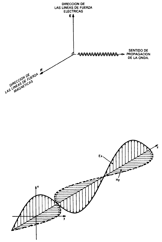 1 Capítulo 1.- PROPAGACIÓN 1.1.- ONDAS ELECTROMAGNÉTICAS Una onda electromagnética es producida por la existencia de un campo eléctrico y otro magnético perpendiculares entre si y variables en el tiempo. Las ondas electromagnéticas se desplazan a la velocidad de las luz (3.108 m/s), en la dirección perpendicular al plano formado por ambos campos. Un campo es una región del espacio en la que se manifiesta la acción de determinadas fuerzas: eléctricas, en un campo eléctrico, y magnéticas, en uno magnético. Si consideramos que la variación de dichos campos es senoidal, en el sistema de ejes cartesianos (x,y,z), el campo eléctrico Ex varía de forma senoidal en el plano x,z, el campo magnético Hy varía de igual forma en el plano y,z, y la onda se desplaza en la dirección del eje z. 2 Los campos eléctrico y magnético se anulan en ciertos momentos y son máximos en otros; cuando una onda se propaga por el espacio, los campos eléctrico y magnético se desplazan en el sentido del eje z, formando un plano que se denomina frente de ondas. 1.2.- PROPIEDADES ÓPTICAS DE UNA ONDA ELECTROMAGNÉTICA Una onda electromagnética se propaga en línea recta en el seno de un medio homogéneo; su velocidad de propagación en el vacío es de 3.108 m/s, por tanto en un medio cualquiera diferente que tenga un índice de refracción n se propagará a la velocidad de: (m/s)v c n = En la atmósfera terrestre n es muy próximo a la unidad y podemos afirmar que la velocidad de propagación de una onda es constante e igual a c. La propagación de una onda electromagnética puede verse sometida a efectos de reflexión, refracción y difracción, cumpliendo en estos casos las leyes generales de la óptica. Existe reflexión cuando una onda incide sobre una superficie metálica, el suelo o cualquier tipo de obstáculo. En este caso, se cumple que el ángulo de incidencia de la onda con la normal a la superficie reflectora, es igual al ángulo de reflexión de la onda con la normal. Existirá refracción cuando la onda pase de un medio a otro que tenga un índice de refracción de valor parecido al primero. Así, la onda electromagnética se refractará cuando ésta pase del aire al agua o atraviese diferentes capas atmosféricas que tengan distinto grado de humedad. Siempre que exista una refracción de la onda electromagnética, tendremos una reflexión de energía sobre la superficie de separación, por lo cual, la energía de la onda refractada será menor que la de la incidente. 3 La ley de Snell rige los fenómenos de refracción. Esta establece que la relación entre los senos de los ángulos de incidencia y refracción es igual a la relación inversa de los índices de refracción de ambos medios. sen i sen i n n′ = 2 1 Por lo tanto el ángulo de refracción es inferior al de incidencia cuando se pasa de un medio con un índice de refracción menor a otro de índice mayor. Por ejemplo cuando una onda procedente del aire (n = 1) penetra en el agua (n = 1,33) Cuando n1 es mayor que n2, el ángulo de refracción es superior al de incidencia, por tanto existirá un ángulo límite de incidencia, para el cual la refracción será paralela a la superficie de separación de ambos medios. Cuando el ángulo de incidencia sea mayor que este ángulo límite, ya no existirá el fenómeno de refracción, sino que tendremos una reflexión total. 4 En figura anterior se presentan varios casos posibles de refracción y reflexión en función del ángulo de incidencia. & onda incidente perpendicular a la superficie de separación (a) & onda incidente cuyo ángulo de incidencia es: inferior al ángulo límite (b) igual al ángulo límite (c) superior al ángulo límite (d) Por ejemplo, para el caso de una onda incidente pasa del agua al aire, el valor del ángulo límite será: sen i sen c 90 1 1 33 0 75= = , , sen ic = 0 75, Por tanto, el valor del ángulo límite será de ic = 48º Existirá difracción cuando un frente de onda incida sobre un obstáculo en el que exista un pequeño orificio. Podríamos esperar que la onda que atravesara el orificio continuase en línea recta, pero de hecho la onda se dispersa en todas las direcciones como se muestra en la siguiente figura. Huygens explicó el fenómeno de difracción deduciendo que cada punto de una onda electromagnética podía ser considerado como una fuente de ondas que se propagaban en todas direcciones; que un frente de ondas se desplace en una sola dirección, se debe a que todas las fuentes secundarias se anulan entre sí, excepto en la dirección de la onda determinada por la fuente original. Otro fenómeno asociado con los fenómenos ondulatorios, es la interferencia que se produce cuando dos fuentes idénticas radian en un determinado entorno. Debido a la variación senoidal de los campos eléctrico y magnético, la suma resultante de dos ondas puede ser mayor, menor e incluso nula, dependiendo de la fase con que dicha suma se produzca. De aquí que podemos tener zonas donde la onda pueda desaparecer y otras en las cuales su valor se vea reforzado. La 5 existencia de estas zonas o franjas tendrá su importancia en la propagación de las ondas de alta frecuencia. 1.3.- CARACTERÍSTICAS DE UNA ONDA ELECTROMAGNÉTICA Una onda electromagnética se caracteriza por su potencia, su polarización y su frecuencia. a) Potencia de radiación: Una onda electromagnética es una forma de energía, energía de radiación, que será mayor cuanto mayores sean las intensidades de los campos eléctrico y magnético. Es normal hablar de dos conceptos, potencia radiada por una fuente y densidad de potencia existente alrededor de la misma. b) Polarización de una onda: Las ondas electromagnéticas están polarizadas de forma que al propagarse las oscilaciones de los campos eléctrico y magnéticos , se mantienen en un plano determinado para cada uno. La polarización viene dada por la posición del plano de variación del campo eléctrico. Algunas transmisiones se pr
