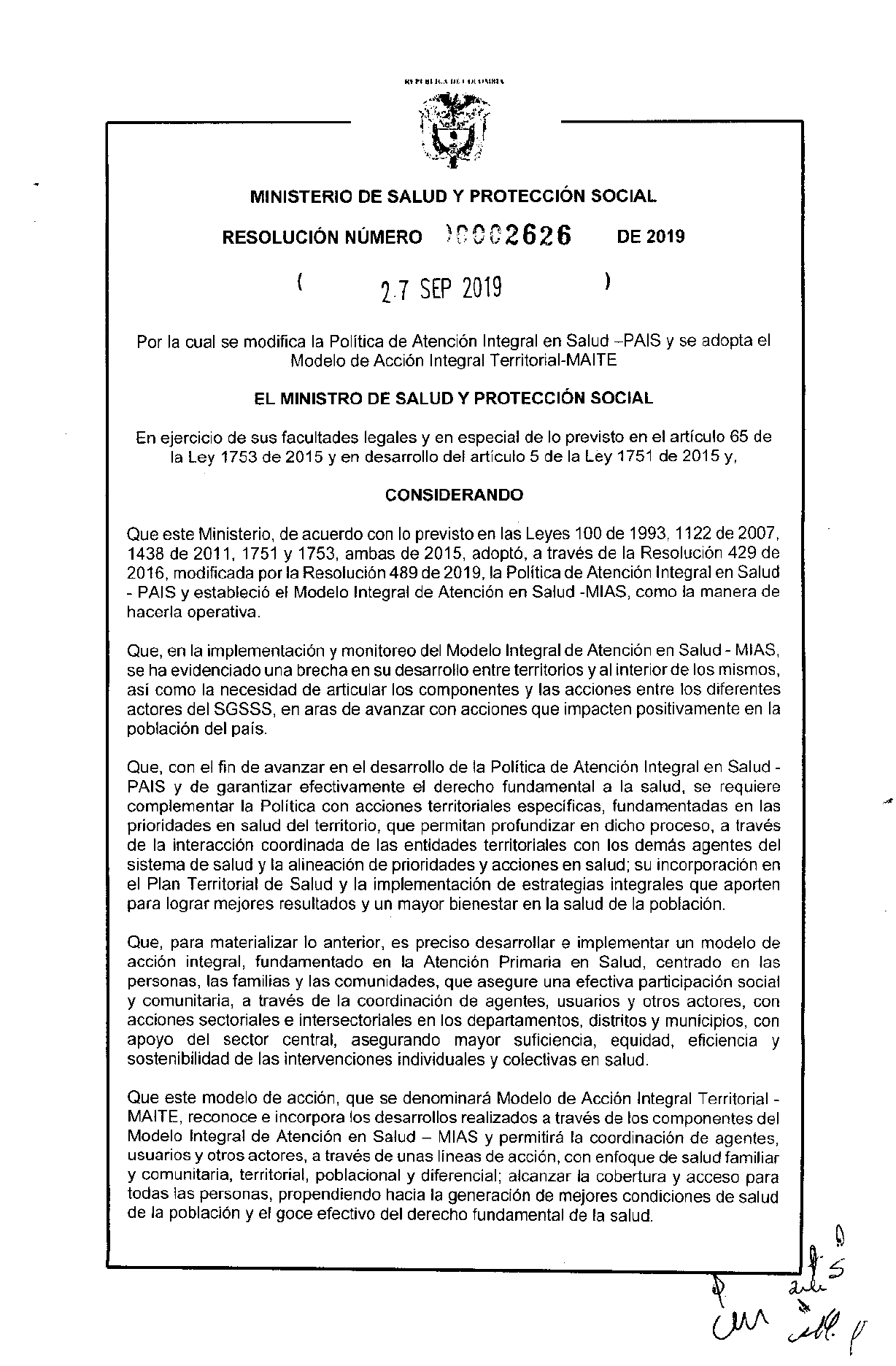 Resolución No 2626 de 2019