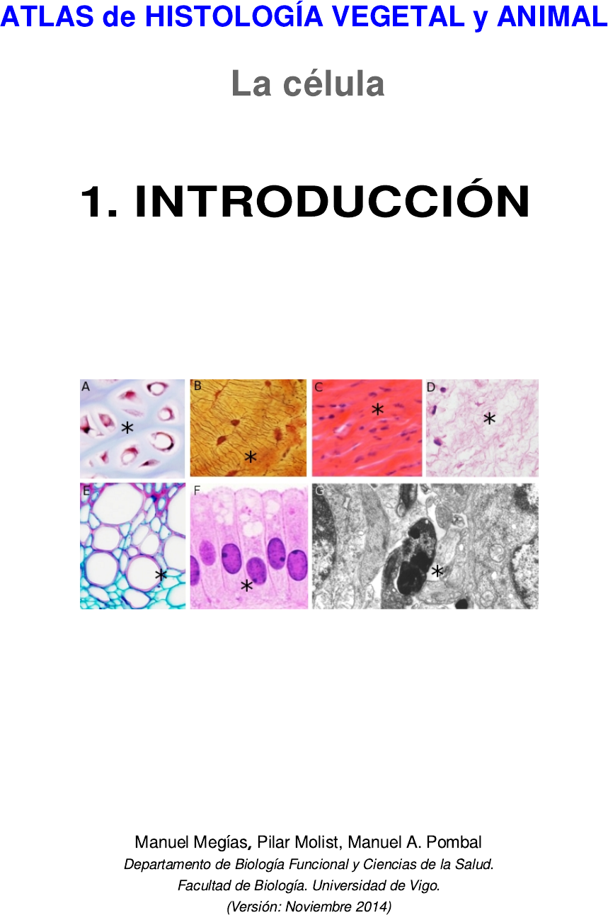 ATLAS de HISTOLOGÍA VEGETAL y ANIMAL La célula 1 . INTRODUCCIÓN Manuel Megías, Pilar Molist, Manuel A. Pombal Departamento de Biología Funcional yCiencias de la Salud. Facultadde Biología. Universidadde Vigo. (Versión: Noviembre 2014) Este documento es una edición en pdf del sitio http://webs.uvigo.es/mmegias/inicio.html y ha sido creado con el programa Scribus (http://www.scribus.net/canvas/Scribus) Todo el contenido de este documento se distribuye bajo la licencia Creative Commons del tipo BY-NC-SA (Esta licencia permite modificar, ampliar, distribuir y usar sin restricción siempre que no se use para fines comerciales, que el resultado tenga la misma licencia y que se nombre a los autores). 1. Introducción ................................. 4 2. Diversidad celular ......................... 6 3. Descubrimiento ............................ 8 4. Teoría celular .............................. 12 5. Origen de la célula ....................... 13 6. Endosimbiosis ............................. 18 ÍNDICE Esta parte del atlas está dedicada a la citología (más comúnmente denominada biología celular), y en ella vamos a estudiar la organización de la célula. Pero, ¿A qué llamamos célula? La siguiente es una buena definición: una célula es la unidad anatómica y funcional de los seres vivos. Las células pueden aparecer aisladas o agrupadas formando organismos pluricelulares. En ambos casos la célula es la estructura más simple a la que consideramos viva. Hoy se reconocen tres linajes celulares presentes en la Tierra: las arqueas y las bacterias, que son procariotas unicelulares, y las células eucariotas, que pueden ser unicelulares o formar organismos pluricelulares. Las procariotas (anterior al núcleo) no poseen compartimentos internos rodeados por membranas, salvo excepciones, mientras que las eucariotas (núcleo verdadero) contienen orgánulos membranosos internos. Uno de los compartimentos membranosos de las eucariotas es el núcleo. Toda célula, procariota o eucariota, es un conjunto de moléculas altamente organizado. De hecho, posee numerosos compartimentos con funciones definidas. Vamos a considerar a un compartimento celular como un espacio, delimitado o no por membranas, donde se lleva a cabo una actividad necesaria o importante para la célula. Uno de los compartimentos presentes en todas las células es la membrana plasmática o plasmalema, que engloba a todos los demás compartimentos celulares y permite delimitar el espacio celular interno del externo. La célula eucariota posee compartimentos internos delimitados por membranas. Entre éstos se encuentra el núcleo, delimitado por una doble unidad de membrana, en cuyo interior se encuentra el material genético o ADN que contiene la información necesaria para que la célula pueda llevar a cabo las tareas que permiten su supervivencia y reproducción. Entre el núcleo y la membrana plasmática se encuentra el citosol, un gel acuoso que contiene numerosas moléculas que intervienen en funciones estructurales, metabólicas, en la homeostasis, en la señalización, etcétera. Cabe destacar a los ribosomas en la producción de proteínas, al citoesqueleto para la organización interna de la célula y para su movilidad, a numerosos enzimas y cofactores para el metabolismo y a muchas otras moléculas más. Entre la membrana celular y el núcleo se encuentran también los orgánulos, que son compartimentos rodeados por membrana que llevan a cabo funciones como la digestión, respiración, fotosíntesis, metabolismo, transporte intracelular, secreción, producción de energía, almacenamiento, etcétera. Las mitocondrias, los cloroplastos, los peroxisomas, los lisosomas, el retículo endoplasmático, o las vacuolas, entre otros, son orgánulos. El citoplasma es el citosol más el conjunto de orgánulos. En las siguientes páginas vamos a hacer un recorrido por el interior de la célula eucariota, pero también por sus alrededores. Algunos aspectos del funcionamiento celular no los podremos tratar con tanta profundidad como nos gustaría, como por ejemplo la expresión génica o el metabolismo celular. Ambos, por sí solos, necesitan un espacio enorme que desvirtuaría la idea que queremos dar de la célula. Existen multitud de sitios en Internet especializados en estos aspectos. Los distintos elementos que vamos a "visitar" y el orden en el que lo haremos están indicados en el panel lateral izquierdo. 1. Introducción 4 Esquema de los principales componentes de una célula animal. Esquema de los principales componentes de una célula vegetal. 5 Las células son variables en forma y función. Esto fue una de las causas que hizo difícil llegar a la conclusión de que todos los organismos vivos están formados por unidades variables, pero con una estructura básica común, denominadas células. La otra gran dificultad fue su tamaño diminuto. Tamaño celular El tamaño de las células se expresa en micrómetros (µm). Un micrómetro o micra es la milésima parte de un milímetro (10-3 milímetros), es decir, la millonésima parte de un metro (10-6 metros). Una célula eucariota típica mide entre 10 y 30 µm. Esto es cierto para las células que forman parte de un gusano y para las que componen un elefante. La diferencia es que en el elefante hay más células. Para hacerse una idea de lo pequeñas que son las células imaginemos que estiramos a una persona que mide 1,70 metros hasta la altura del Everest, que mide unos 8500 metros. Las células estiradas de este gigante medirían 1,3 centímetros, más pequeñas que una moneda de un céntimo de euro (sería un gigante formado por monedas de céntimo de euro). Pero hay células eucariotas que se escapan de las dimensiones más comunes y pueden ser muy pequeñas, como los espermatozoides, cuya cabeza puede medir menos de 4 µm de diámetro, mientras que otras como los huevos de algunas aves o reptiles pueden medir más de 10 centímetros (decenas de miles de µm) en