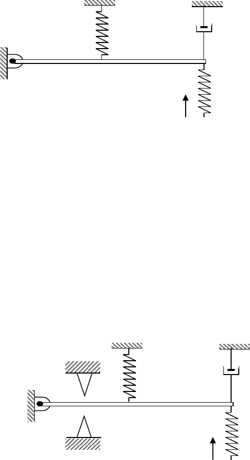 EXAMEN PARCIAL 2 CARNET APELLIDO NOMBRE Vibraciones Mecánicas Feb 2015 jl Ejercicio único> En la figura se muestra una barra hom ogénea de masa m y longitud 2 L, que se mantiene en equilibrio en una posición horizontal, gracias a un resorte de constante k , dispuesto verticalmente y conectado a la barra en su punto medio M. Un amortiguador lineal de constante c, eje vertical, conectado al extremo B de la barra Una vez realizado el montaje, se conecta un segundo resorte al extremo B, también de constante k y eje vertical, pero su extremo inferior se desplaza siguiendo una ley armónica z(t) = Z sen t conocida, con z orientada hacia arriba.(Z y son parámetros conocidos) 1. Escriba la ecuación diferencial que rige las oscilaciones pequeñas de la barra a partir de la posición de equilibrio Presente sus resultados en forma literal. Sea preciso en su diagrama de cuerpo libre. VALOR 1 PTS 2. Suponga ahora que se proporcional los valores numéricos de los parámetros involucrados en el análisis m = 100 kg k = 100 N/m c = 12,91 N.s/m L = 1 m Z = 5 cm = 30 rad/s Calcule la amplitud de la respuesta en régimen permanente de la barra. VALOR 2 PTS. Exprese su resultado en términos de la rotación angular de la barra. (Sea preciso en las unidades utilizadas) 3. Determine el valor máximo de la fuerza transmitida a la fundación por el resorte que concurre al punto medio de la barra, cuando la barra se encuentra en régimen permanente. VALOR 2 PTS 4. Considere que en la sección media del tramo AM existe un tope T, tal como sugiere la figura adjunta. Se desea determinar el juego mínimo existente entre la barra y el tope, a fin de evitar la interferencia entre la barra y el tope cuando el sistema se encuentra en régimen permanente Sea preciso al indicar su resultado, especialmente lo concerniente a la correcta interpretación de la magnitud evaluada VALOR 2 PTS A B k c L L M z =z(t) A A B k c M z =z(t) T T A EXAMEN PARCIAL 2 CARNET APELLIDO NOMBRE Vibraciones Mecánicas Feb 2015 jl Ejercicio En la figura se muestra una barra homogénea de masa m y longitud 2 L, que se mantiene en equilibrio en una posición horizontal, gracias a un resorte de constante k , dispuesto verticalmente y conectado a la barra en su punto medio M. Un amortiguador lineal de constante c, eje vertical, conectado al extremo B de la barra Una vez realizado el montaje, se conecta un segundo resorte al extremo B, también de constante k y eje vertical, pero su extremo inferior se desplaza siguiendo una ley armónica z(t) = Z sen t conocida, con z orientada hacia arriba.(Z y son parámetros conocidos) 1. Escriba la ecuación diferencial que rige las oscilaciones pequeñas de la barra a partir de la posición de equilibrio Presente sus resultados en forma literal. Sea preciso en su diagrama de cuerpo libre. VALOR 1,5 PTS 2. Suponga ahora que se proporcionan los valores numéricos de los parámetros involucrados en el análisis m = 100 kg k = 100 N/m c = 12,91 N.s/m L = 1 m Z = 5 cm = 30 rad/s Calcule la amplitud de la respuesta en régimen permanente de la barra. VALOR 1,5 PTS. Exprese su resultado en términos de la rotación angular de la barra. (Sea preciso en las unidades utilizadas) 3. Determine el valor máximo de la fuerza transmitida a la fundación por el resorte que concurre al punto medio de la barra, cuando la barra se encuentra en régimen permanente. VALOR 2 PTS 4. Considere que en la sección media del tramo AM existe un tope T, tal como sugiere la figura adjunta. Se desea determinar el juego mínimo existente entre la barra y el tope, a fin de evitar la interferencia ellos cuando el sistema se encuentra en régimen permanente Sea preciso al indicar su resultado, especialmente lo concerniente a la correcta interpretación de la magnitud evaluada VALOR 2 PTS 5. Suponga ahora que el extremo libre del resorte suspendido en B, experimenta un desplazamiento súbito de 5 cm, durante un corto intervalo de tiempo estimado en 1 (seg), tal como sugiere la figura. Bajo estas circunstancias se desea evaluar cual debe ser el valor mínimo del juego existente entre barra y tope a fin de evitar su interferencia Para responder esta figura se indica que analice el ejercicio suponiendo despreciable el efecto de la amortiguación. Su resultado debe contener el valor del juego mínimo calculado y las razones que fundamentan la hipótesis de despreciar el efecto del amortiguador VALOR 3 PTS. A B k c L L M z =z(t) A A B k c M z =z(t) T T A t 5 (cm) z