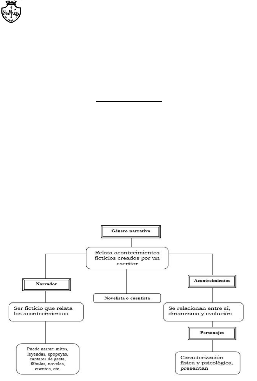 Colegio Santa María De La Florida Depto. de Lenguaje y Comunicación Prof. Patricia Quintrequeo Zavala Guía N° 5 de lengua y literatura séptimo básico NOMBRE: _________________________________________ CURSO 7°:________ CONTENIDO: Elementos del género narrativo. OBJETIVO: Analizar aspectos relevantes de las narraciones leídas para profundizar su comprensión. Género narrativo Corresponde a la narración o relato de acontecimientos ficticios, generalmente por medio de la prosa. Estos sucesos se relacionan entre sí, girando en torno a un tema central que se desarrolla a lo largo del texto. En este sentido, el autor nos relata hechos ocurridos en un espacio y tiempo determinados, por medio de la voz de un narrador ficticio. A este género pertenecen las novelas, cuentos, fábulas, mitos, leyendas, etc. El género narrativo presenta las siguientes características: Presencia de un narrador Relación de los acontecimientos ubicados en una espacio y tiempo determinados Presencia de personajes caracterizados física y psicológicamente Dinamismo (evolución de los hechos y los personajes a lo largo de la historia) Dentro de los elementos del género narrativo tenemos los siguientes: Narrador Personajes Tiempo Espacio A. Personajes Los personajes corresponden a seres ficticios que están presentes en el mundo de la narración literaria. Son ellos quienes mueven la acción. Se presentan, existiendo en un espacio físico y están condicionados por su entorno, las causas que los motivan a actuar son sus motivaciones y deseos. Los personajes pueden ser clasificados desde distintos puntos de vista, a continuación te presentamos la clasificación más recurrente. Tipos de personajes Según su importancia en el relato Personaje principal: el o los personajes principales se destacan con respecto a los demás porque funcionan como integradores de la organización de los acontecimientos, por lo tanto, son los más importantes de la acción. Los personajes principales pueden clasificarse en protagonistas y antagonistas. El protagonista es el que busca un buen objetivo, el antagonista se opone a este logro positivo Secundarios: son aquellos que, sin tener un rol demasiado importante en el desarrollo de los acontecimientos, proporcionan un grado mayor de coherencia, comprensión y consistencia a la narración. Por lo general, estos personajes están vinculados a los principales, pero su participación también es individual y complementaria a la de los personajes principales. Incidentales o esporádicos: son personajes que no tienen una presencia permanente en los hechos. Su participación es un recurso para ordenar, exponer, relacionar y también retardar el desarrollo de los acontecimientos. Según su desarrollo en los acontecimientos Planos: presentan solo un rasgo destacado. Se les reconoce por una sola cualidad, no presentan más que un aspecto de su existencia. Redondos, esféricos o en relieve: presentan más de una característica. Son capaces de mostrar en forma repentina aspectos de su personalidad que estaban ocultos. Son personajes a veces contradictorios. Según su relación con la acción en el relato Estáticos: se comportan de la misma manera en todo el relato. No evolucionan ni sufren cambios en su conducta ni características personales. Los datos que se obtienen de ellos no sufren alteraciones. Dinámicos o evolutivos: a través de la acción del relato varían su forma de ser. Comienzan siendo individuos de ciertos rasgos y conductas y, a medida que la acción transcurre, modifican su comportamiento, llegando en algunos casos a ser totalmente distintos. Clasificación de personajes Punto de vista de su importancia en el relato Punto de vista de su desarrollo en los acontecimientos Punto de vista de su relación con la acción Principal Secundario Incidental Plano Redondo, dinámico o en relieve Estático Dinámico o evolutivo Elementos del género narrativo Realice las siguientes actividades 1. Complete el siguiente esquema De acuerdo a su importancia a lo largo del relato los personajes se pueden clasificar en: Lee el siguiente texto y luego responde las preguntas. –No perdamos la perspectiva, yo ya estoy harta de decirlo, es lo único importante. Doña Rosa va y viene por entre las mesas del café, tropezando a los clientes con su tremendo trasero. Doña Rosa dice con frecuencia "leñe" y "nos ha merengao". Para doña Rosa, el mundo es su Café, y alrededor de su Café, todo lo demás. Hay quien dice que a doña Rosa le brillan los ojillos cuando viene la primavera y las muchachas empiezan a andar de manga corta. Yo creo que todo eso son habladurías: doña Rosa no hubiera soltado jamás un buen amadeo de plata por nada de este mundo. Ni con primavera ni sin ella. A doña Rosa lo que le gusta es arrastrar sus arrobas, sin más ni más, por entre las mesas. Fuma tabaco de noventa, cuando está a solas, y bebe ojén, buenas copas de ojén, desde que se levanta hasta que se acuesta. Después tose y sonríe. Cuando está de buenas, se sienta en la cocina, en una banqueta baja, y lee novelas y folletines, cuanto más sangrientos, mejor: todo alimenta. Entonces le gasta bromas a la gente y les cuenta el crimen de la calle de bordadores o el del expreso de Andalucía. –El padre de Navarrete, que era amigo del general don Miguel Primo de Rivera, lo fue a ver, se plantó de rodillas y le dijo: “Mi general, indulte usted a mi hijo, por amor de Dios”; y don Miguel, aunque tenía un corazón de oro, le respondió: “Me es imposible, amigo Navarrete; su hijo tiene que expiar sus culpas en el garrote”. –“¡Qué tíos! –piensa–, ¡hay que tener riñones!”Doña Rosa tiene la cara llena de manchas, parece que está siempre mudando la piel como un lagarto. Cuando está pensativa, se distrae y se saca virutas de la cara, largas a veces como tiras de serpentinas. Después vuelve a la realidad y se pasea otra vez, para arriba y para abajo, sonriendo a los clientes, a los que o