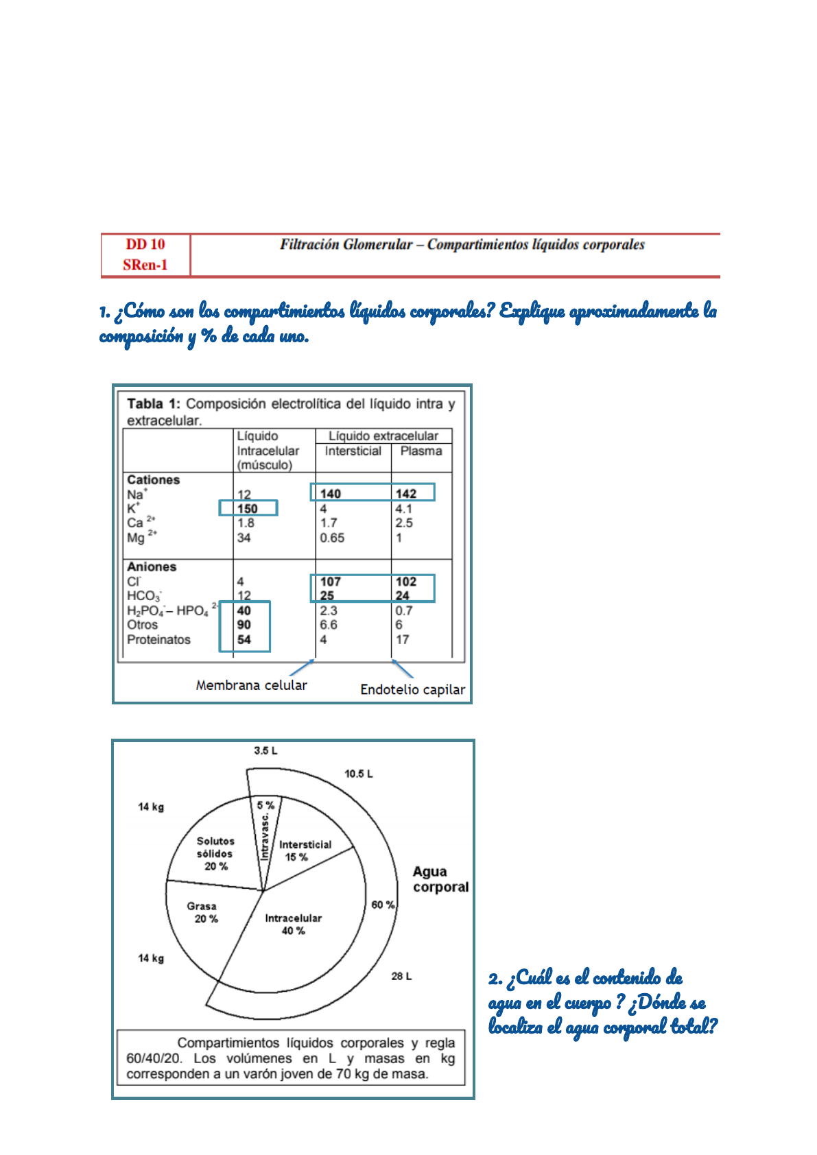 SI���M� RE��� I CU����ON���O D� 1. ¿Cóm� so� l�� compa�timient�� líquid�� corporale�? Expliqu� apr�ximadament� l� comp�sició� � % d� cad� un�. Agustin ● INTRACELULAR (LIC): es el agua dentro de las células. De manera aproximada, el⅔ del agua se encuentra dentro de las células, equivalente a 28L. Se compone a partir de una disolución de potasio, fósforo y proteinatos. ● EXTRACELULAR (LEC): corresponde al ⅓ restante, 14L. Constituido además por el líquido intersticial y plasmático (3,5L), y en menor cantidad por líquidos transcelulares como el LCR y el humor acuoso. Es una composición de una disolución de NaCl. →Sus porcentajes se basan en la regla “60/40/20”: 60 % de la masa corporal corresponde al agua total, el 40 % al agua intracelular y el 20 % al extracelular. 2. ¿Cuá� e� e� contenid� d� agu� e� e� cuerp� ? ¿Dónd� s� localiz� e� agu� corpora� tota�? ¿Cóm� s� prorrate� entr� e� líquid� extracelula� � intracelula�? El agua corporal representa el 60% del peso corporal en los hombres adultos y en las mujeres varía de 50 a 55%. En un adulto obeso este porcentaje disminuye entorno al 45-55%, en adultos delgados es de 50% a 60%. En el niño tiene 65 a 80% y el prematuro llega hasta el 90% de su peso corporal. El agua corporal total se encuentra en el líquido intracelular y en el líquido extracelular. En los fluidos del cuerpo 2/3 son parte del LIC y 1/3 parte es el LEC. 3. ¿Cuále� so� l�� mecanism�� d� manej� d� N� � K � nive� rena�? Expliqu� qu� consecuencia� pued� tene� l� hiperpotasemi� e� e� pacient� � e� mecanism� po� e� cua� s� produc�. Sodio: - Reabsorción de Na+ en el túbulo proximal: El Na+ ingresa a las células por dos tipos de mecanismos. ● El primero es por intercambio con protones (antiporte Na+/H+): mediado por el intercambiador NHE3, es el responsable principal de la concentración de bicarbonato filtrado. Los H+ que se intercambian provienen de la formación de bicarbonato y H+ a partir de CO2 y H2O, catalizada por la anhidrasa carbónica del citosol de las células del túbulo proximal. El H+ secretado reacciona con HCO3 del fluido tubular, formando CO2 y H2O. Esta reacción es catalizada por una anhidrasa carbónica extracelular, presente en el ribete en cepillo. El CO2 producido puede difundir a la célula y ser empleado para regenerar bicarbonato. El Na+ incorporado por membrana apical y el bicarbonato formado en la célula salen por la membrana basolateral mediante otro sistema de cotransporte (kNCB1). ● El segundo es por cotransporte (simporte): ingresa con compuestos orgánicos como la glucosa, aminoácidos y lactato e inorgánicos como fosfato y sulfato. -Reabsorción de Na+ a nivel de la porción final del túbulo proximal: La reabsorción de Na+ es favorecida por la diferencia de concentración de Cl- a nivel de la cápsula de bowman y en la parte final del túbulo proximal, lo cual incrementa el egreso de Cl- hacia el intersticio por vía paracelular, creando un potencial positivo para el ingreso de Na+. -Asa de Henle: en la porción descendente delgada (se encarga de reabsorber agua) ,ascendente delgada se encarga de la (reabsorción masiva de cloruro de sodio ) y ascendente grueso (absorbe el 25% de este filtrado glomerular de sodio). La mayor parte de los solutos se reabsorben en la porción gruesa donde el transportador más importante es el simporte Na, K, 2Cl conocido como NKCC2, los iones se unen al mismo en una secuencia precisa (primero Na+, luego un Cl-, y en tercer lugar un K+ y por último otro Cl-) y el NKCC2 los va a llevar a la luz intersticial por lo tanto al capilar , a través de la bomba Na-K ATPasa o por otros canales del sistema del cloro. Lo que también es característico en el asa es que al tener células con un gradiente eléctrico muy grande va hacer que se facilite el pasaje directo de sodio, potasio y calcio. -Túbulo contorneado distal inicial y final: el transportador es un simporte llamado cotransporte de NaCl sensible a las tiazidas o TSC se encarga de reabsorber de 5% del NaCl filtrado más que nada a nivel glomerular y lo incorpora con la energía del gradiente electroquímico favorable, de esta manera ingresa sodio junto con cloro porque es un puente fuerte (Na+ con anión) y lo que va hacer que sodio va salir por la bomba Na-k ATPasa y el cloro lo va hacer por otro canal específico. En la parte distal la tasa de reabsorción de Ca+ es inversamente proporcional a la reabsorción neta de NaCl. -Con respecto con el túbulo colector: la última porción está formado por células principales (pueden reabsorber Na+ y H2O) y por células intercaladas (secretan H+, amoniaco o bicarbonato, determinan la acidez final de la orina producida), principalmente lo que es la células principales hay canales que son llamados epiteliales de Na+ en donde cada vez que se producen la absorción de sodio esta porción del túbulo se produce la secreción de potasio y está regulado hormonalmente por la hormona antidiurética (vasopresina). Y los mecanismos reguladores se van a basar más que nada en la regulación de la cantidad de sodio ingerido y las relaciones y los cambios de la antidiuresis y antinatriuresis. Uno de los mecanismo reguladores es el volumen de filtrado glomerular: este mecanismo más que nada la que cualquier cambio de la ingesta de sodio va hacer que se cambie el filtrado glomerular porque va a ser más que nada sodio va aumentar el volumen plasmático y por lo tanto va aumentar el filtrado glomerular pero hay tener en cuenta no es que aumentando el sodio va a terminar directamente aumentando el filtrado glomerular porque hay otros mecanismos compensadores. El segundo mecanismo regulador del manejo de sodio es el nervioso simpático .Actúa a nivel del riñón en situación de estrés en donde se va a 